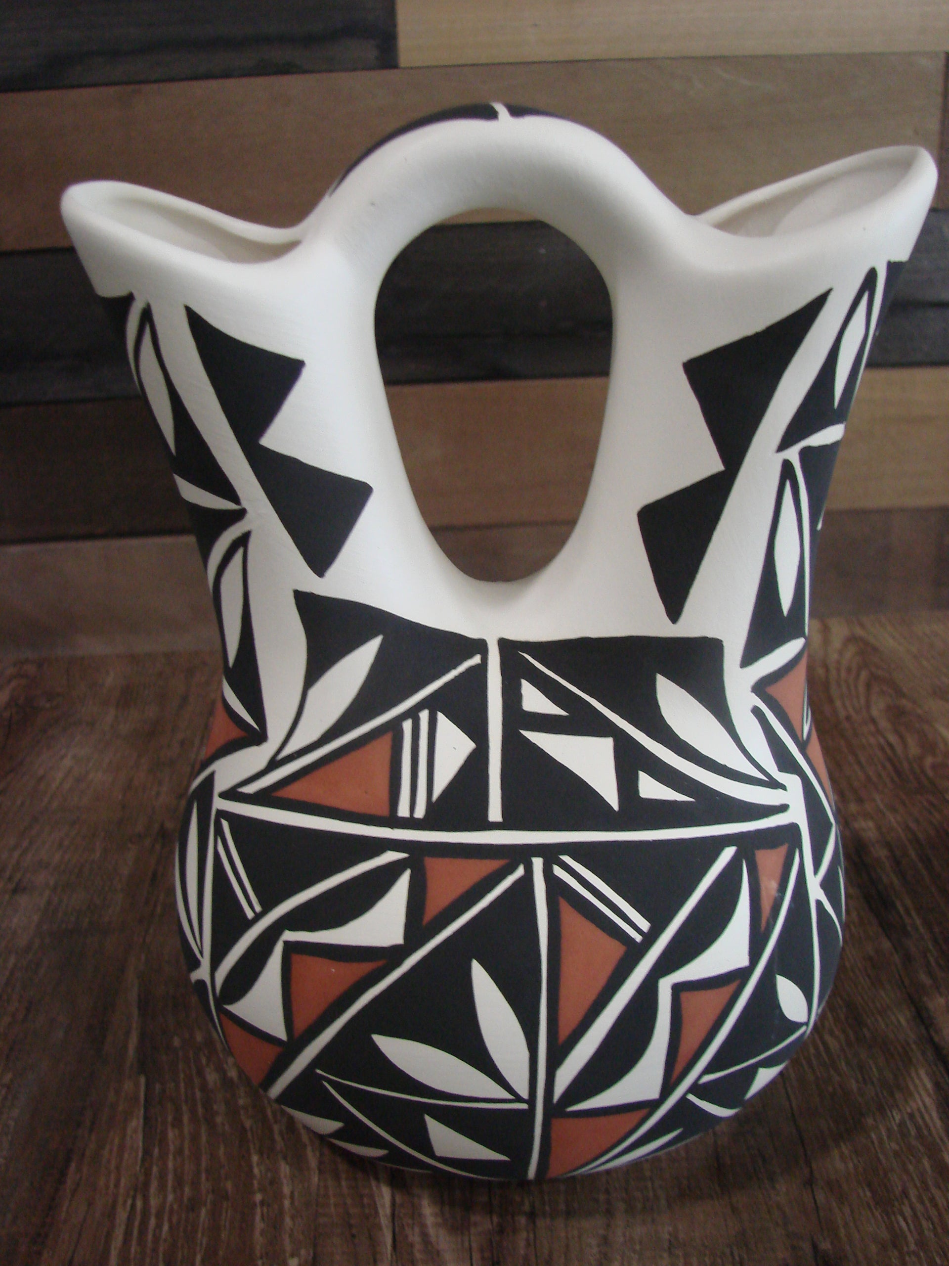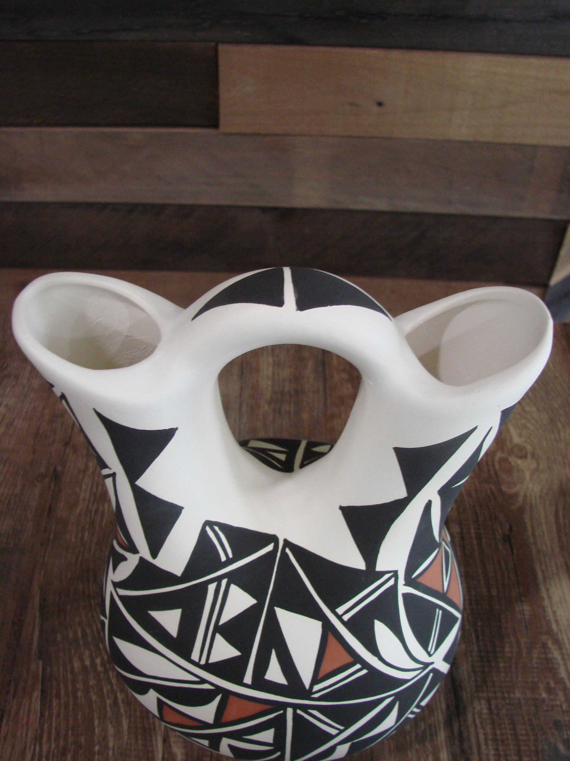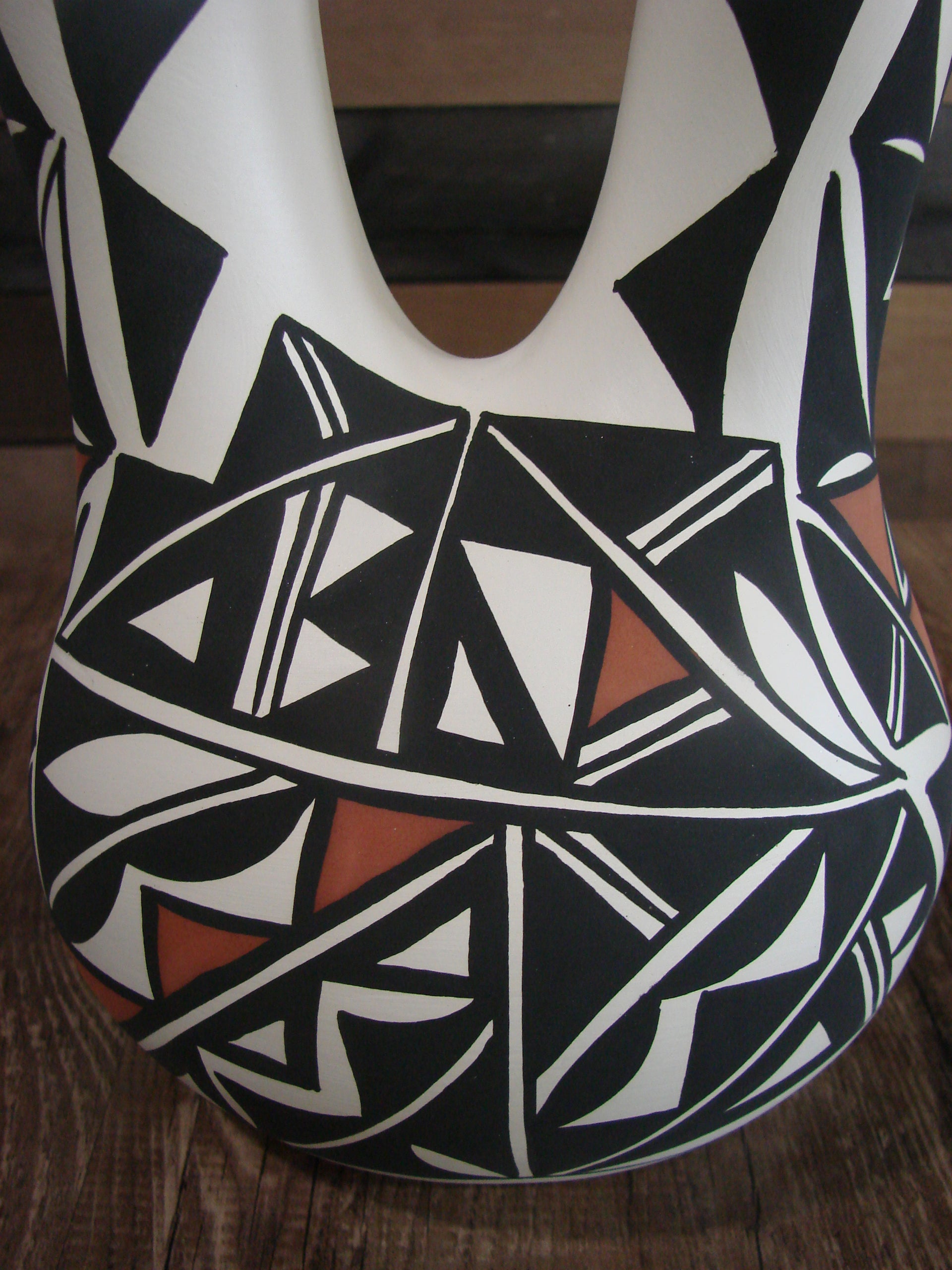 Genuine Native American Acoma Pueblo Indian Hand Painted Fine Line Wedding Vase Pottery from Western New Mexico. This piece of pottery features Stunning natural pigment hand painted patterns throughout. The detail is exquisite! Hand painted by Acoma artist L. Concho. The bottom is signed. Free Shipping included!