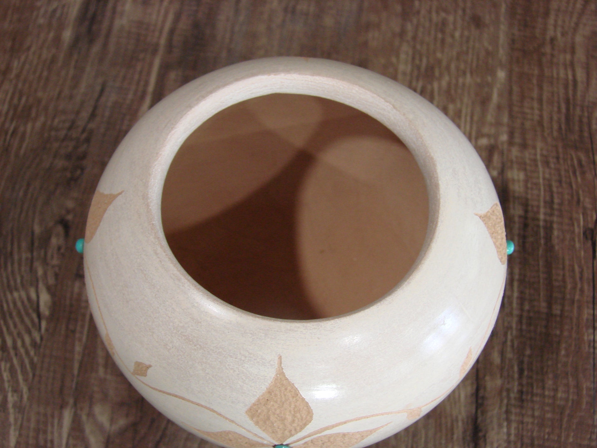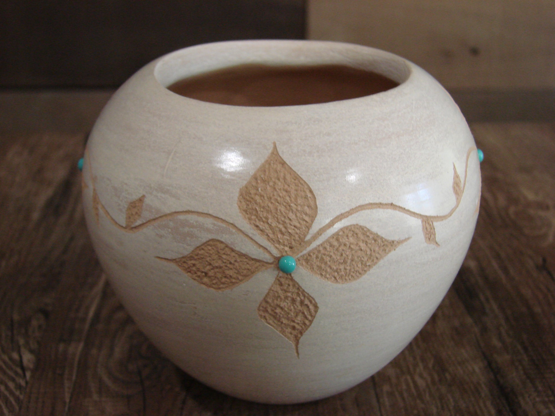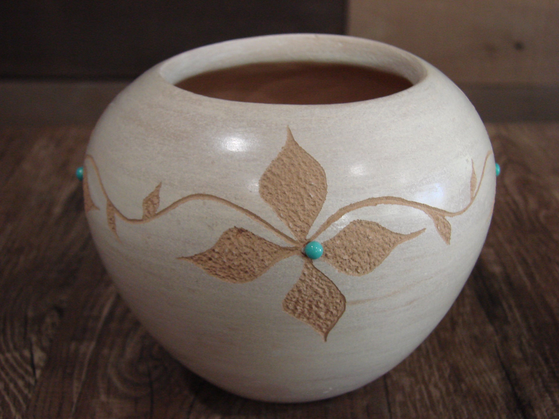 Genuine Native American Jemez Indian Hand Made Clay Pottery from Northern New Mexico. This Stunning piece of Pottery features beautifully Hand Etched Flowers with drops of Turquoise at the center. This piece is handmade with Jemez Mountain Clay. Handmade by Marcella Yepa. Signed on the bottom. Free shipping included!