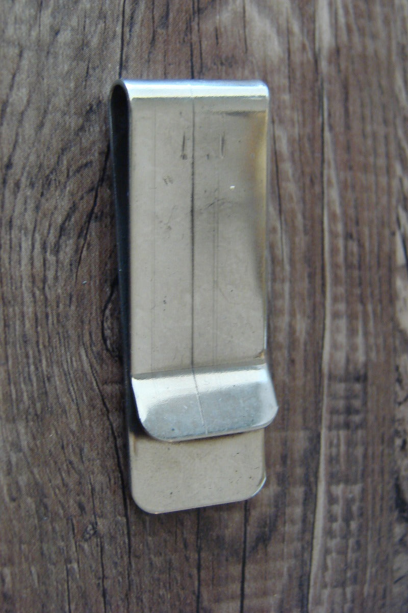 Native American Navajo Indian Coral Money Clip from Western New Mexico. This money clip features two genuine Coral stones set into a sterling silver Bear Paw shadow box settings. The stones are set into the Bear Paw giving them a very nice shadow box look. The clip is made out of spring Stainless Silver. Navajo Indian hand made by Virgina Long, unsigned. Free shipping and gift box included!