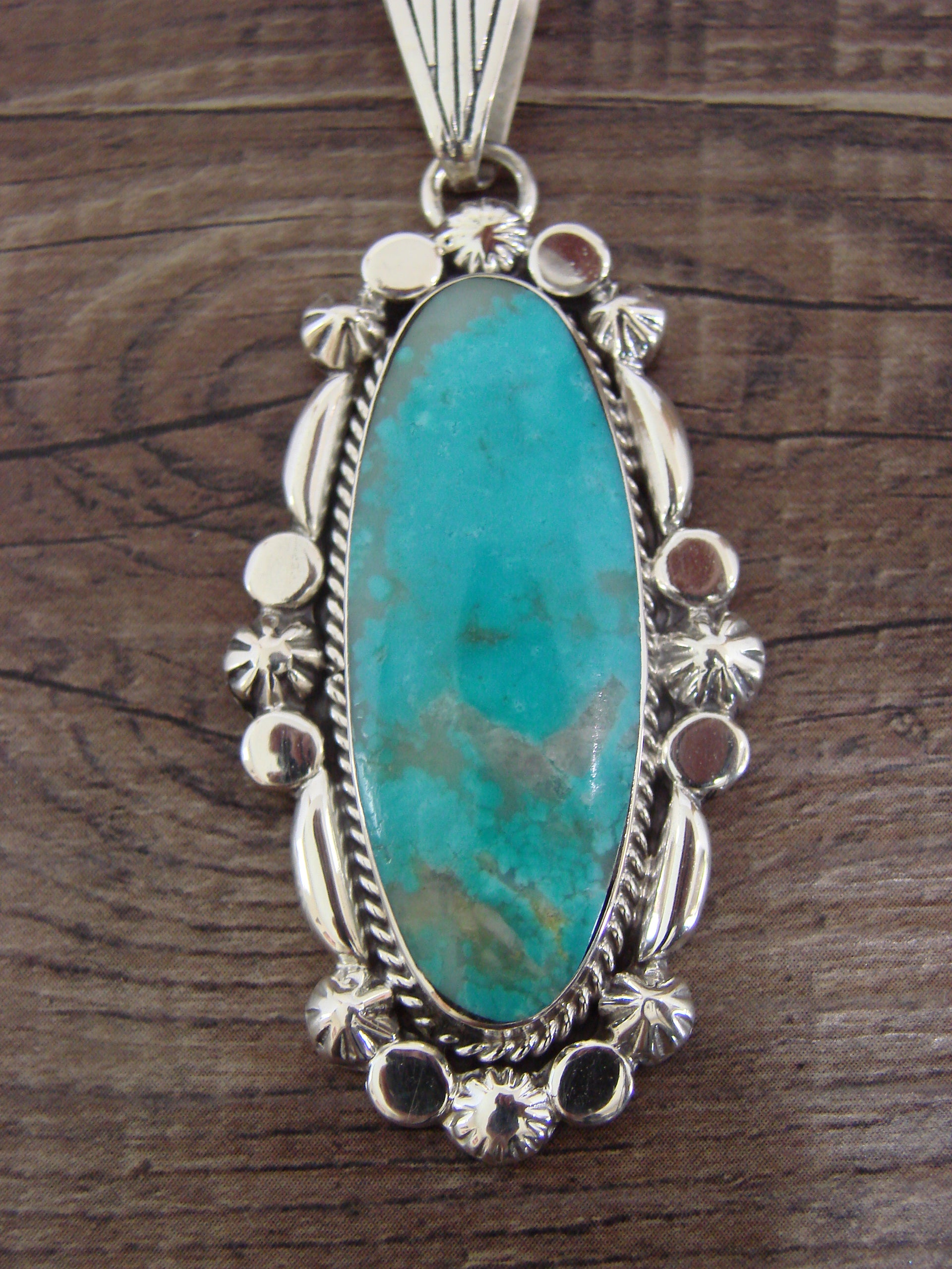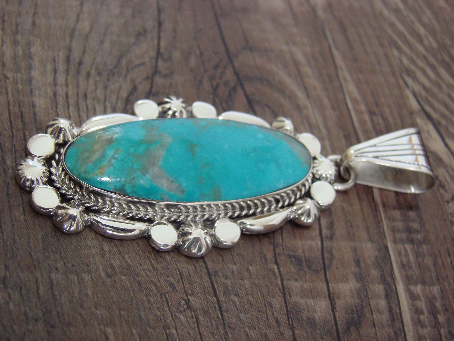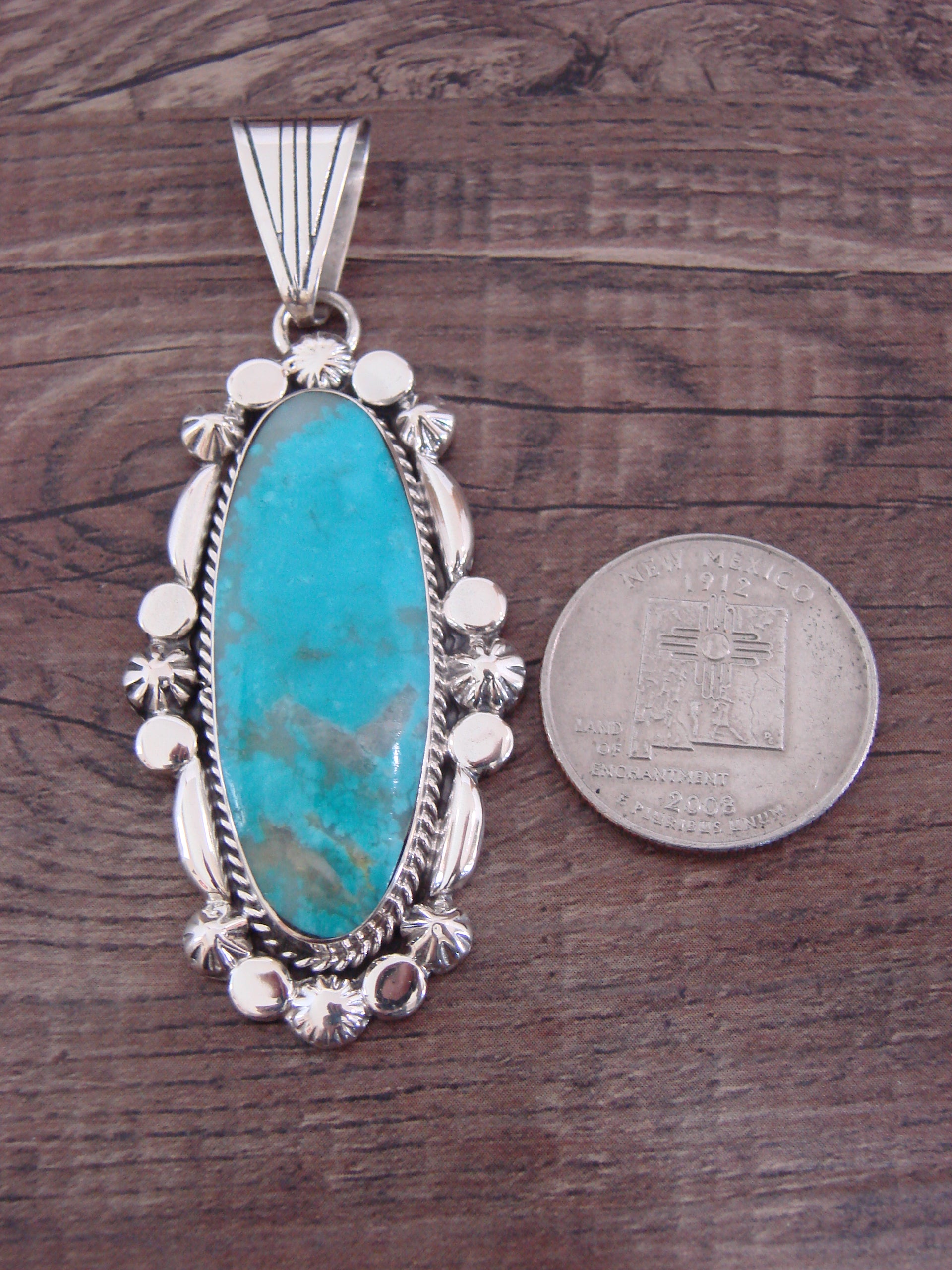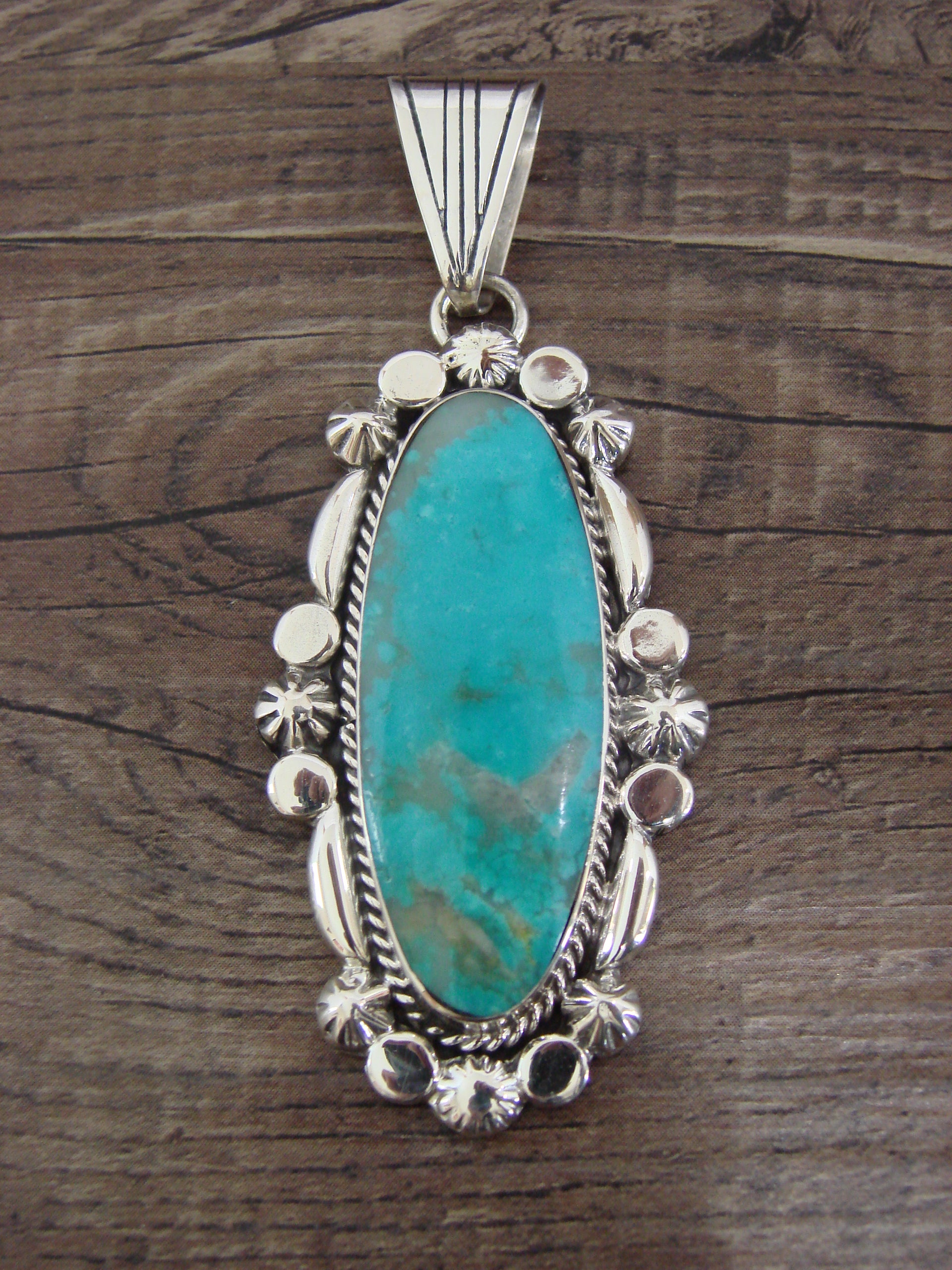 Genuine Native American Navajo Indian Sterling Silver & Turquoise Pendant from Western New Mexico. This Stunning pendant features a High Quality, Genuine Turquoise stone intricately set into a smooth Sterling Silver bezel setting. Beautiful details in Sterling Silver surround the stone. This Pendant is Gorgeous and Handmade to Perfection! Handmade by Navajo artist Angie Platero. Hallmarked on the back. Free gift box and shipping included!