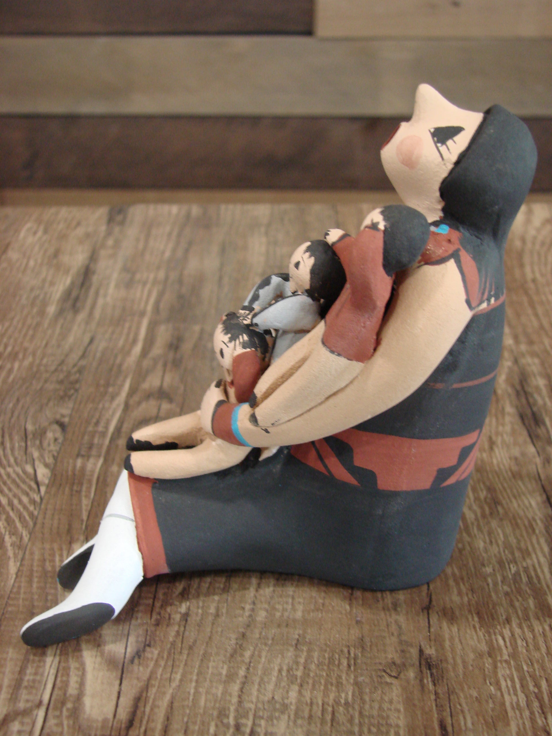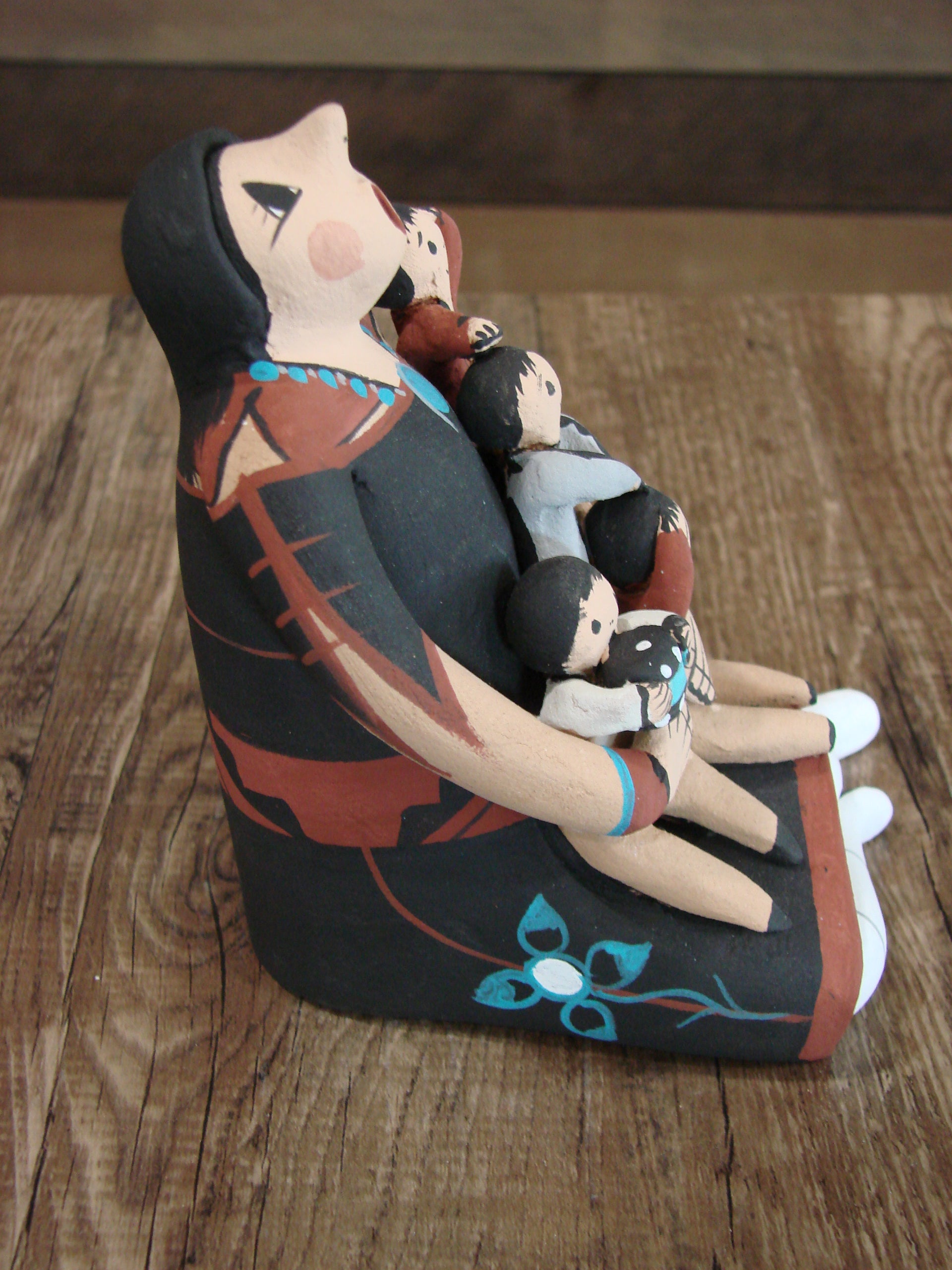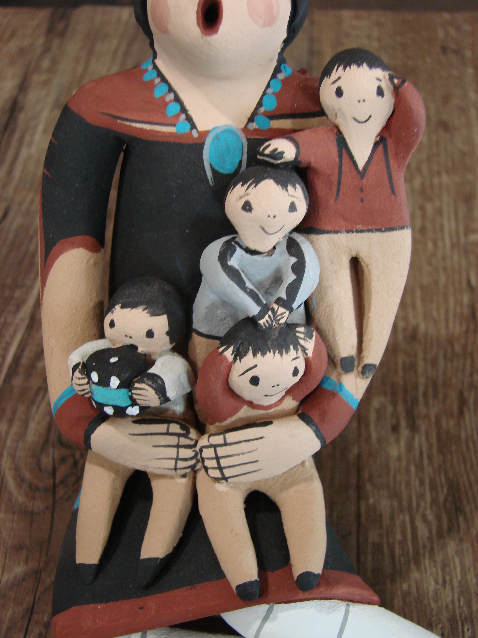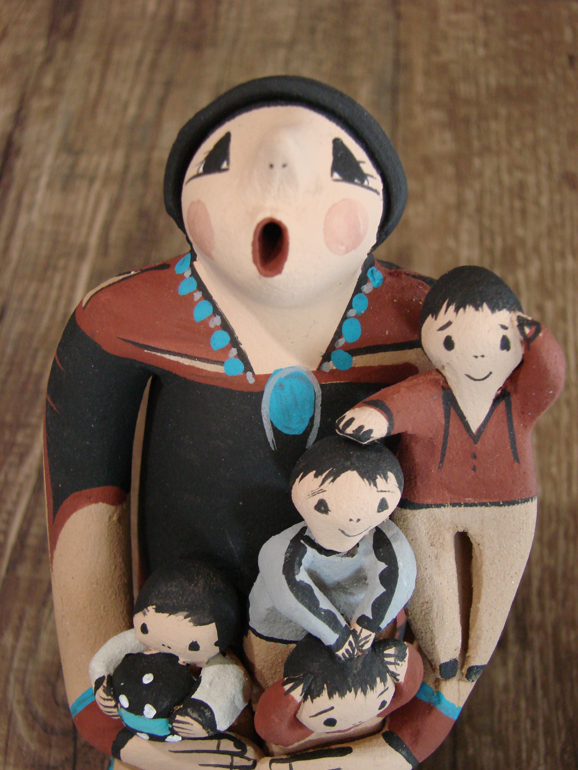 Native American Jemez Indian Hand Made Clay Storyteller from Northern New Mexico. This Stunning Storyteller features a Women singing and holding her children. This piece is handmade with Jemez Mountain Clay. The storyteller is beautifully hand painted throughout. Handmade by J. Lucero. Signed on the bottom. Free shipping included!
