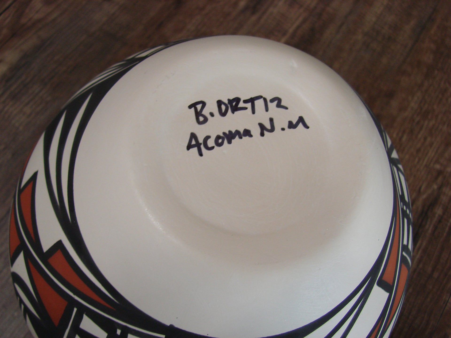 Native American Laguna Pueblo Indian Hand Painted Fine Line Pottery from Western New Mexico. This piece of pottery features Stunning natural pigment hand painted patterns throughout. The detail is exquisite! Hand painted by Laguna artist B. Ortiz. The bottom is signed. Free Shipping included!