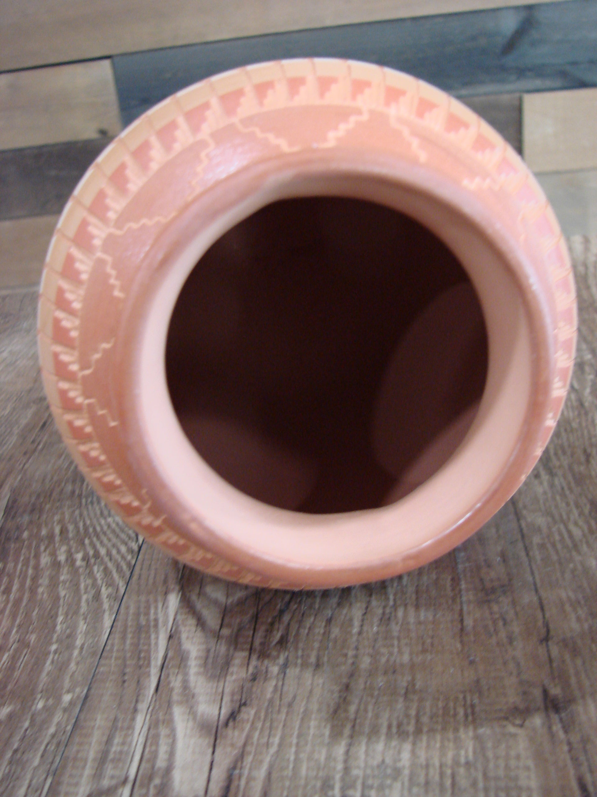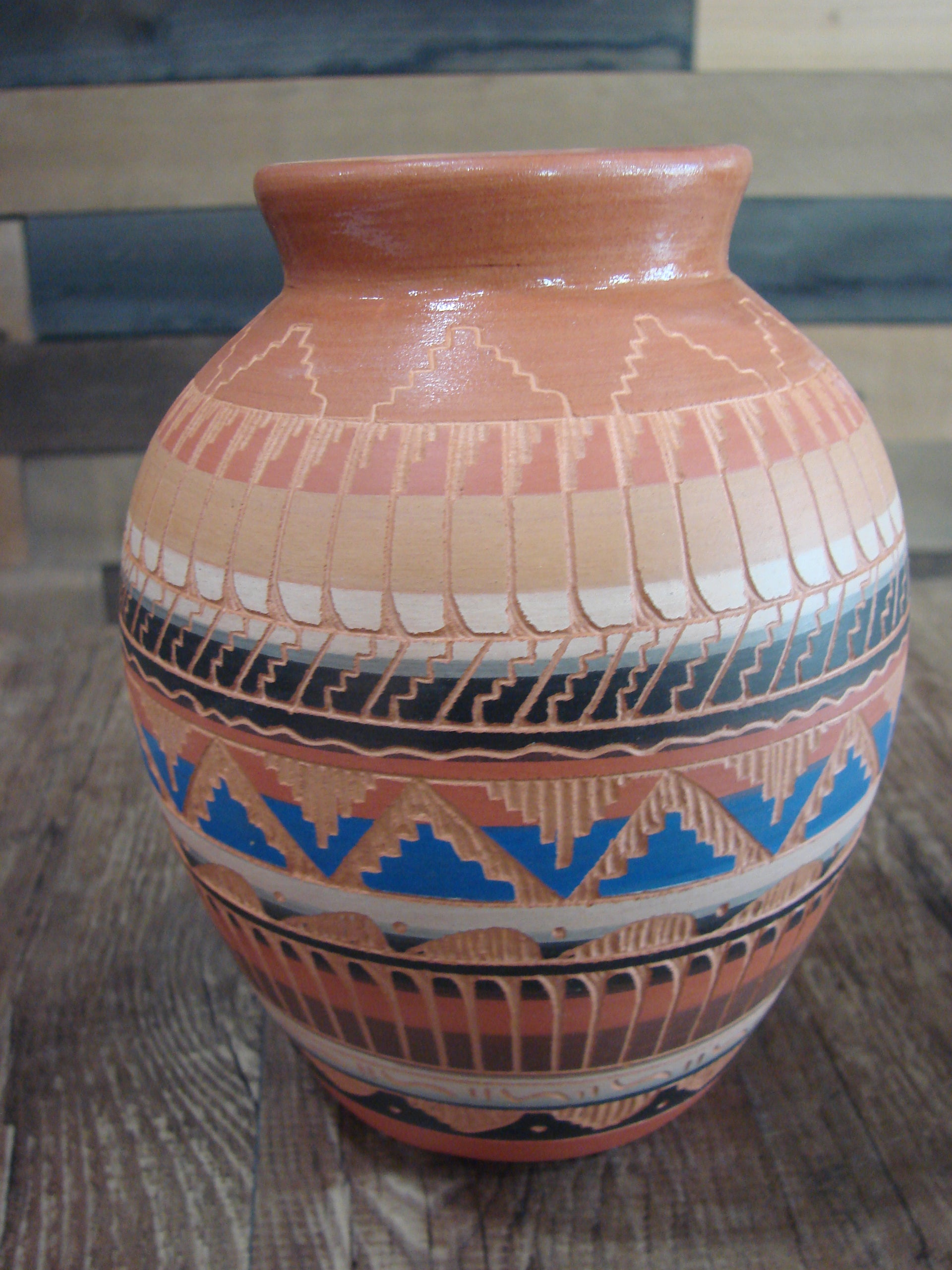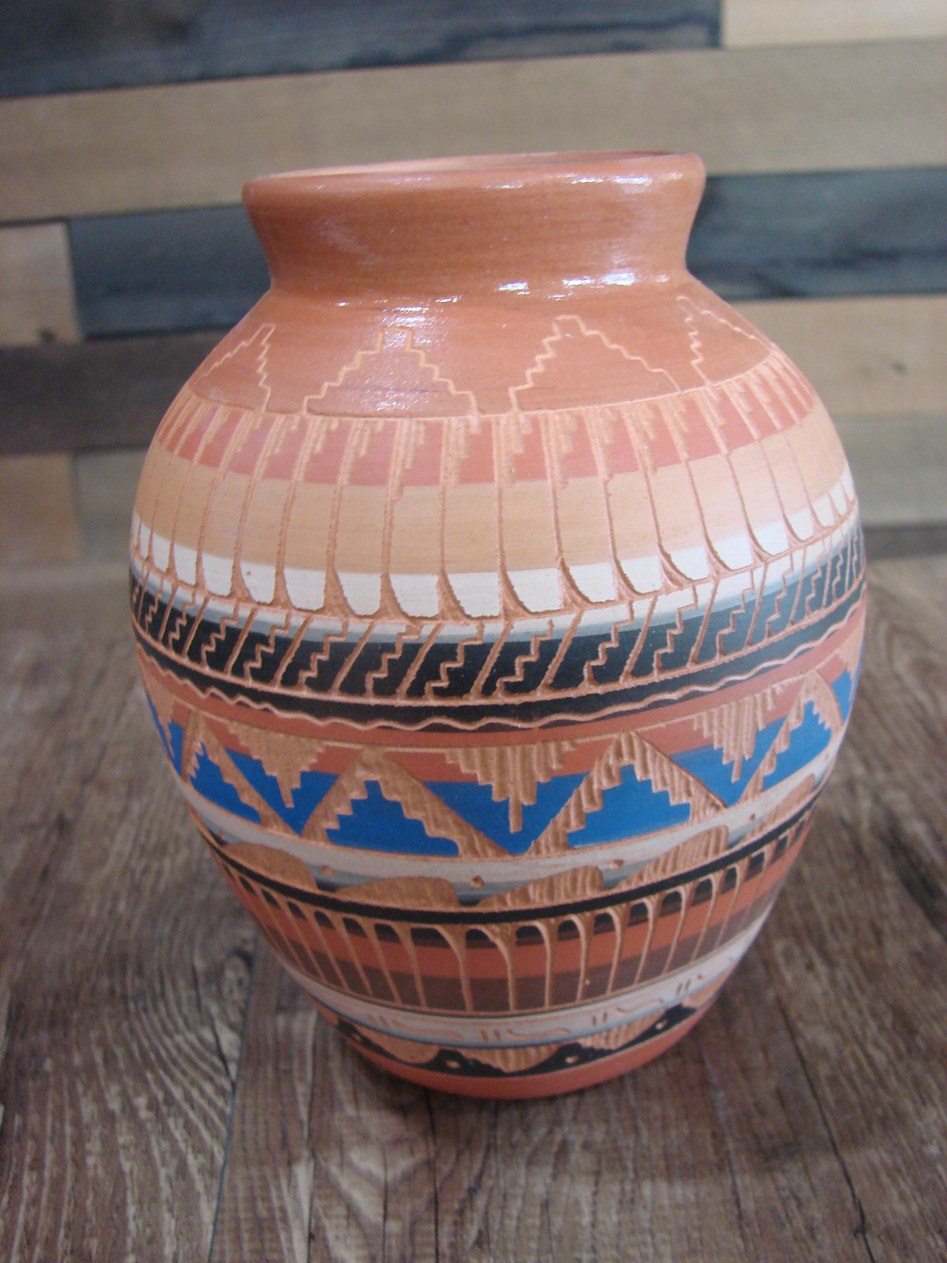 Genuine Native American Navajo Indian Hand Etched and Hand Painted Ginger Jar Pottery from Western New Mexico. This beautiful piece of pottery features stunning Hand Painted and traditional Hand Etched Navajo patterns throughout. Hand etched and painted by Mirelle Gilmore. Signed "MG" on the bottom. Free shipping included!