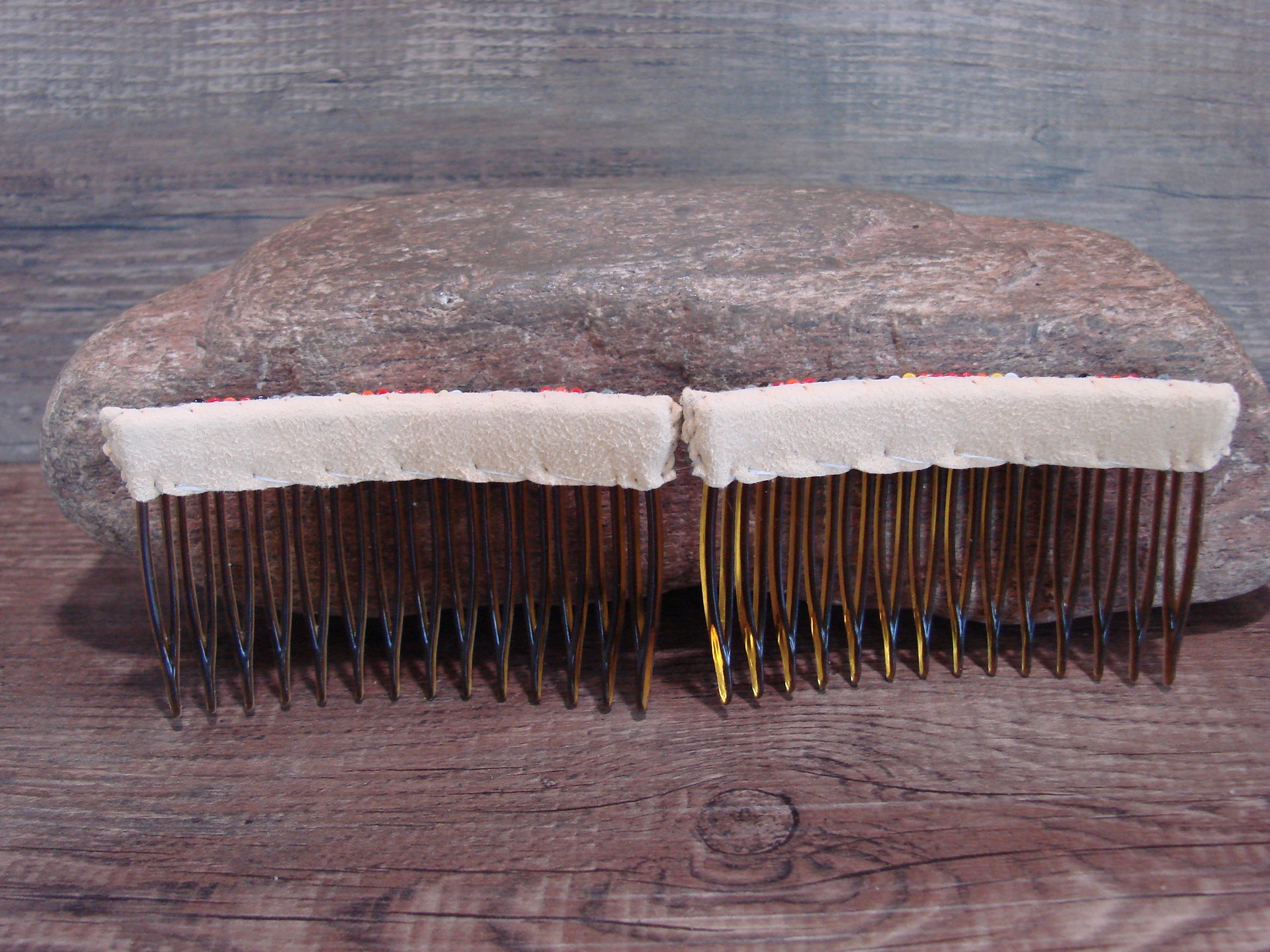 Native American Navajo Indian Hand Beaded Comb Set from Western New Mexico. Each Comb features a beautiful Hand beaded Navajo Style design. The colors are very vibrant and have a great look. Handmade by Navajo Silversmith Raven Cleveland. This comb set is Genuine and Stunning! Free Shipping with a gift box included!