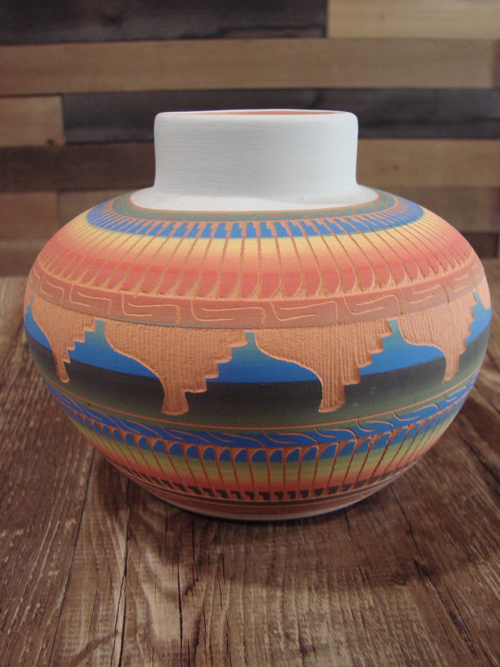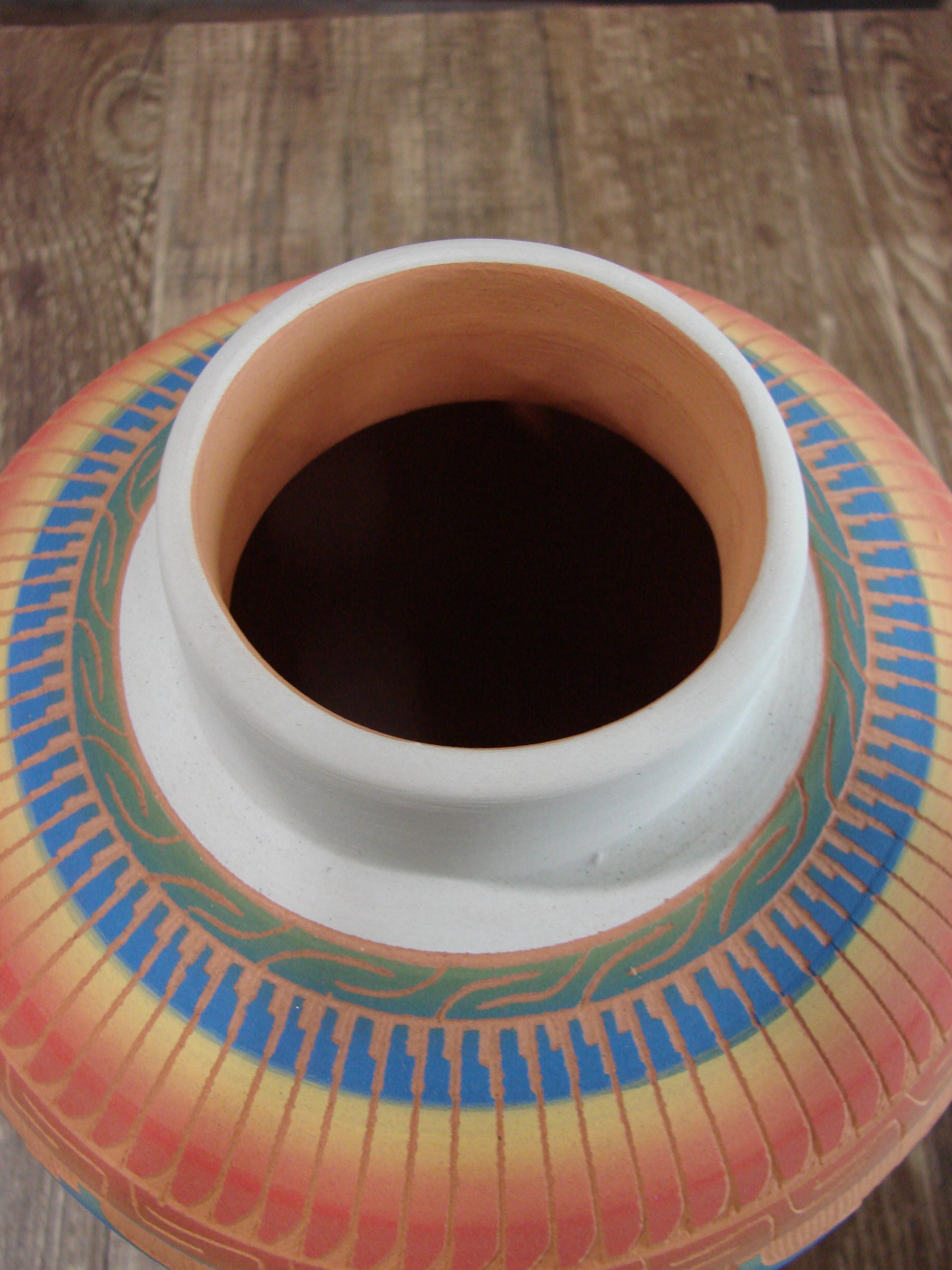 Genuine Native American Navajo Indian Hand Etched and Hand Painted Pottery from Western New Mexico. This beautiful piece of pottery features stunning Hand Painted and traditional Hand Etched Navajo patterns throughout. Hand etched and painted by Millissa Charlie. Signed "MC" on the bottom. Free shipping included!