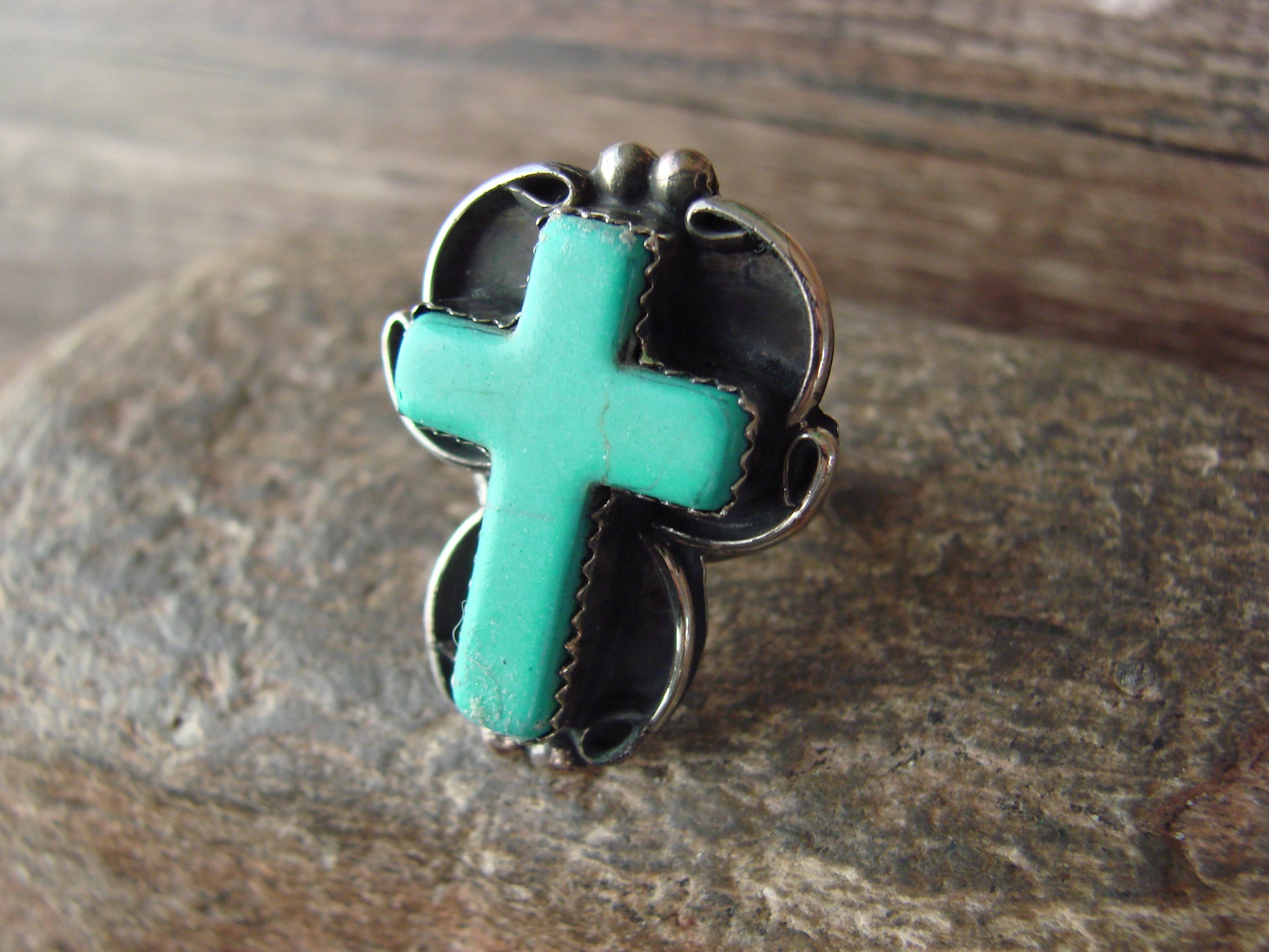 Native American Navajo Indian Nickel Silver & Turquoise Cross Ring from Western New Mexico. This Stunning ring features a Man Made Turquoise stone. The stone is set into a very nice, crown, Nickel Silver Cross setting and is surrounded by beautiful details in Nickel Silver. This ring is Gorgeous! Navajo Indian handmade by Silversmith P. Tolta. Signed "P" on the inner band. Free Shipping and gift box included!