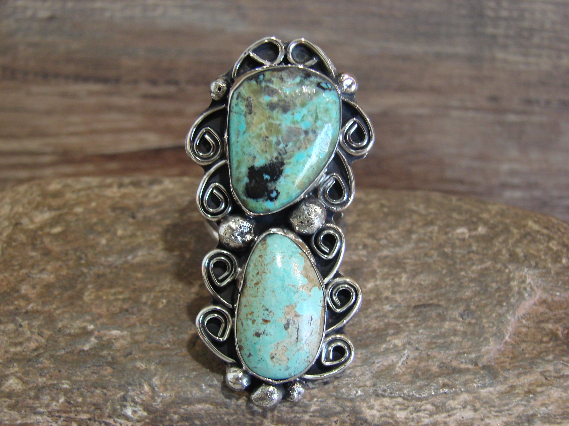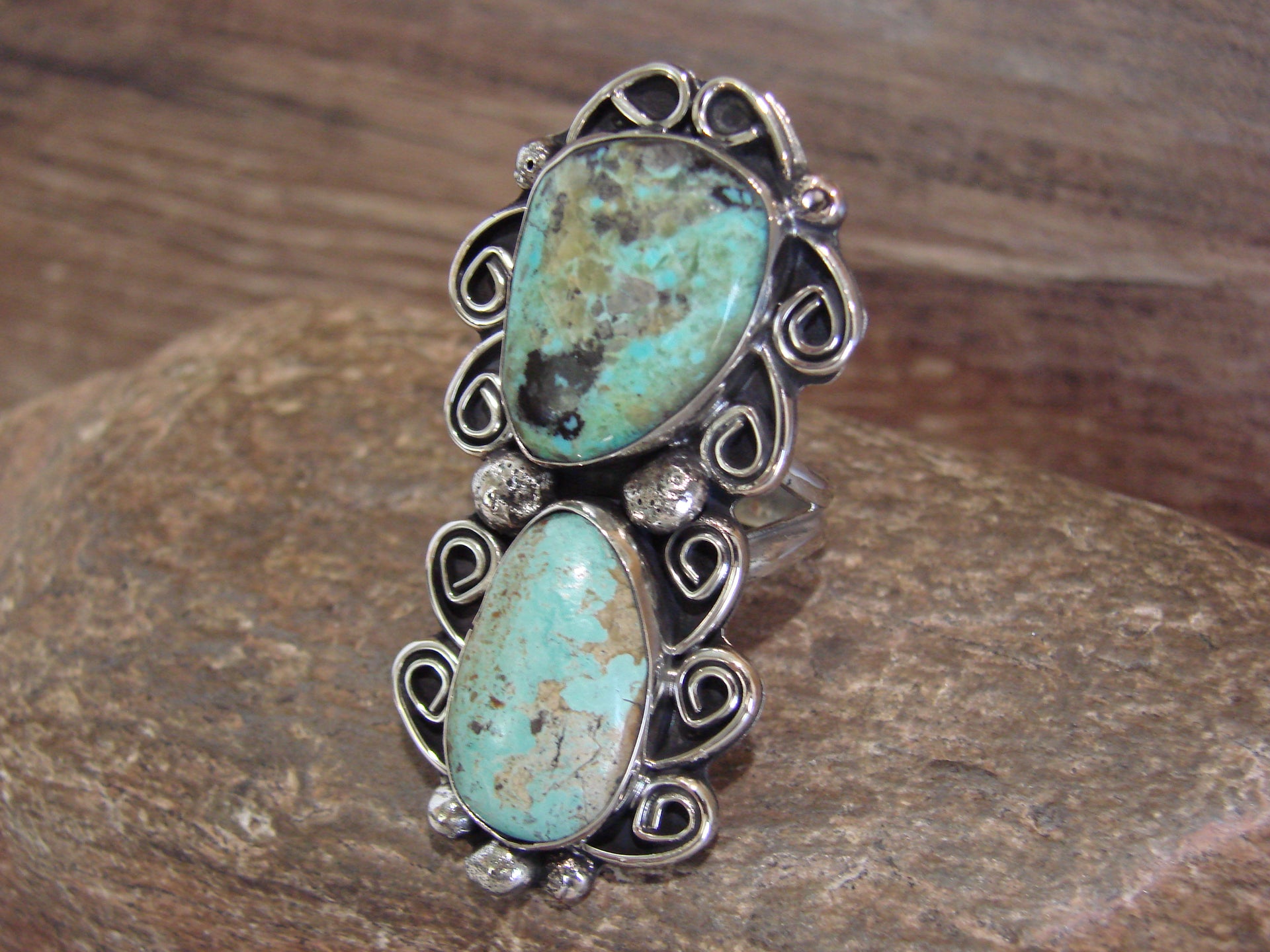 Native American Navajo Indian Nickel Silver & 2 Stone Turquoise Ring from Western New Mexico. This Stunning ring features 2 Genuine Turquoise stones set into smooth Nickel Silver bezel settings. Beautiful Nickel Silver details Surround the Stone. This ring is made in Nickel Silver. Navajo Indian handmade by Silversmith Jackie Cleveland. Signed "JC" on the inner band. Free Shipping and Gift Box included!