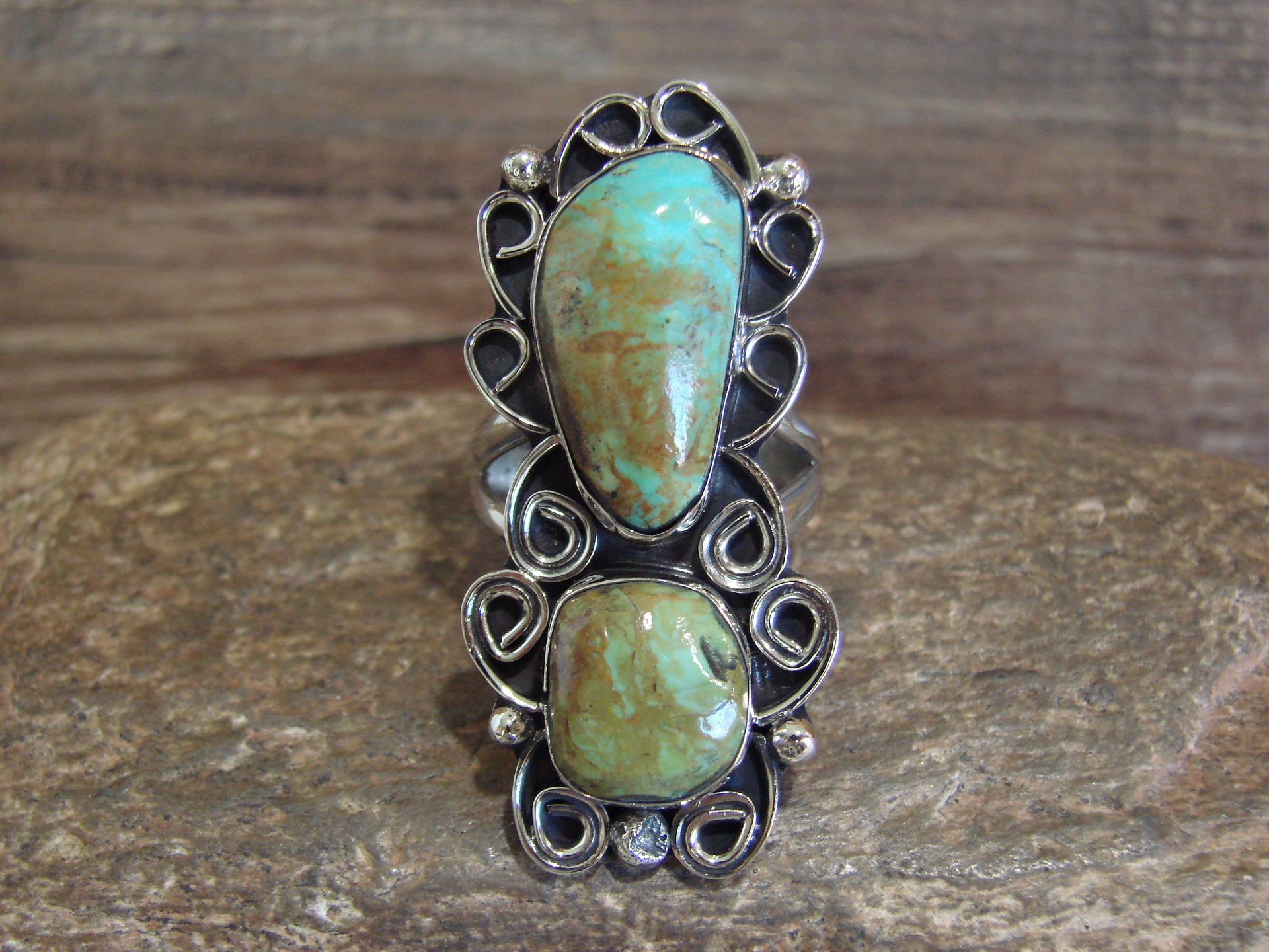 Native American Navajo Indian Nickel Silver & 2 Stone Turquoise Ring from Western New Mexico. This Stunning ring features 2 Genuine Turquoise stones set into smooth Nickel Silver bezel settings. Beautiful Nickel Silver details Surround the Stone. This ring is made in Nickel Silver. Navajo Indian handmade by Silversmith Jackie Cleveland. Signed "JC" on the inner band. Free Shipping and Gift Box included!