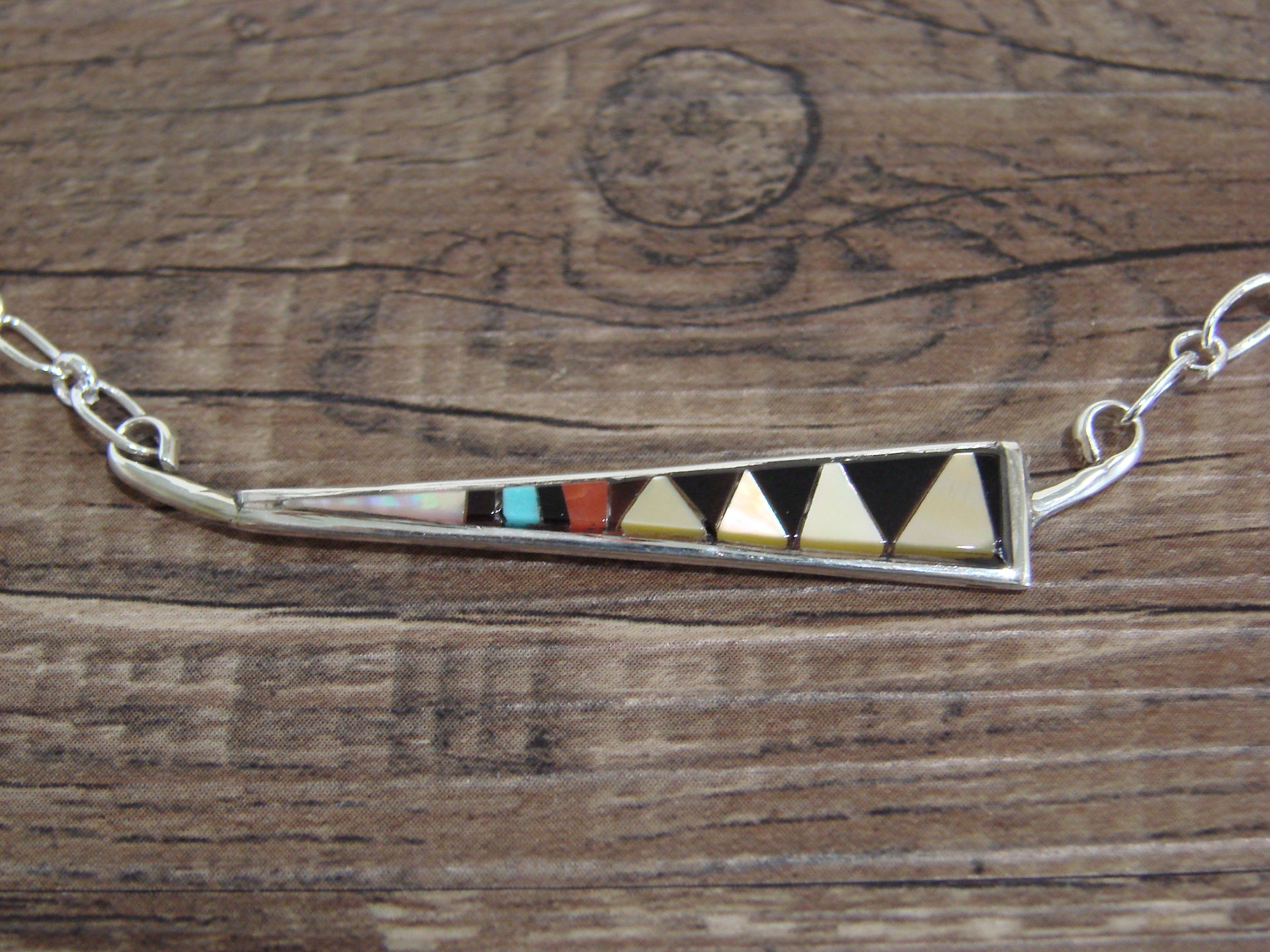 Genuine Native American Zuni Indian Sterling Silver & Multi Stone Inlay Link Necklace from Western New Mexico. This Stunning Necklace features beautifully inlaid Turquoise, Coral, Shell and Onyx Stones set into a smooth Sterling Silver setting. This Necklace is Gorgeous! Zuni Indian hand made by Tammie Qualo. Signed "TQ" and Stamped "Sterling" on the back. Free shipping and gift box included!