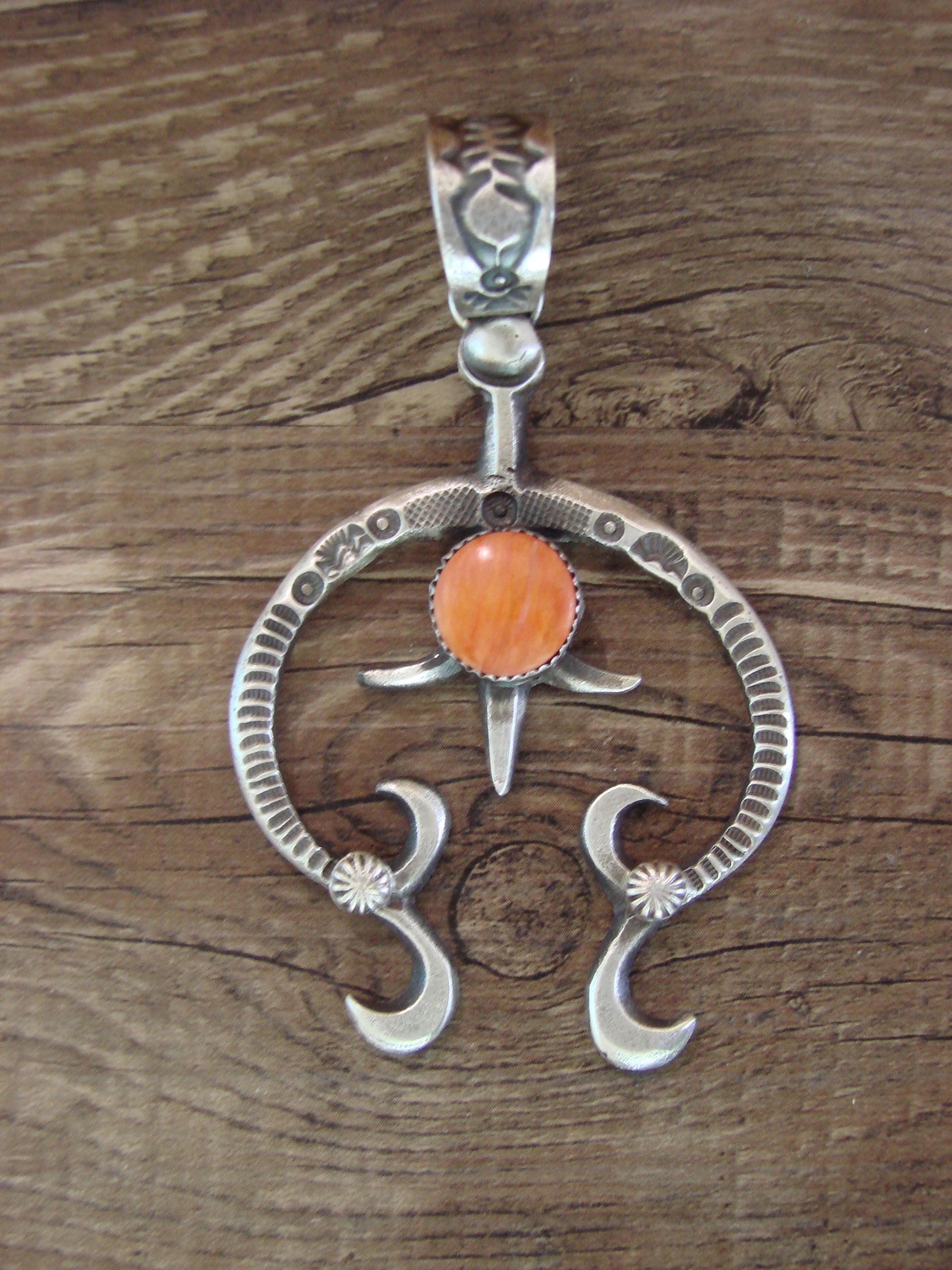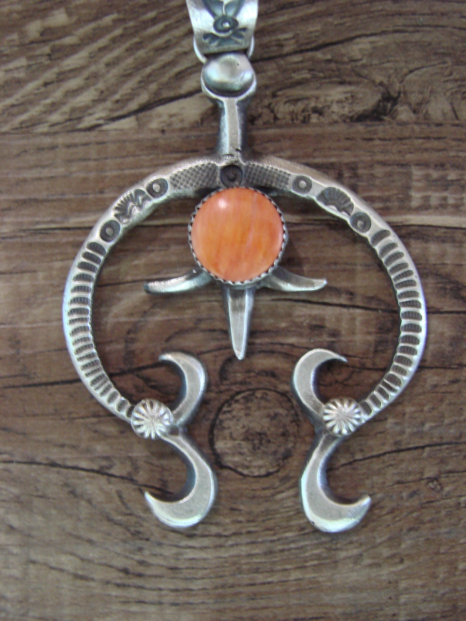 Genuine Native American Navajo Indian Sterling Silver Spiny Oyster Cast Naja Pendant from Western New Mexico. This beautiful pendant features a genuine Spiny Oyster stone set into a crown Sterling Silver bezel setting. Very detailed sand casting and hand stamping is featured throughout this Naja. This piece is Gorgeous and Hand Made to Perfection! Navajo Indian handmade by Eva & Linberg Billah. Signed "EL Billah" and stamped "Sterling" on the back. Free shipping and Gift Box included!