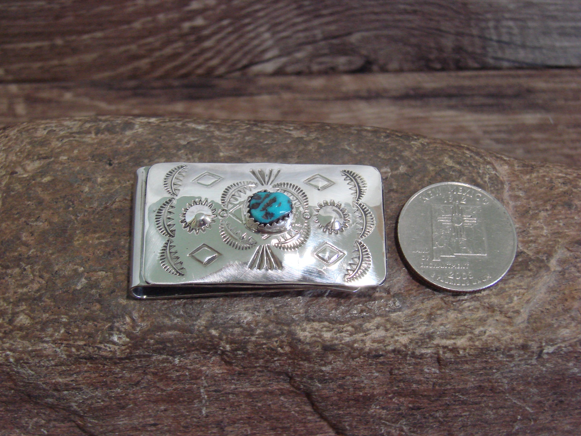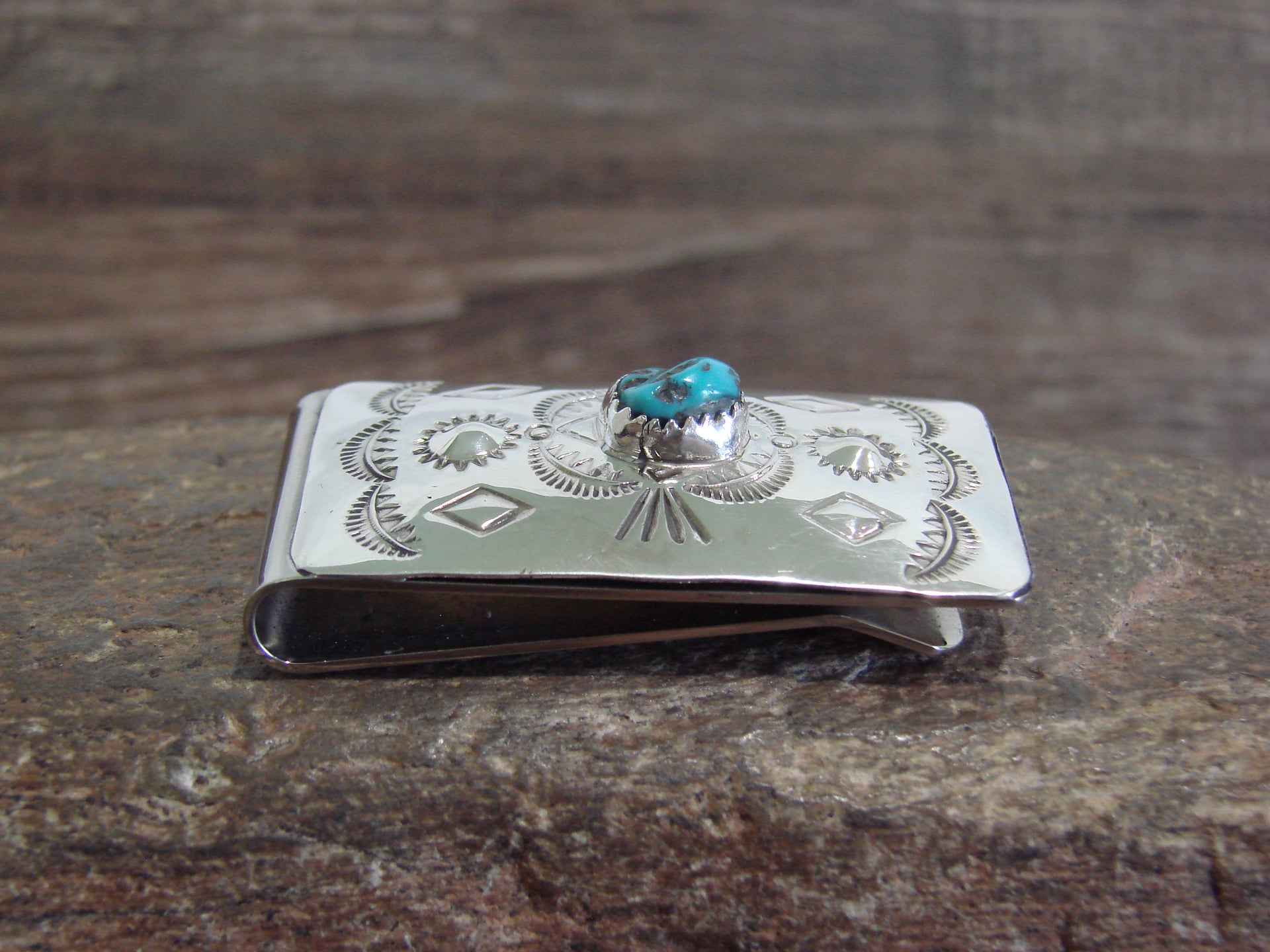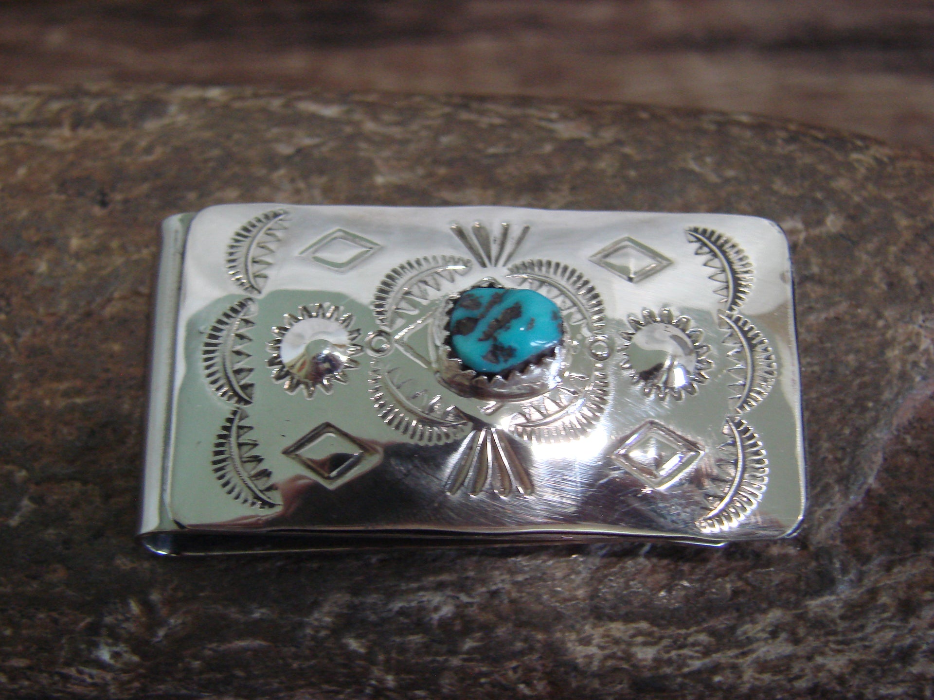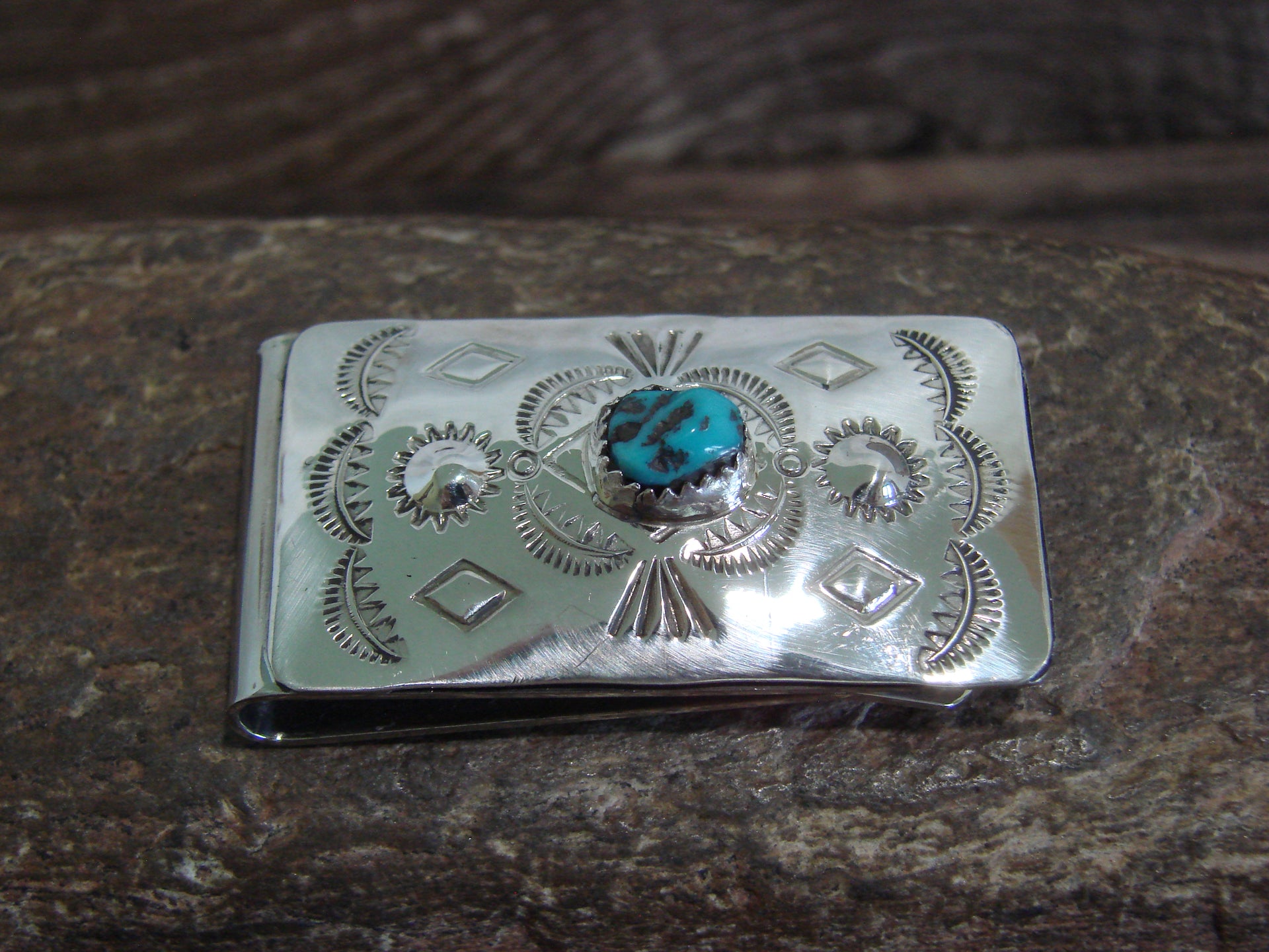 Genuine Native American Navajo Indian Turquoise Money Clip from Western New Mexico. This money clip features a Beautiful Turquoise stone set into a crown setting. Stunning Hand Stamping surrounds the Stone. Polished to a bright shine, this Money Clip is Gorgeous! This clip is made with Spring Stainless Steel and Sterling Silver Overlay. Navajo Indian Handmade by J. Begay. Free Shipping and gift box included!