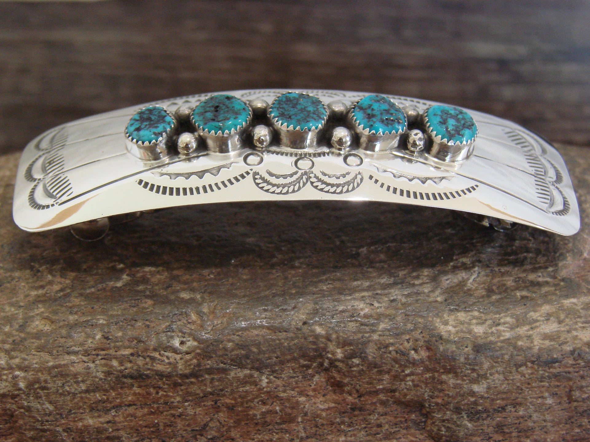 Genuine Native American Navajo Indian Sterling Silver Hand Stamped Turquoise Row Hair Barrette from Western New Mexico. This Stunning barrette features a Row of Genuine Turquoise stones set into crown Sterling Silver bezel settings. Surrounding the stones are beautiful details and hand stamping throughout the Sterling Silver. The spring hair clasp is 2" wide. This Gorgeous barrette is Handmade to Perfection! Handmade by Navajo Silversmith Jolene Begay. Stamped "Sterling" on the back. Free shipping and gift box included!