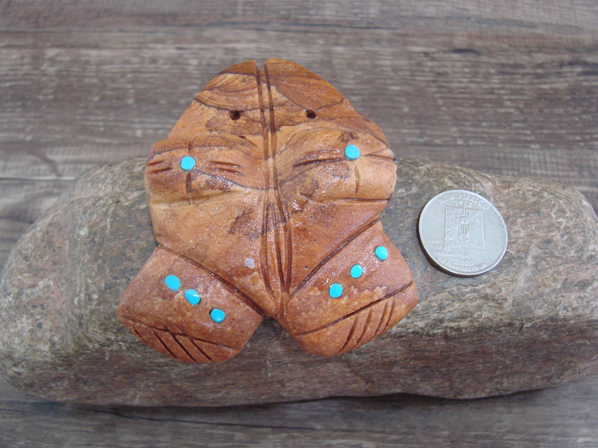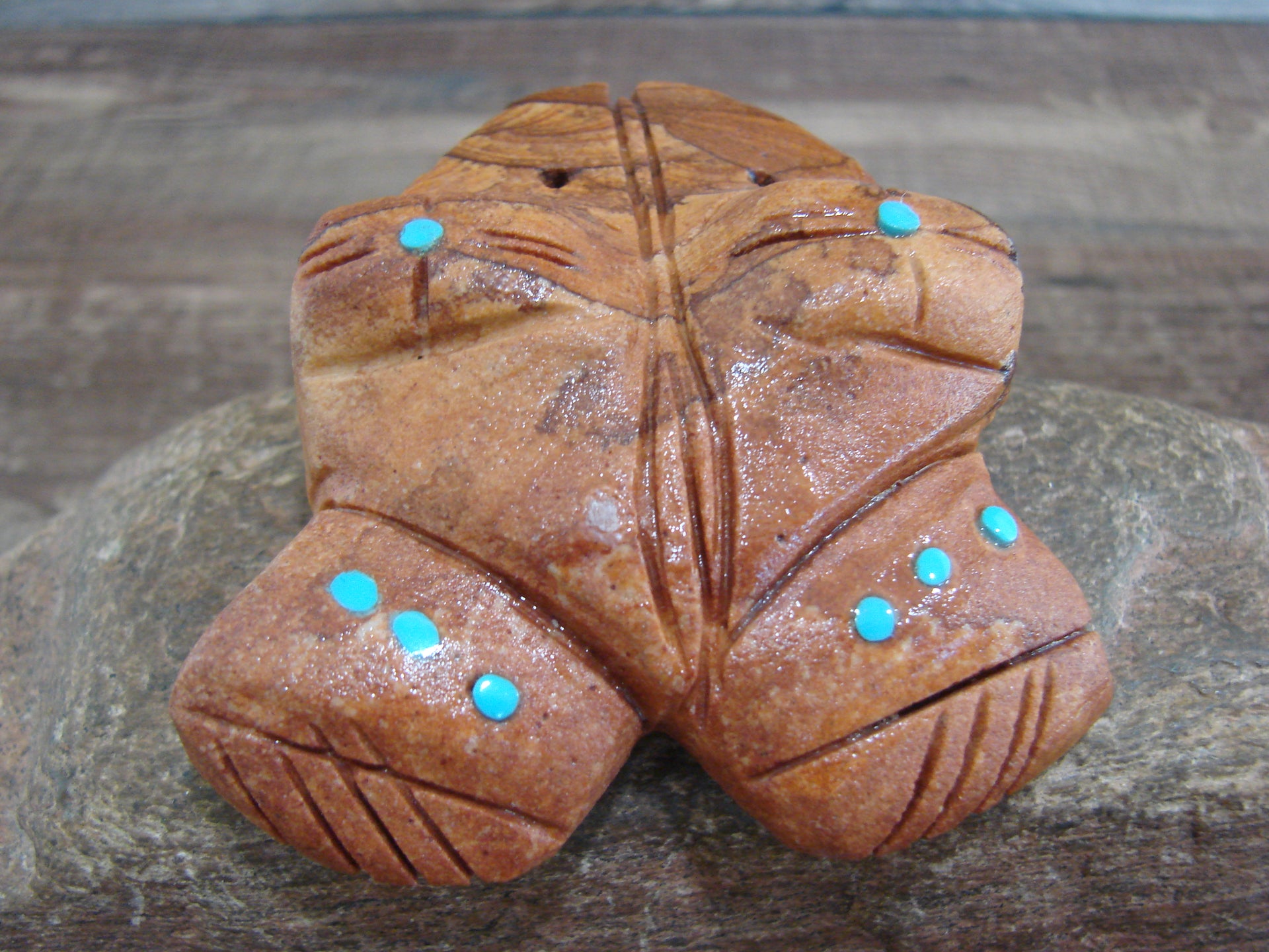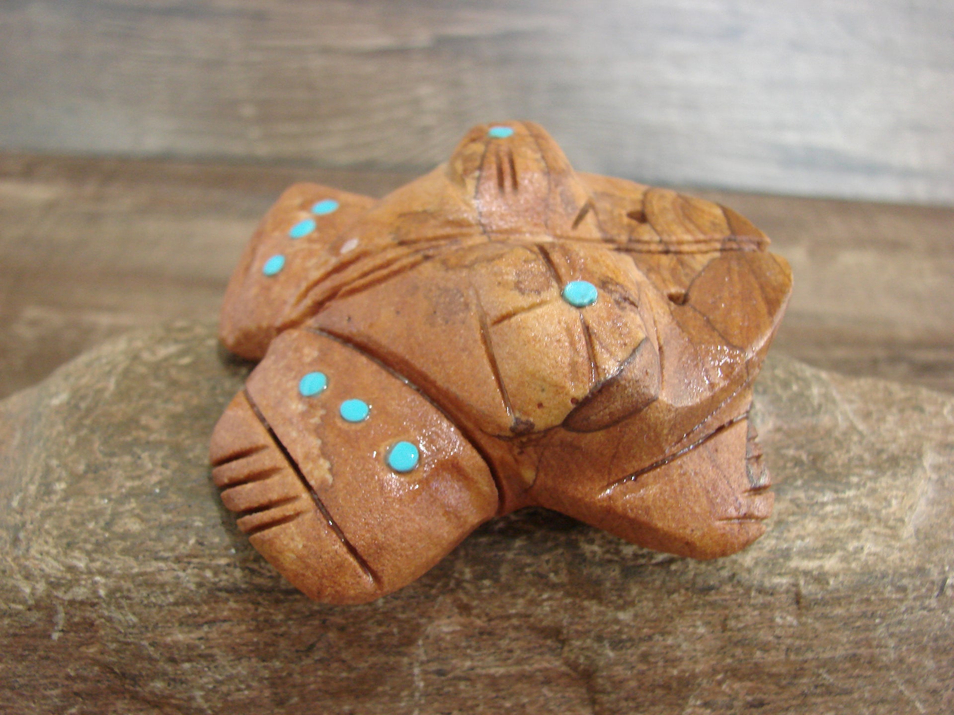 Native American Zuni Indian Hand Carved Frog Fetish from the Zuni Pueblo in Western New Mexico. This Stunning Fetish is Hand Carved out of a beautiful piece of Jasper. Turquoise is used for both the eyes. This is a unique and stunning piece! Handmade by the Zuni carver Louise Ponchuella. Signed on the bottom. Free Shipping included!