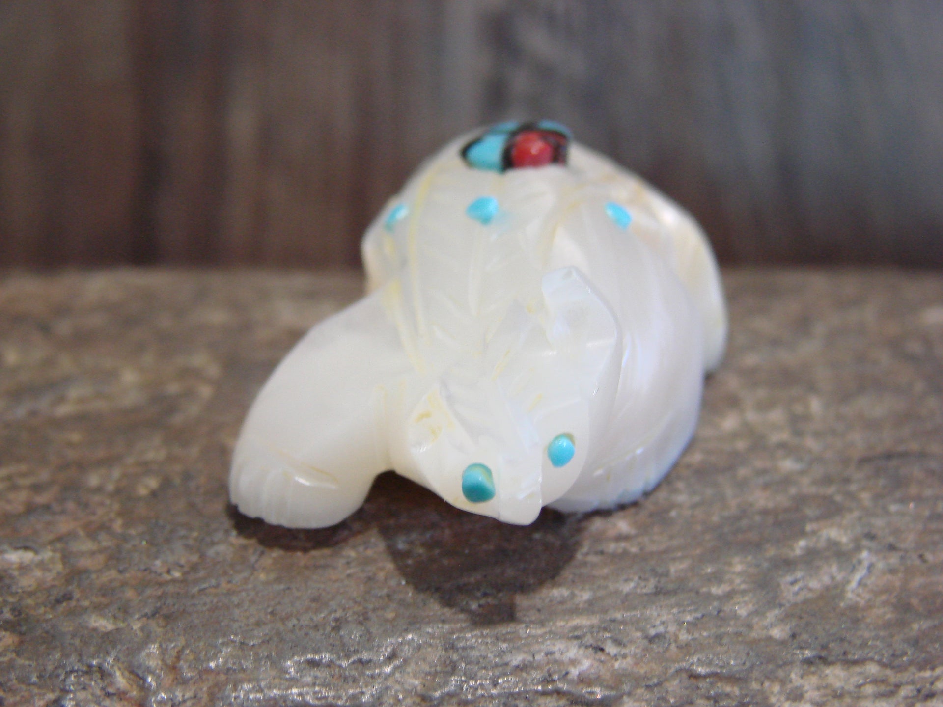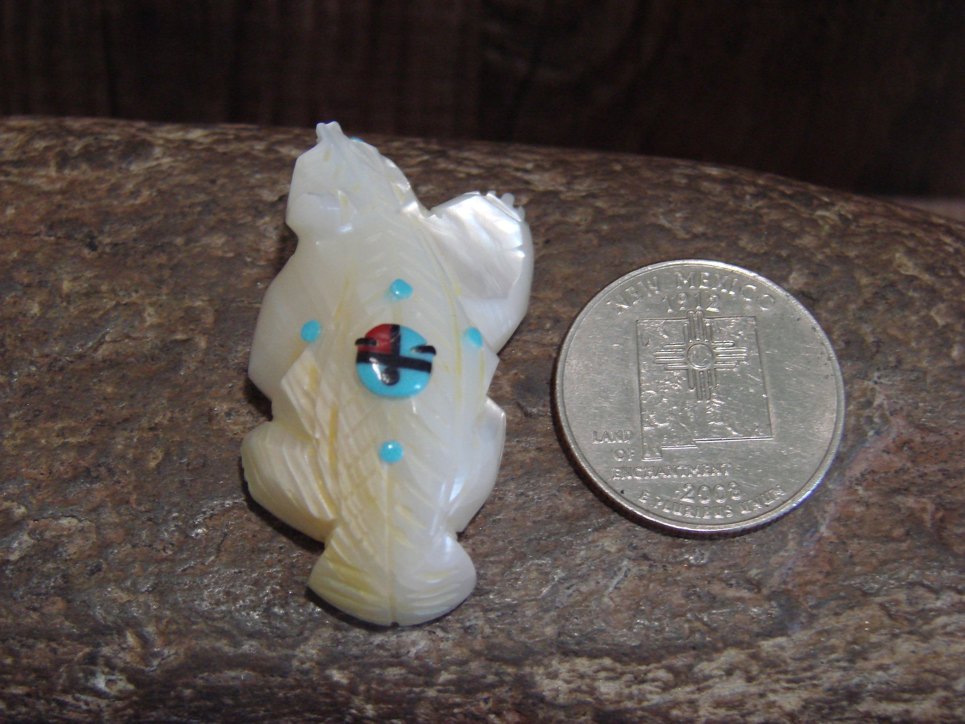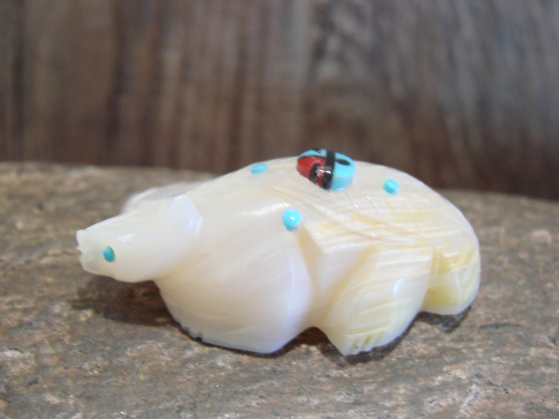 Native American Zuni Indian Hand Carved Badger Fetish from the Zuni Pueblo in Western New Mexico. This Stunning Fetish is Hand Carved out of a beautiful piece of Mother of Pearl. Turquoise is used for both the eyes. A Beautiful Sunface is featured on its back out of Turquoise, Coral, and Jet Stones. This is a unique and Stunning piece! Handmade and signed "DL" by the Zuni carver Denette Latte. Free Shipping included!