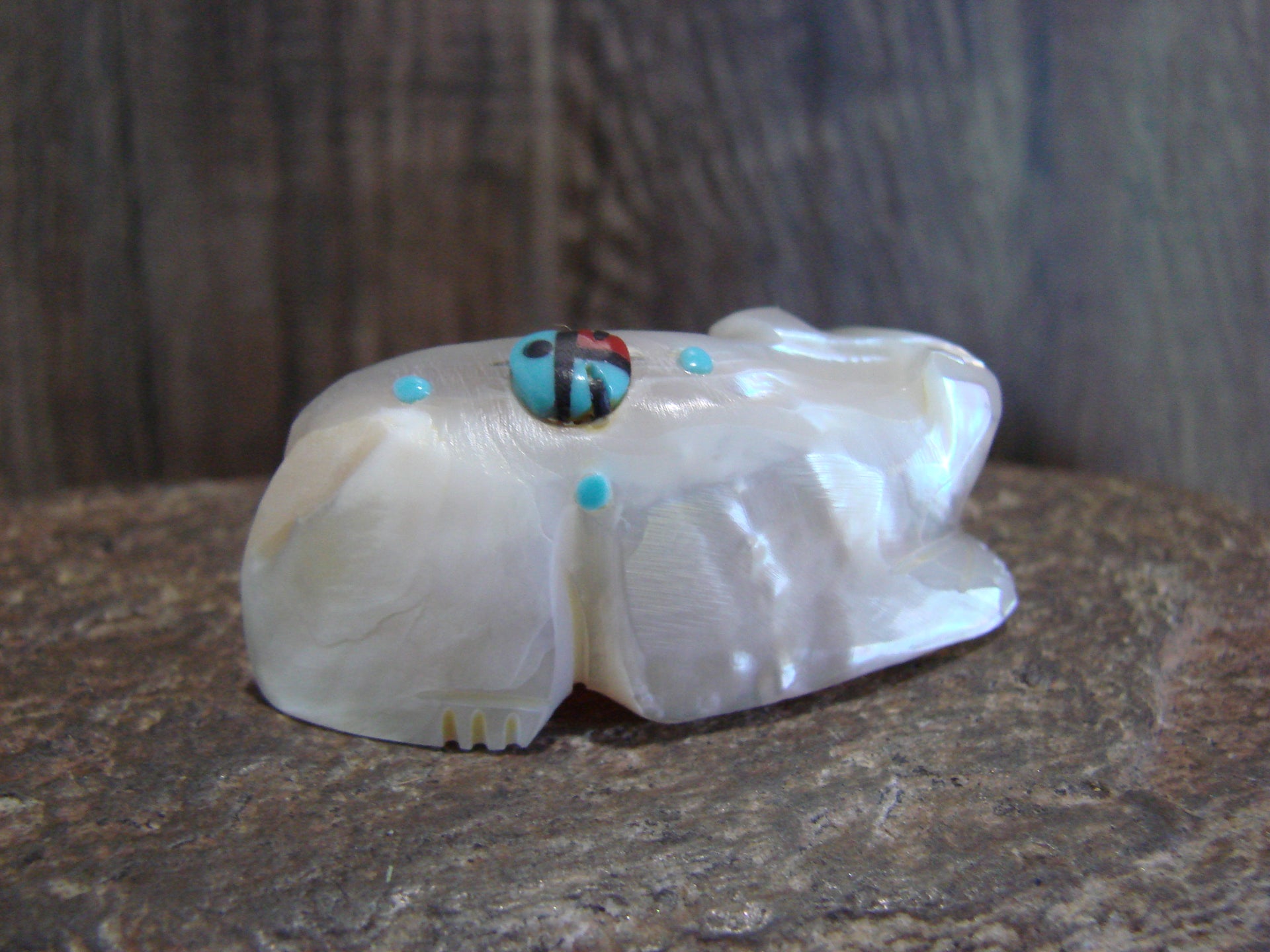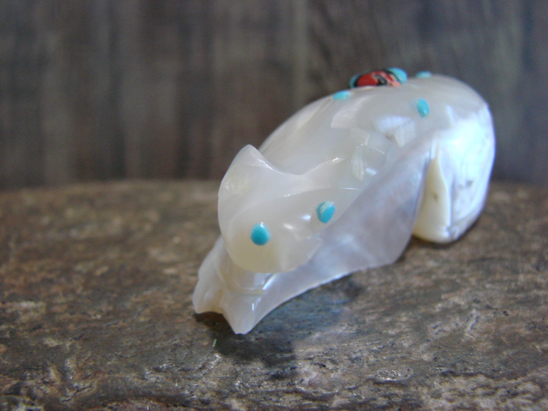 Native American Zuni Indian Hand Carved Bear Fetish from the Zuni Pueblo in Western New Mexico. This Stunning Fetish is Hand Carved out of a beautiful piece of Mother of Pearl. Turquoise is used for both the eyes. A Beautiful Sunface is featured on its back out of Turquoise, Coral, and Jet Stones. This is a unique and stunning piece! Handmade and Signed "DL" by the Zuni carver Denette Latte. Free Shipping included!