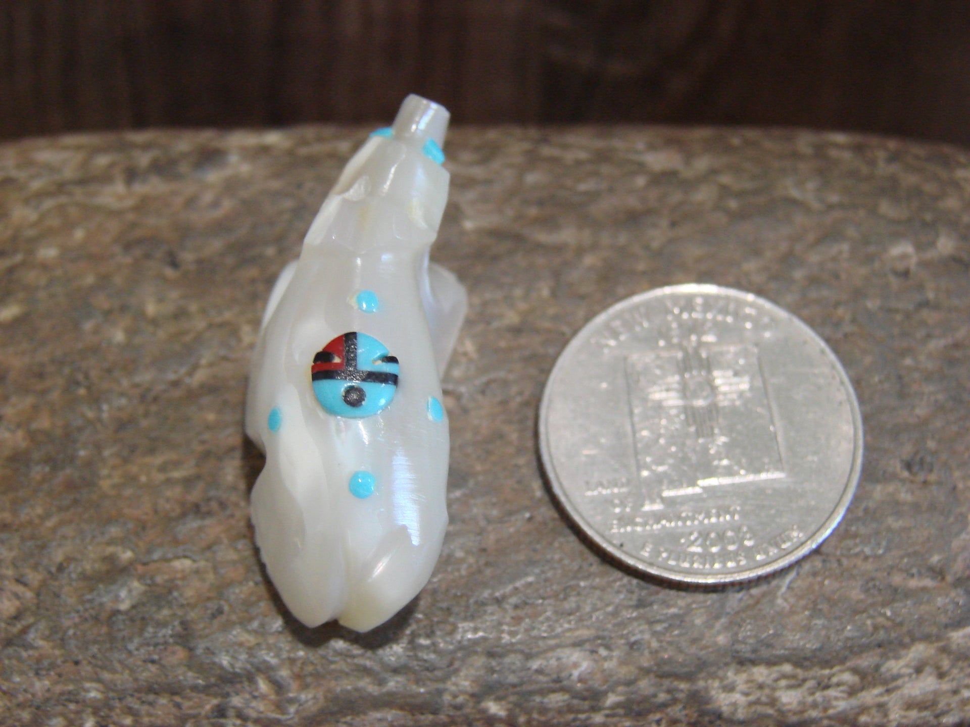 Native American Zuni Indian Hand Carved Bear Fetish from the Zuni Pueblo in Western New Mexico. This Stunning Fetish is Hand Carved out of a beautiful piece of Mother of Pearl. Turquoise is used for both the eyes. A Beautiful Sunface is featured on its back out of Turquoise, Coral, and Jet Stones. This is a unique and stunning piece! Handmade and signed "DL" by the Zuni carver Denette Latte. Free Shipping included!