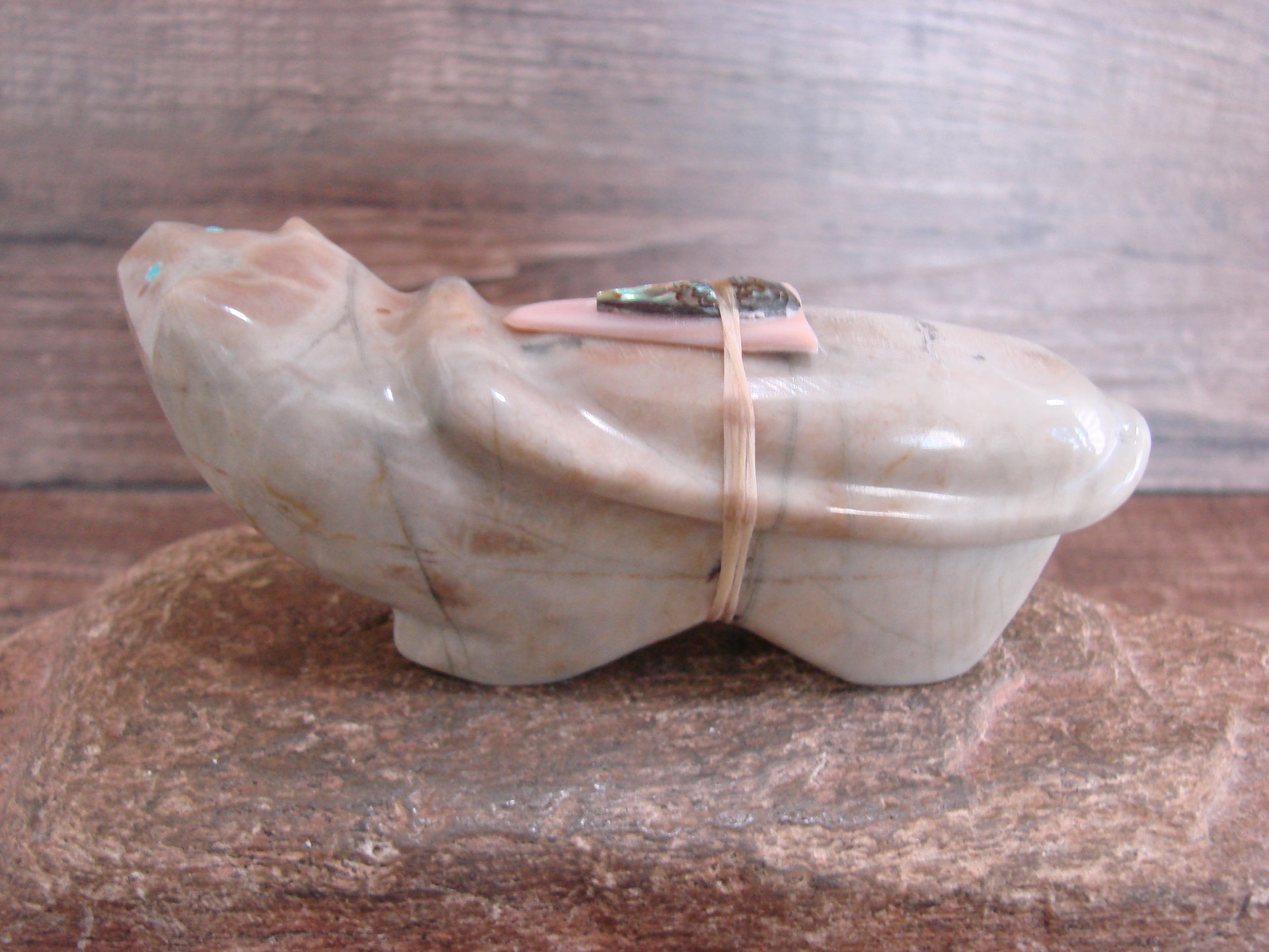 Native American Zuni Indian Hand Carved Mountain Lion Fetish from the Zuni Pueblo in Western New Mexico. This Stunning Fetish is Hand Carved out of a beautiful piece of Picasso Marble. Turquoise is used for both the eyes. This is a unique and stunning piece! Handmade by the Zuni carver Delvin Leekya. Signed on the bottom. Free Shipping included!