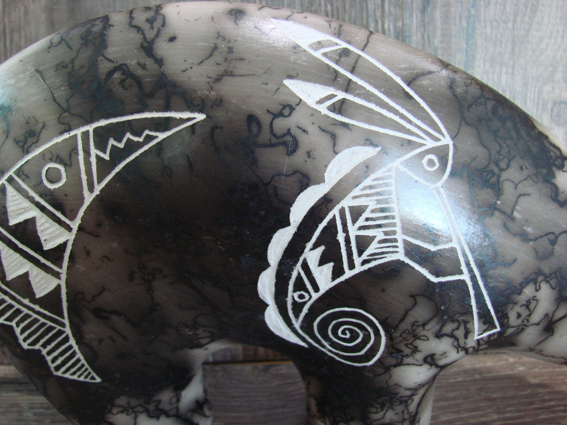 Native American Acoma Indian Horse Hair Bear Sculpture from Western New Mexico. This sculpture features beautiful horse hair and Hand Etching throughout. The Horse hair is laid over this piece during firing. The result is a unique one of a kind look. Hand etched by Acoma artist Gary Louis. Signed on the bottom. Free Shipping included!