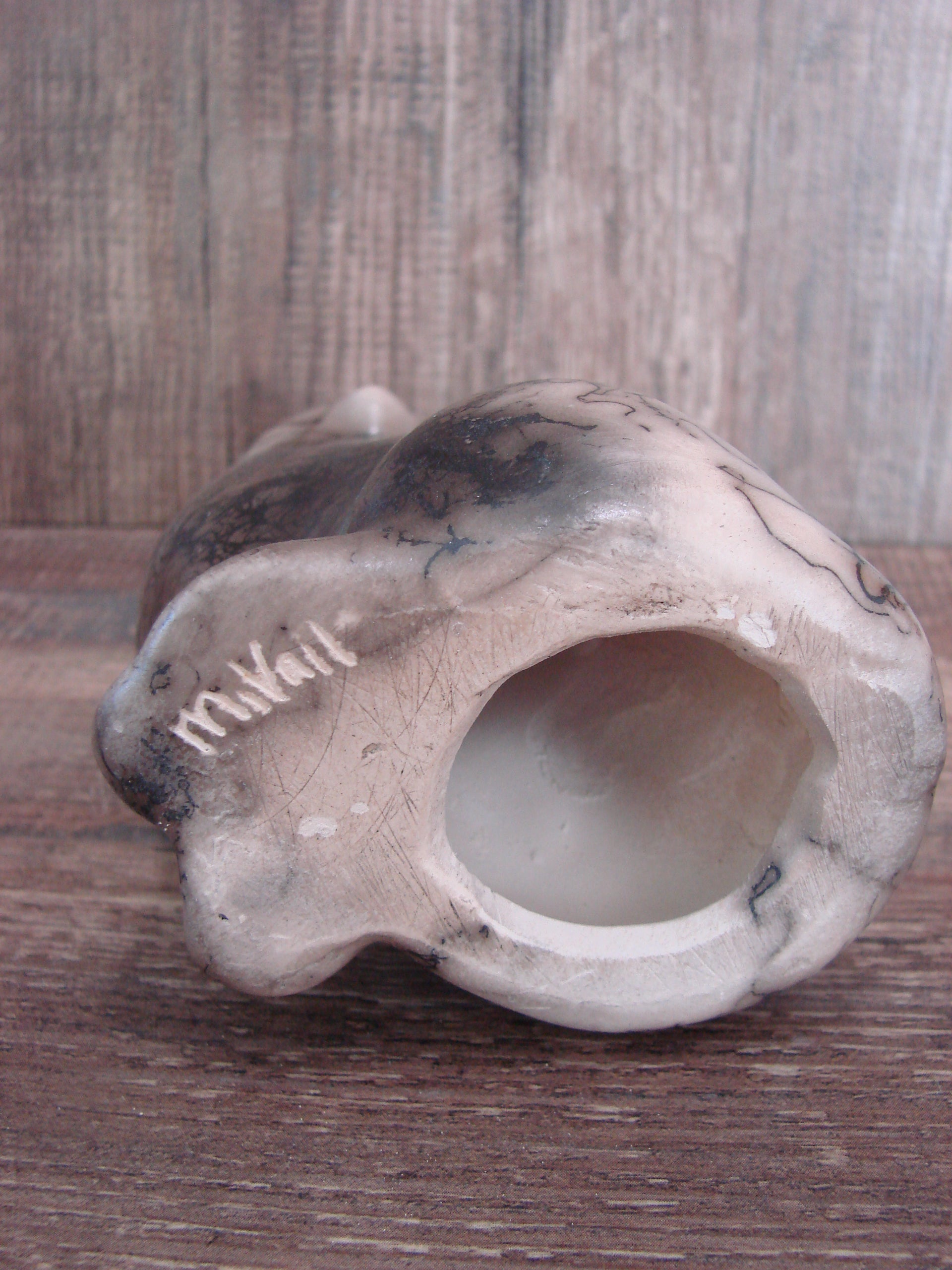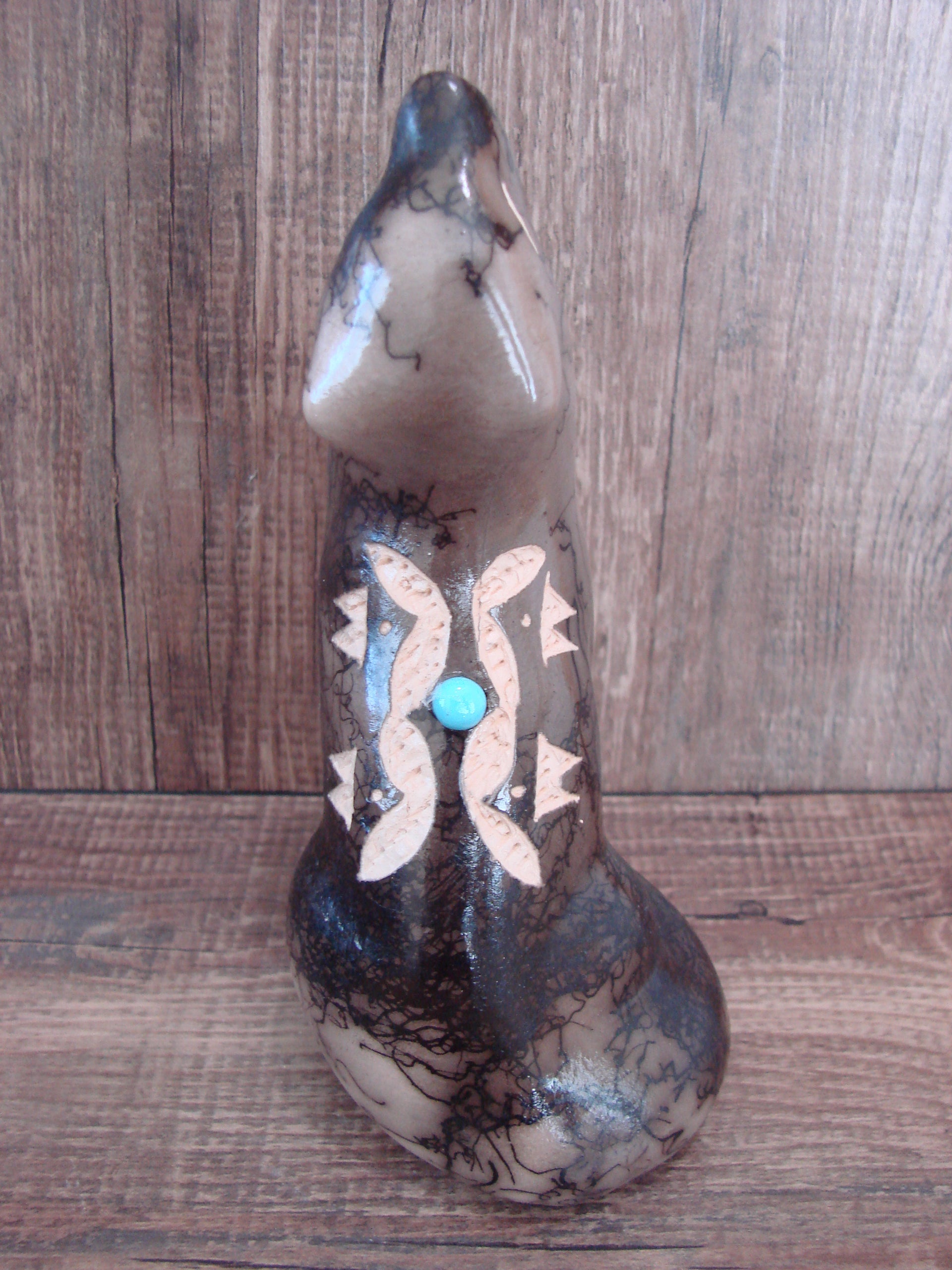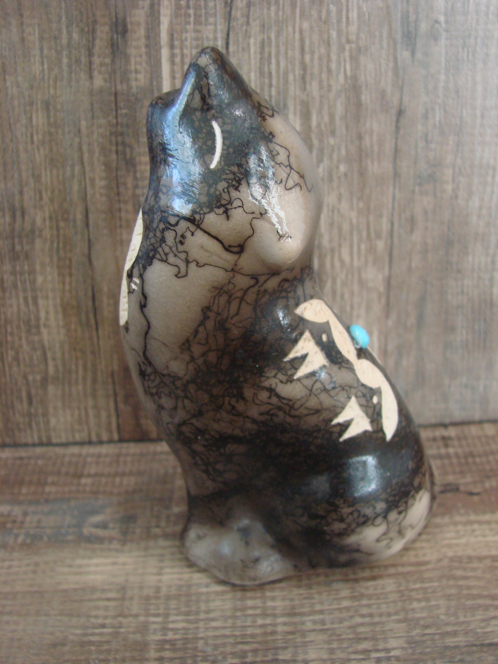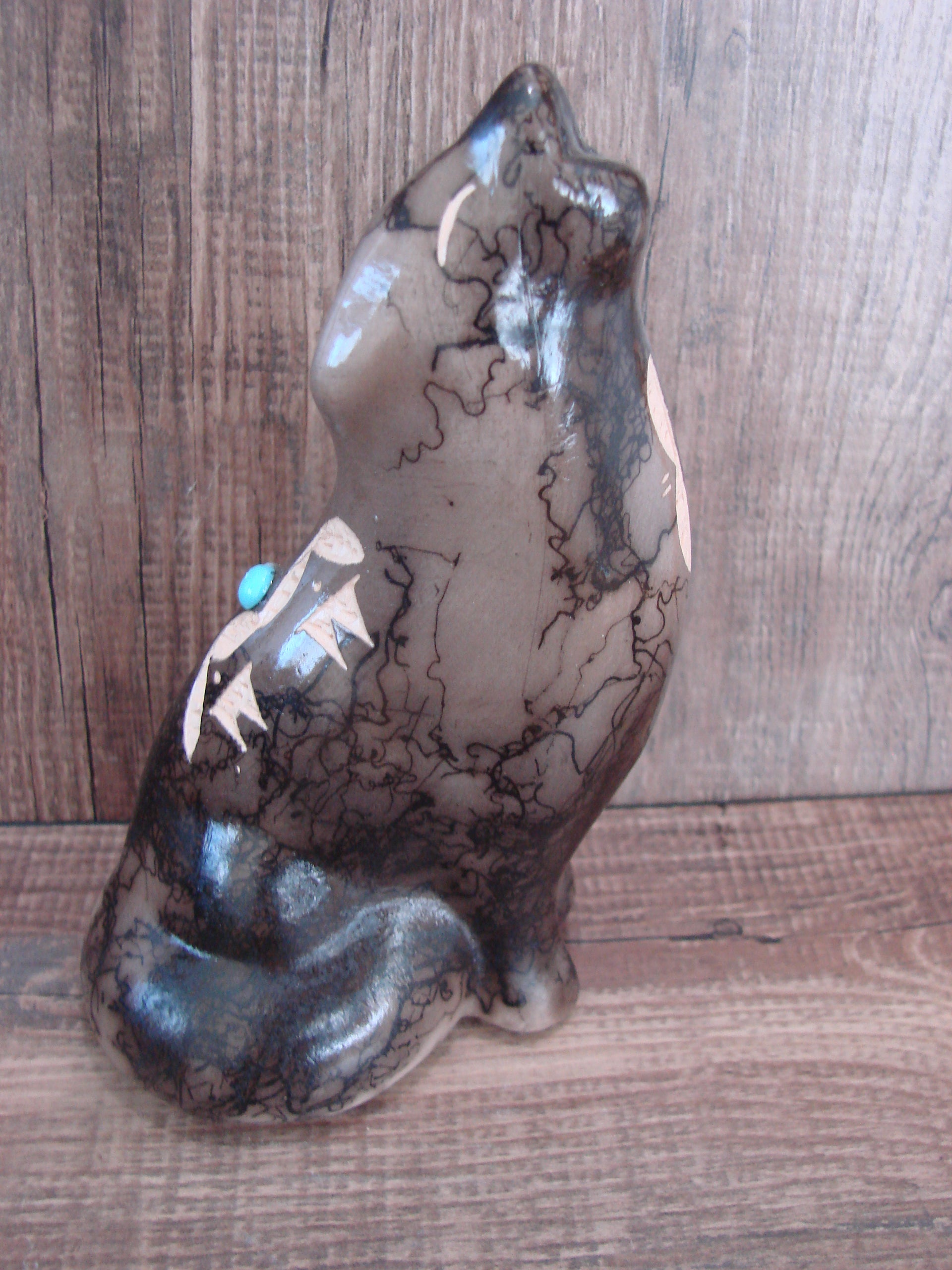 Native American Navajo Indian Horse Hair Howling Wolf Sculpture from Western New Mexico. This sculpture features beautiful horse hair and hand etching throughout. The Horse hair is laid over this piece during firing. The result is a unique one of a kind look. Hand etched by Navajo artist Vail. Signed on the bottom. Free shipping included!