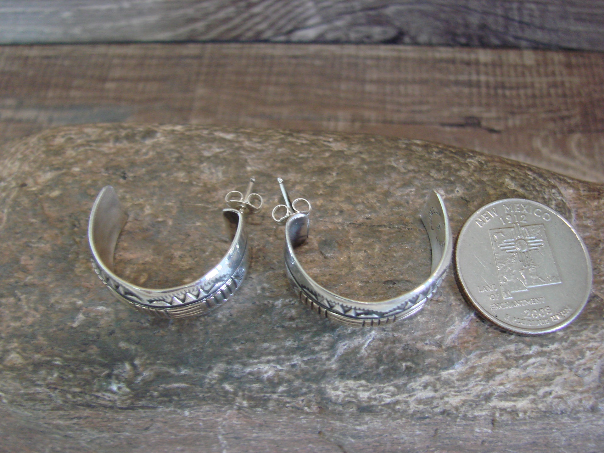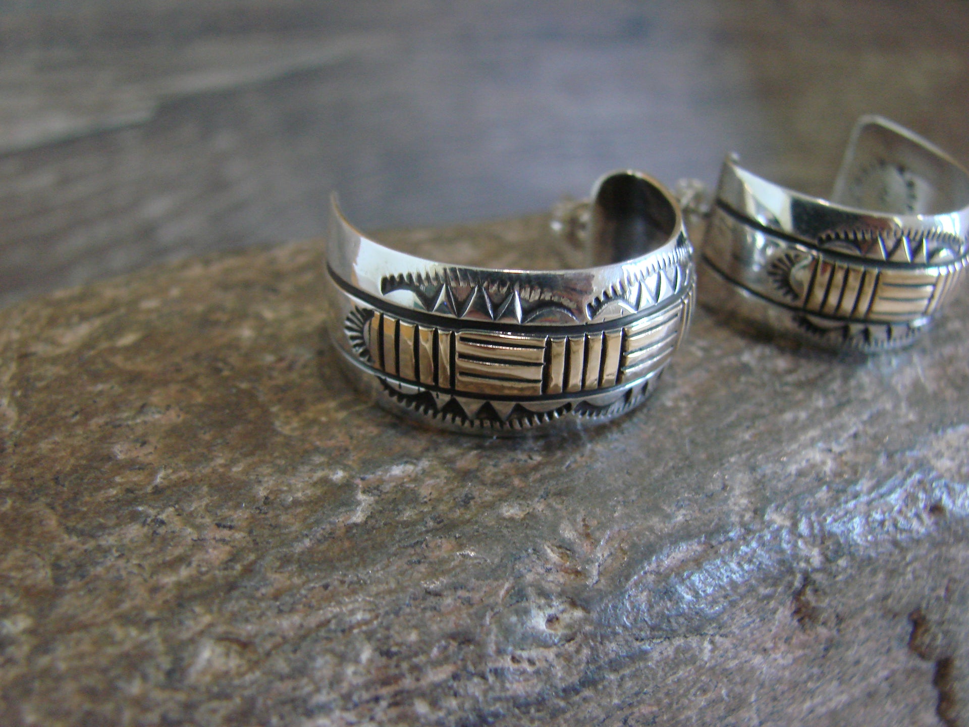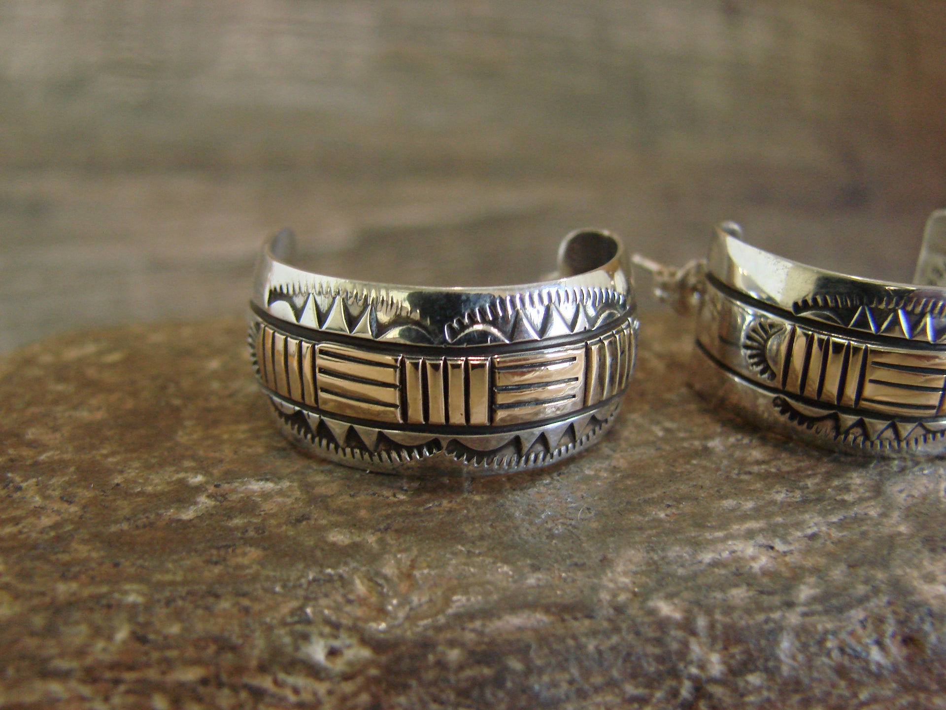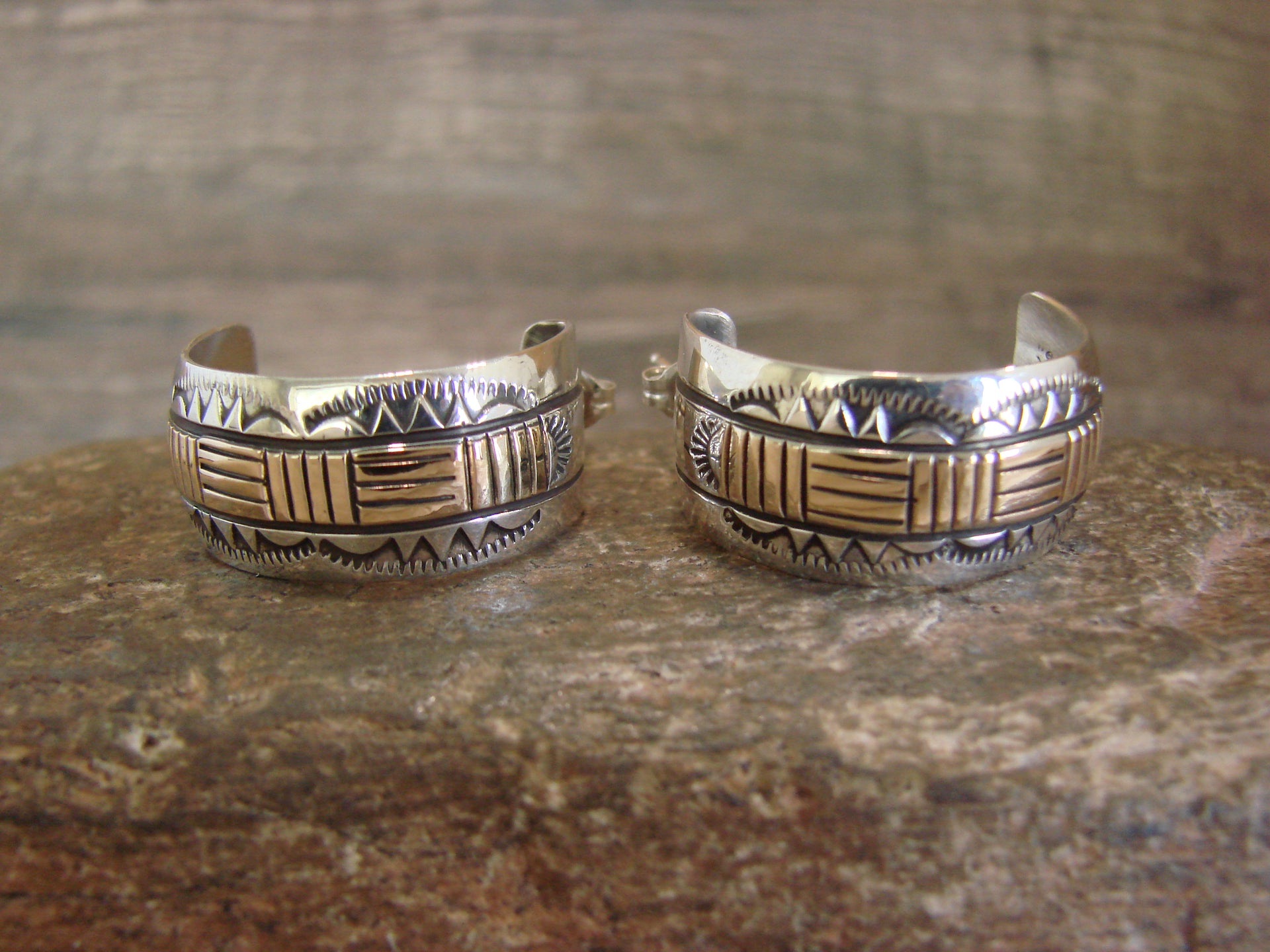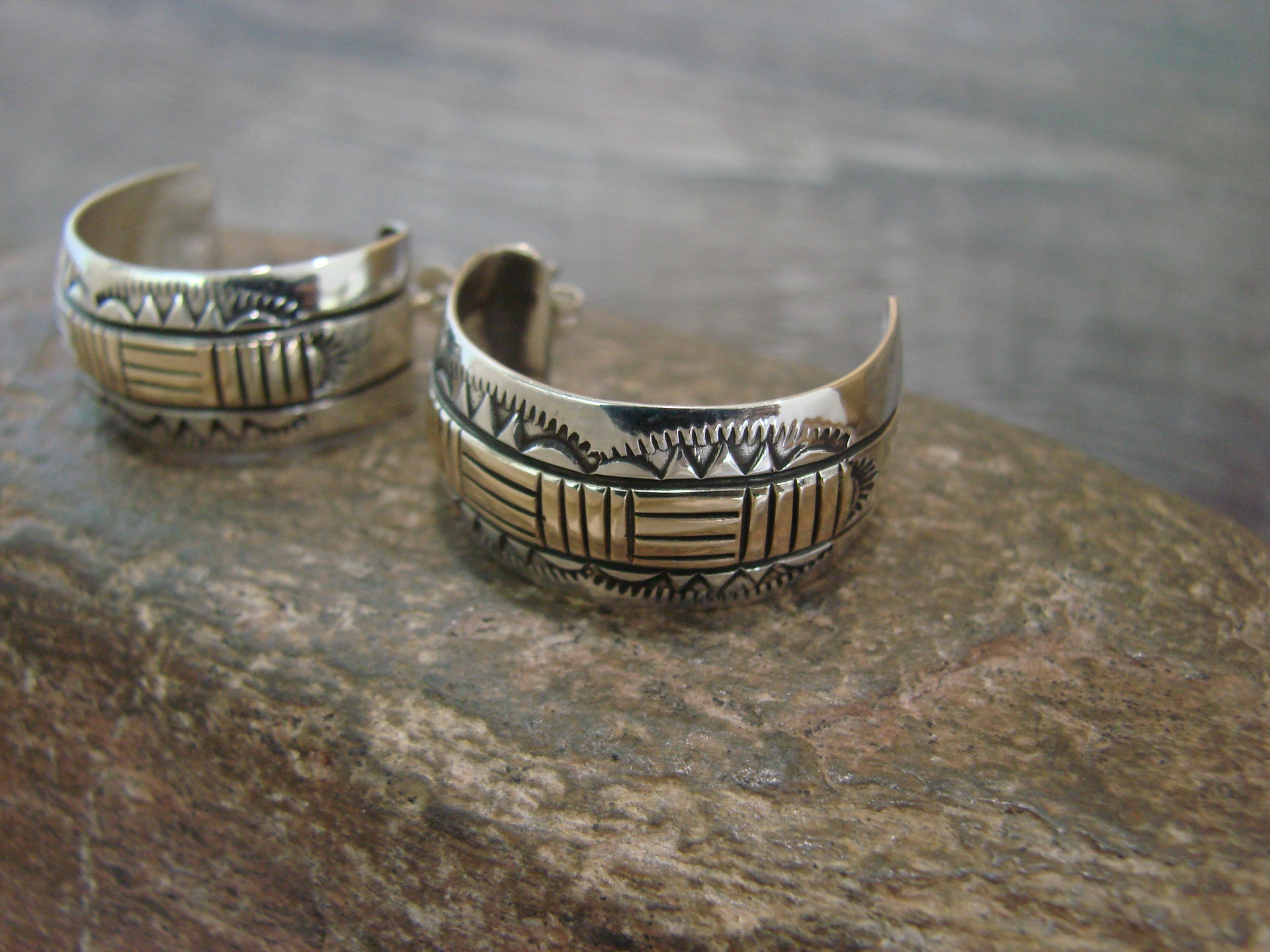 Native American Navajo Indian Sterling Silver & 14K Gold Half Hoop Earrings from Western New Mexico. These Stunning Earrings Feature beautifully Hand Stamped 14k Gold and Sterling Silver throughout. With a bright polish, these earrings have a great look! Handmade by Navajo artist Bruce Morgan. Signed "B Morgan", Stamped "Sterling", and "14K" on the back. Free Shipping with a Gift Box included!