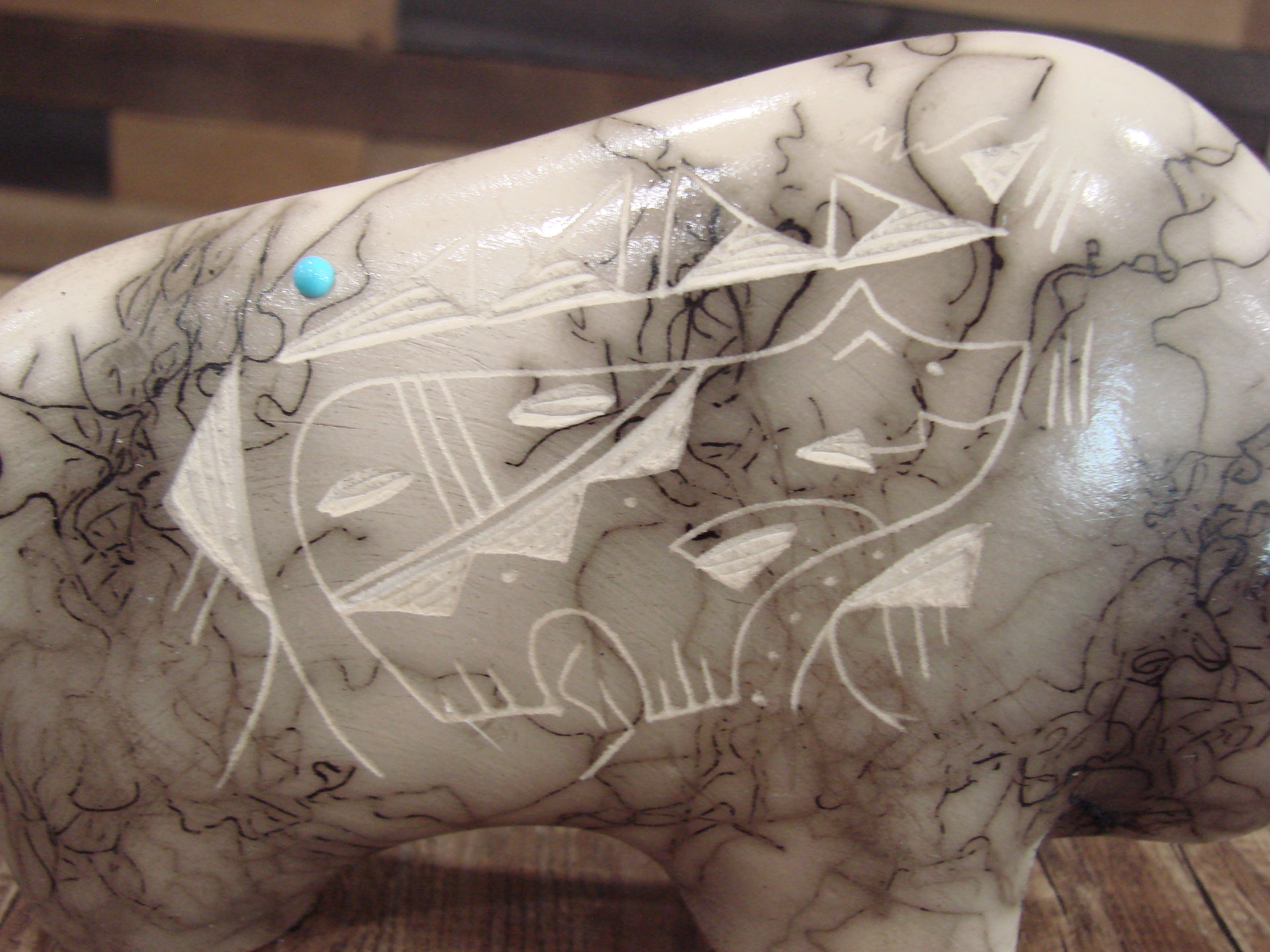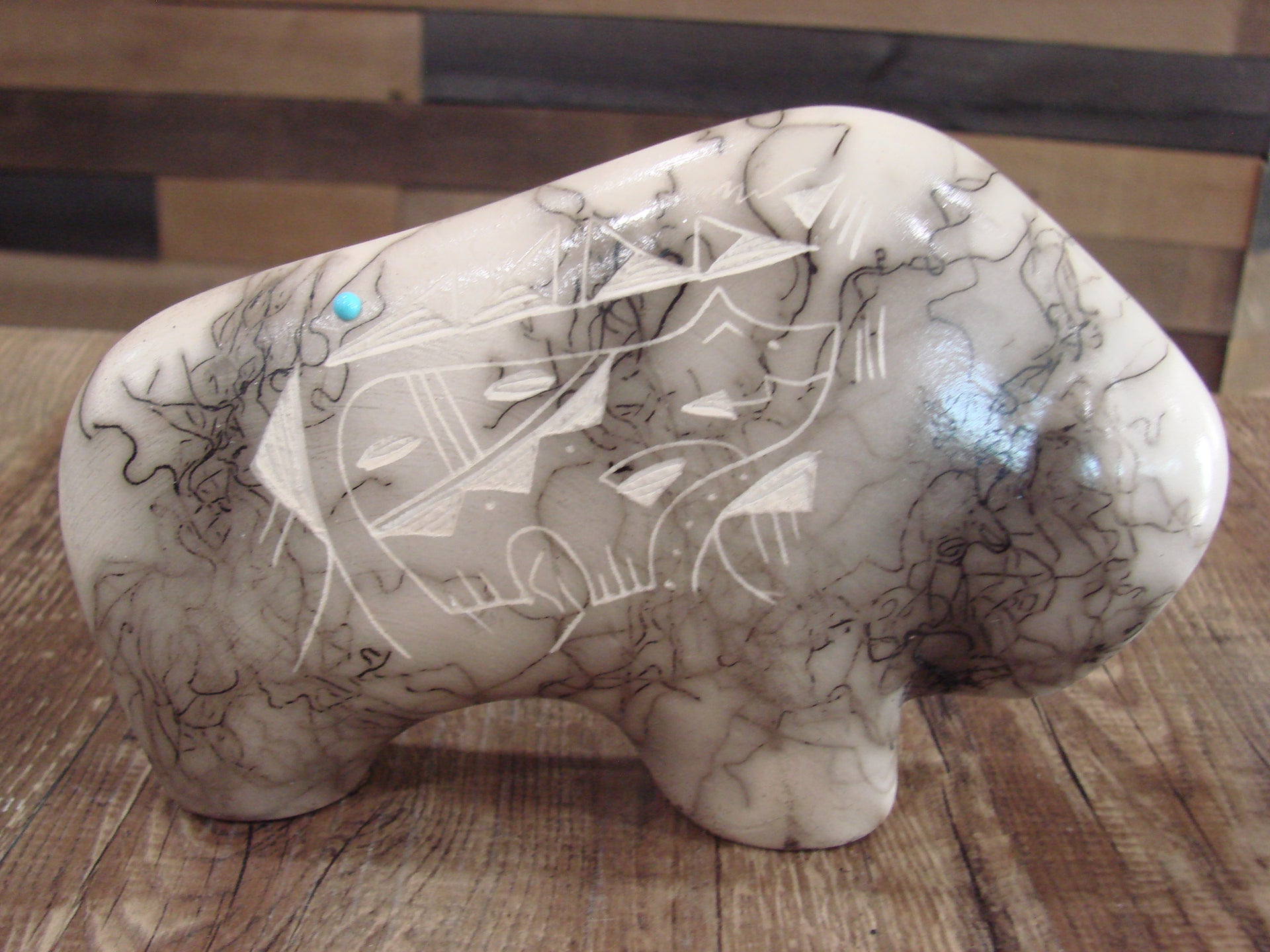 Genuine Native American Navajo Indian Horse Hair Buffalo Sculpture from Western New Mexico. This Small Bear sculpture features beautiful horse hair and Hand Etching throughout. The Horse hair is laid over this piece during firing, the result is a beautiful one of a kind look! Hand etched by Navajo artist Vail. Signed on the bottom. Free Shipping included!