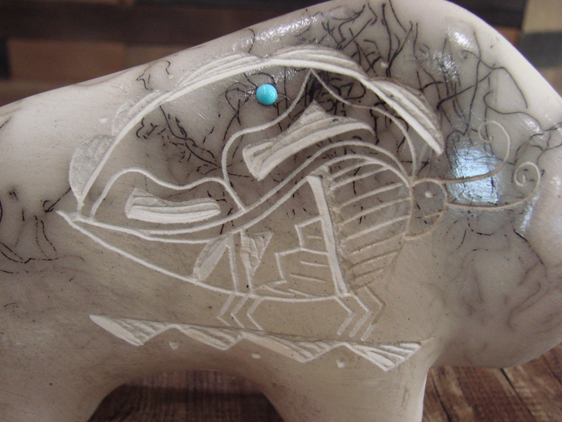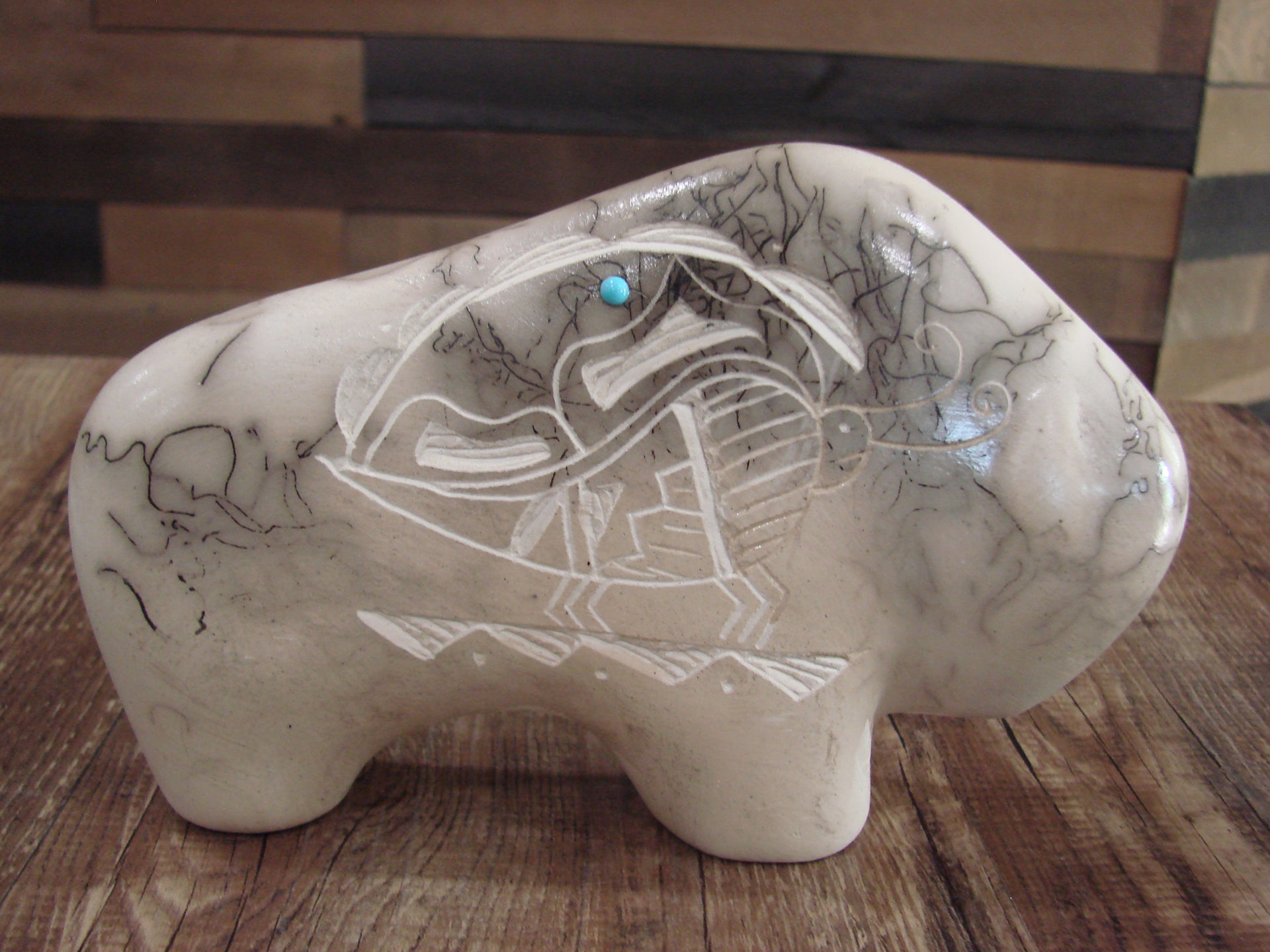Genuine Native American Navajo Indian Horse Hair Buffalo Sculpture from Western New Mexico. This Small Bear sculpture features beautiful horse hair and Hand Etching throughout. The Horse hair is laid over this piece during firing, the result is a beautiful one of a kind look! Hand etched by Navajo artist Vail. Signed on the bottom. Free Shipping included!