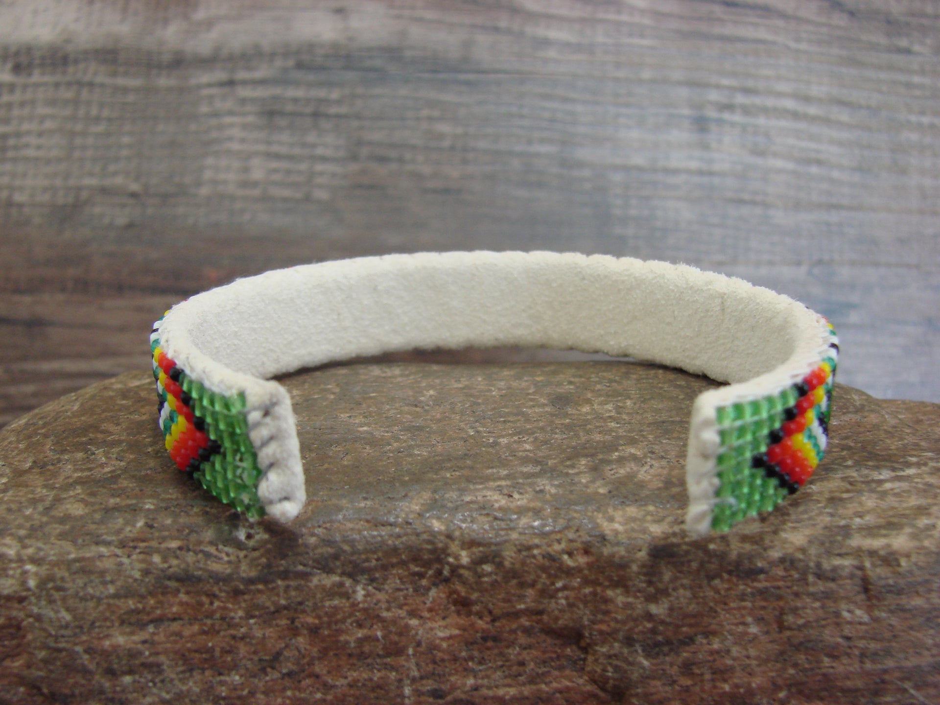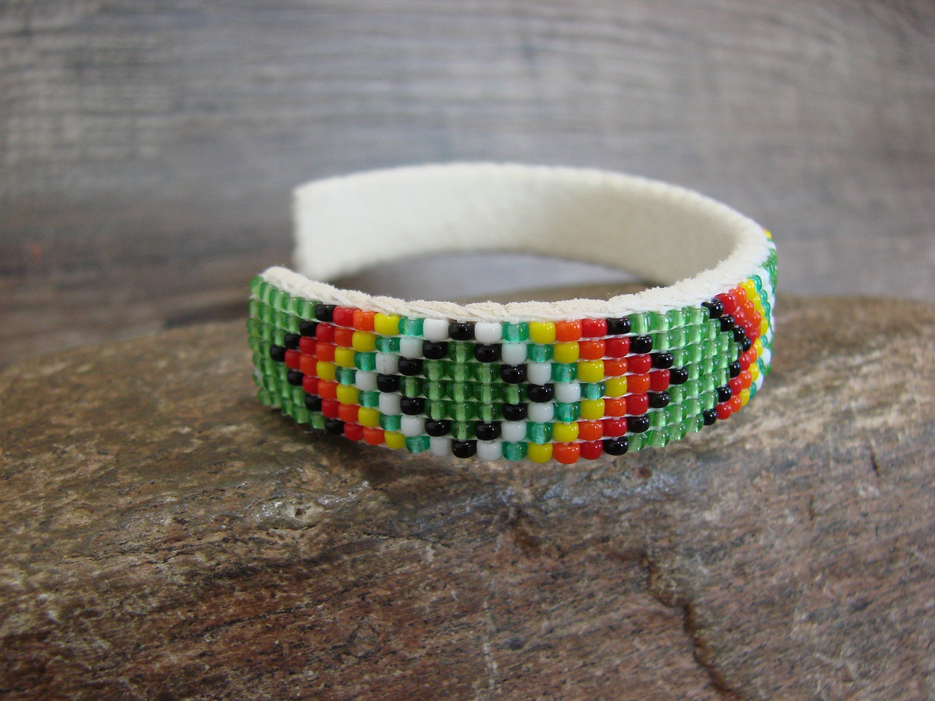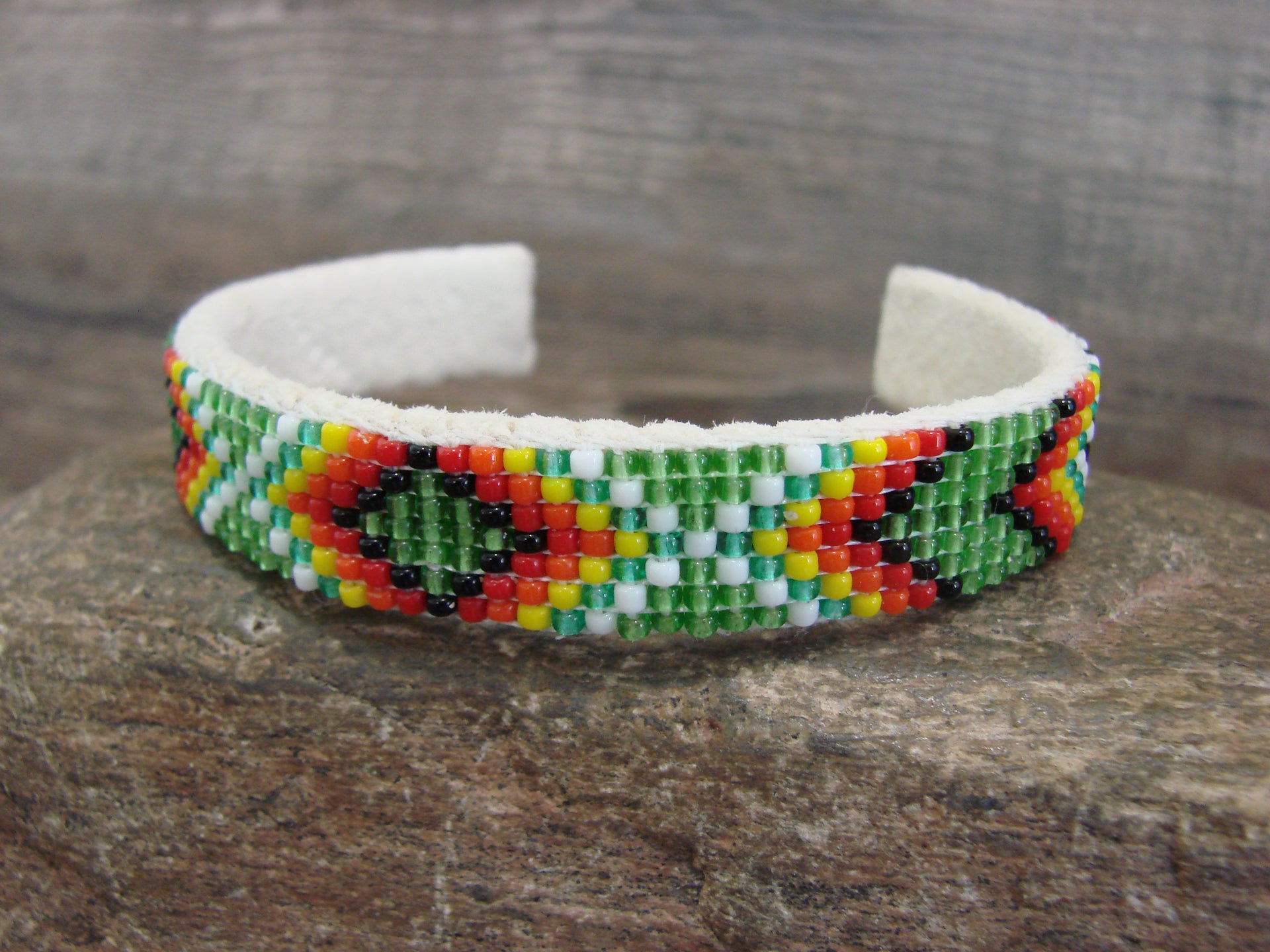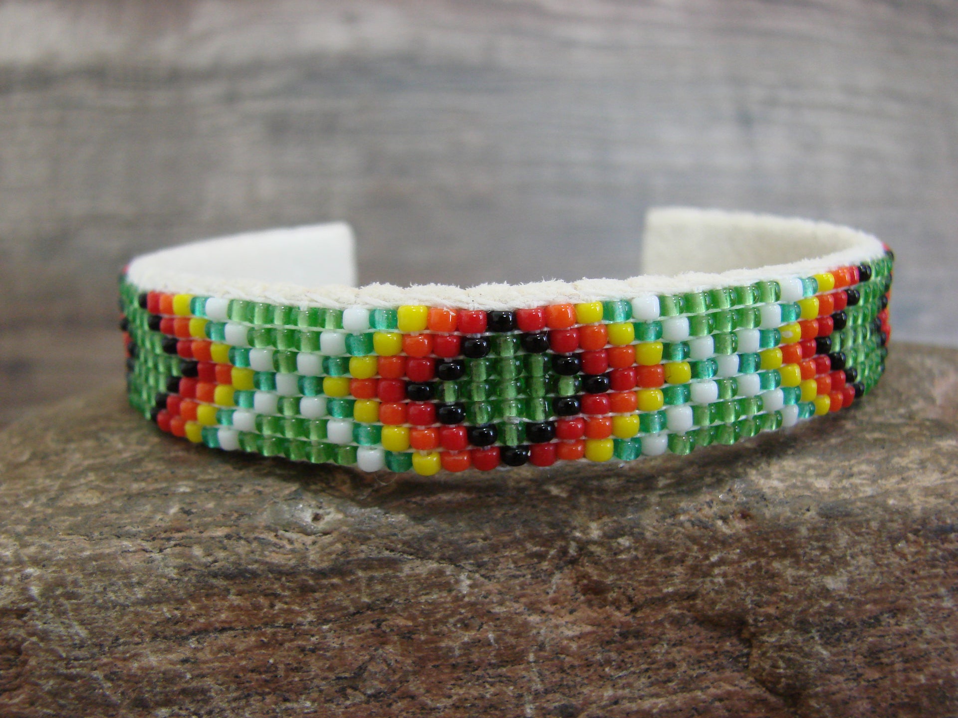 Genuine Native American Navajo Indian Hand Beaded Bracelet from Western New Mexico. This bracelet features a beautiful hand beaded design throughout. The bracelet is very colorful and has a great look. This bracelet can easily be adjusted to fit different sized wrists. The inside is lined with white leather. Navajo Indian handmade by Jacklyn Cleveland. The back is unsigned. Free shipping and gift box included!