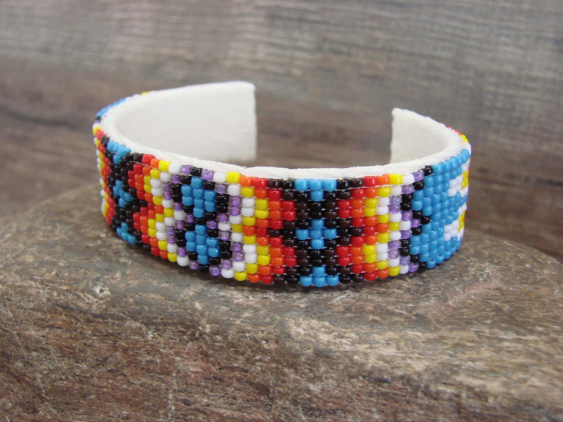 Genuine Native American Navajo Indian Hand Beaded Bracelet from Western New Mexico. This bracelet features a beautiful hand beaded design throughout. The bracelet is very colorful and has a great look. This bracelet can easily be adjusted to fit different sized wrists. The inside is lined with white leather. Navajo Indian handmade by Jacklyn Cleveland. The back is unsigned. Free shipping and gift box included!