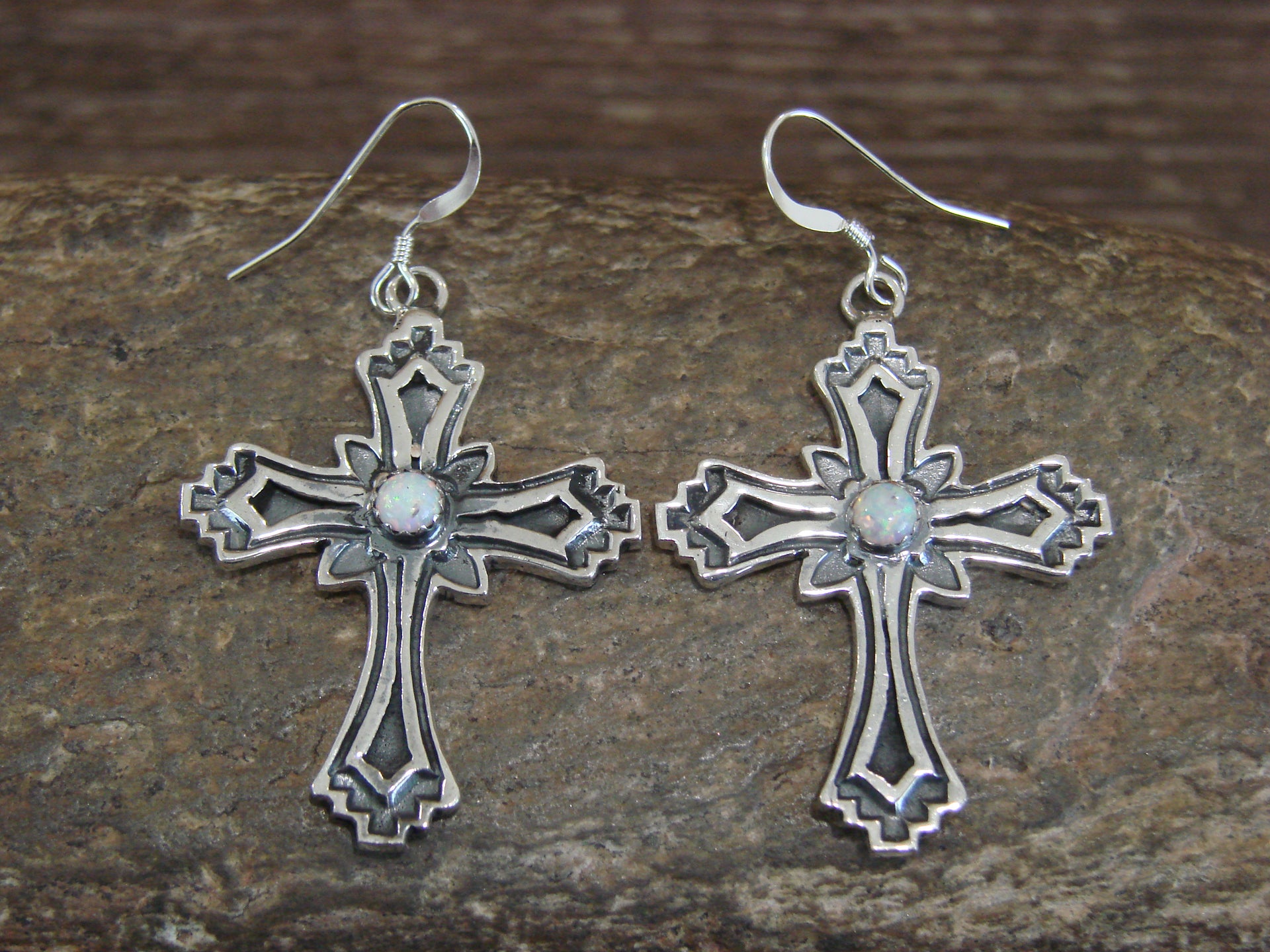 Native American Navajo Indian Sterling Silver & White Opal Cross Earrings from Western New Mexico. These earrings are beautifully hand stamped and cast from .925 Sterling Silver. The crosses are nicely polished and have a great look! Handmade by Navajo artist Louise Joe. The back is Hallmarked and Stamped 0.925. Free Shipping with a Gift Box included!