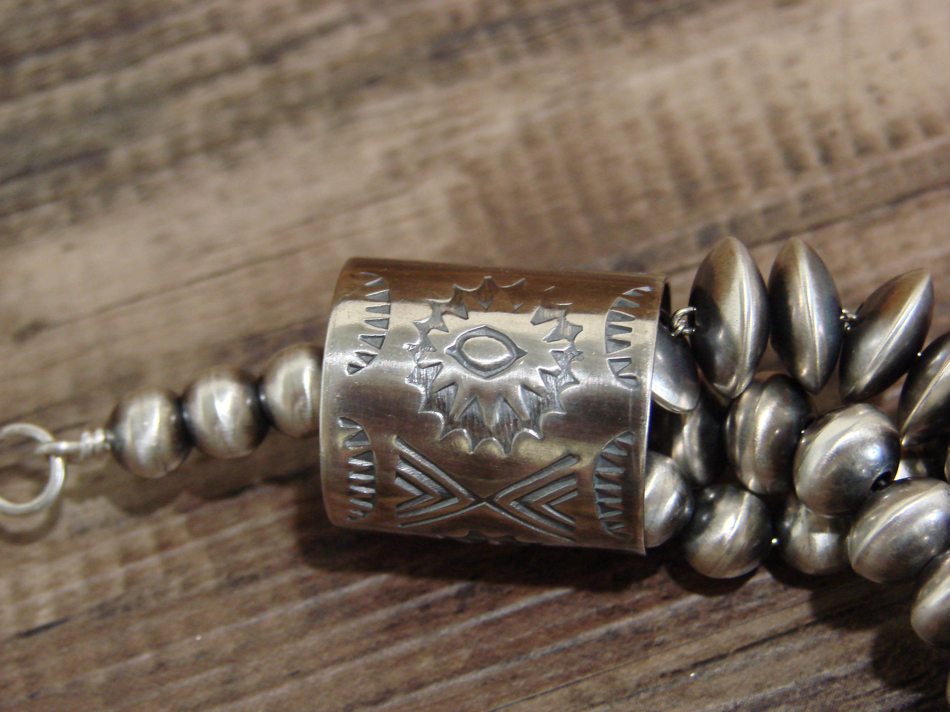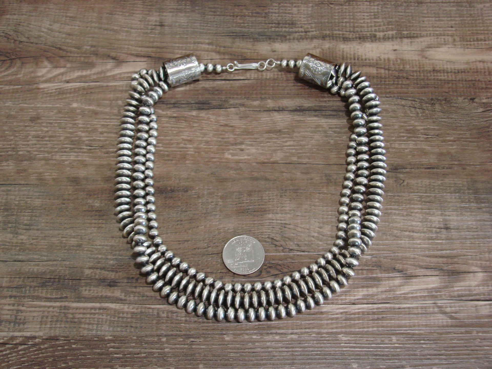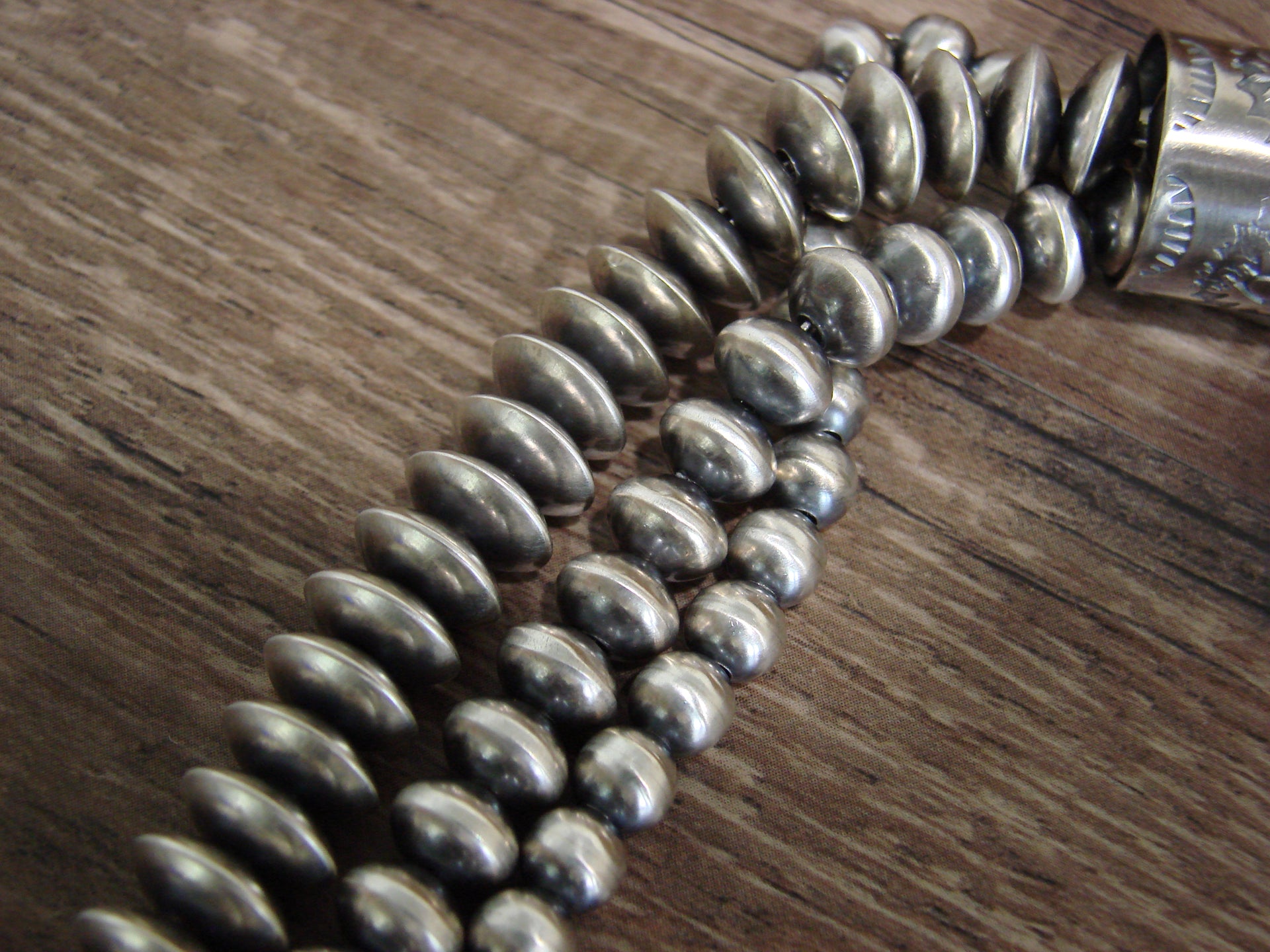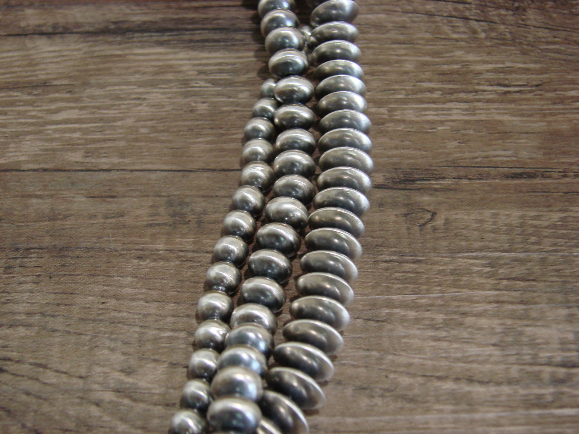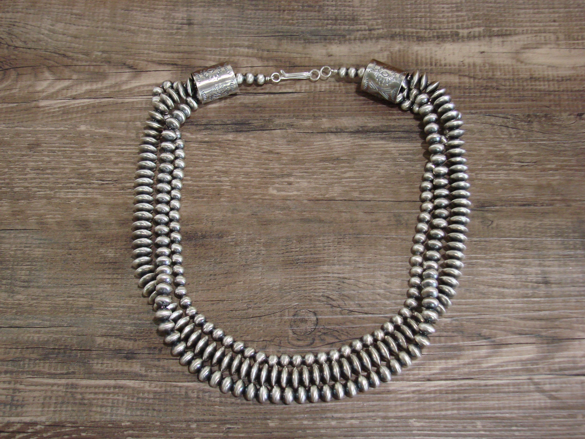 Genuine Native American Navajo Indian Hand Strung Sterling Silver Multi Strand Navajo Pearl Necklace from Western New Mexico. This Stunning Necklace features 3 beautiful Strands of 10mm, 8mm, and 6mm Sterling Silver Navajo Pears. These Pearls are Genuine, Hand Strung, and Gorgeous! Expertly Hand Made to Perfection! Hand strung by Navajo Indian artist Rena Begay. Signed "R. Begay" and Stamped "Sterling" on the very top Hand Stamped Bead. Free shipping and gift box included!