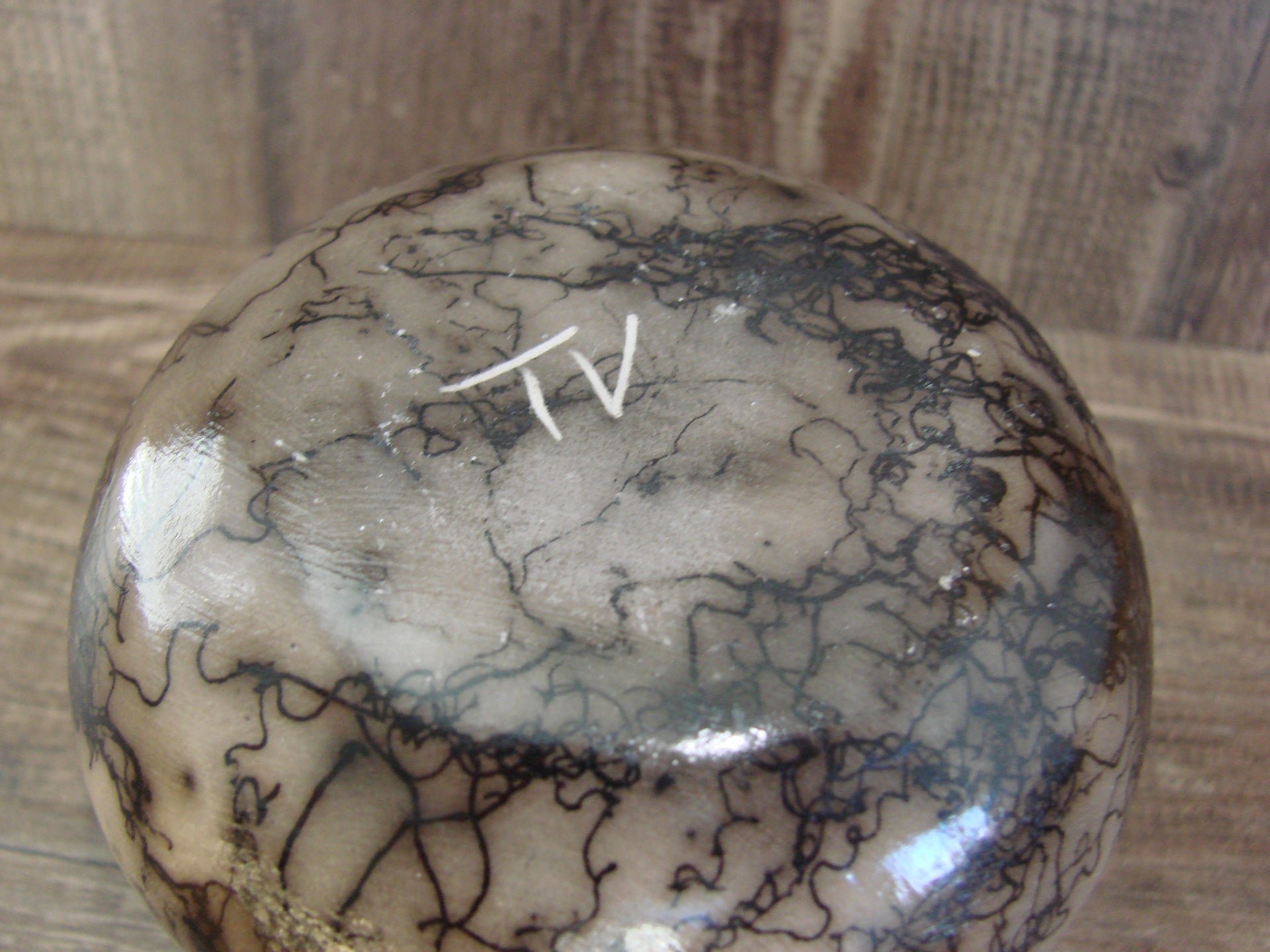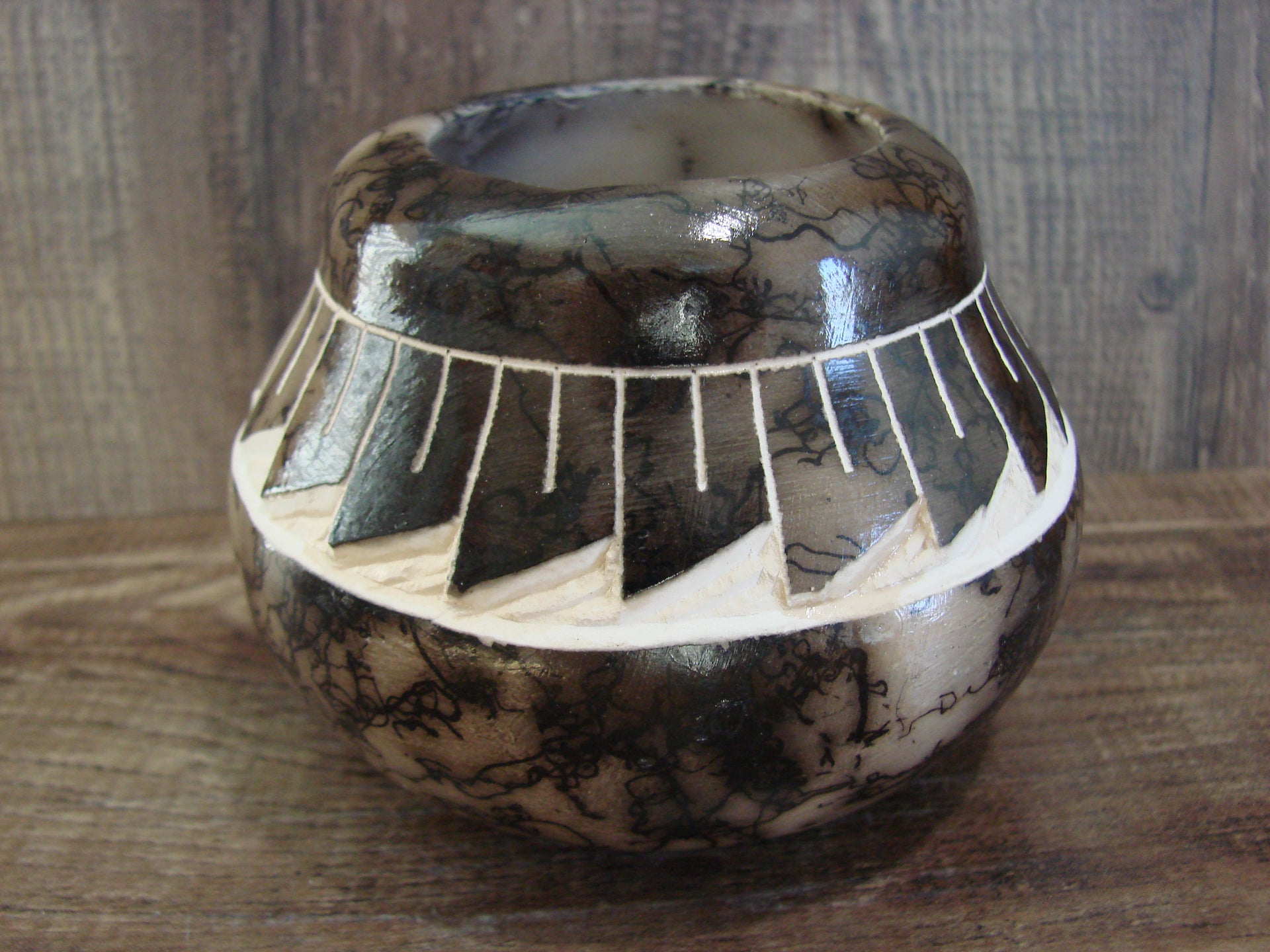 Genuine Native American Navajo Indian Horse Hair Pottery from Western New Mexico. This small piece of pottery features beautiful horse hair throughout. The Horse hair is laid over this piece during firing. The result is a unique one of a kind look. Hand etched by Navajo artist Tom Vail Jr. Signed on the bottom. Free Shipping included!
