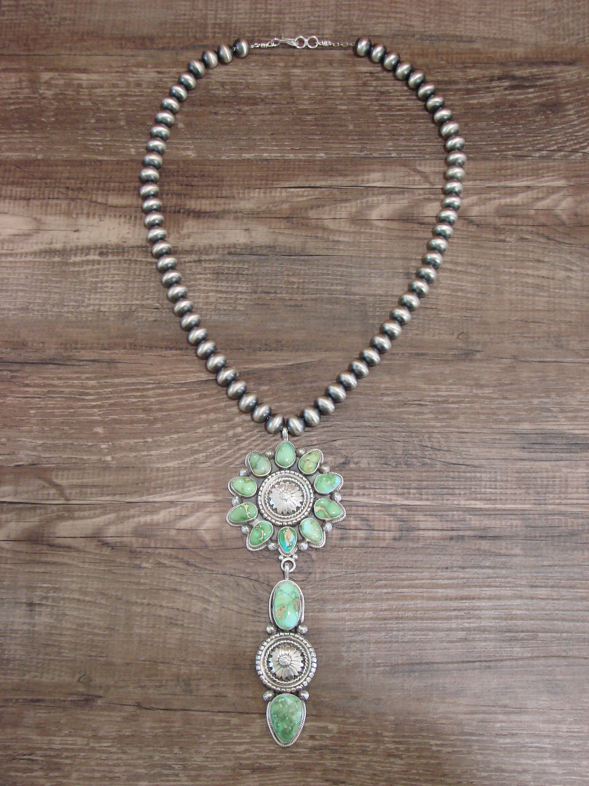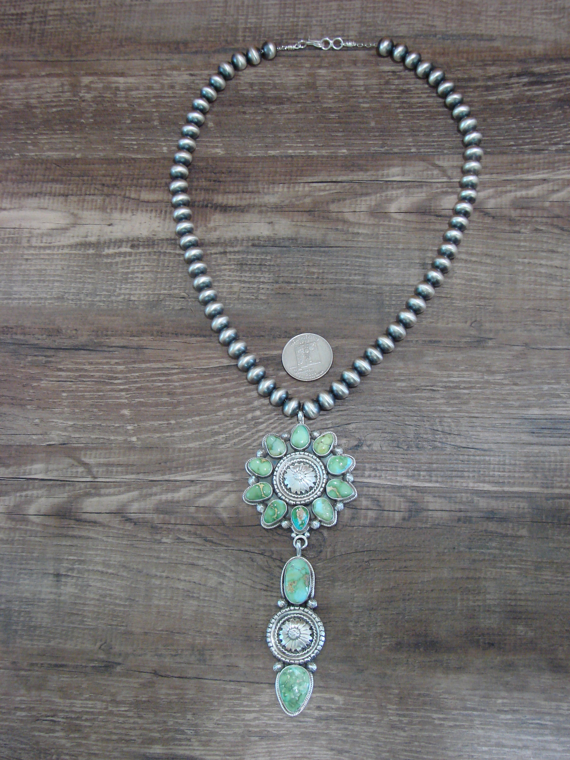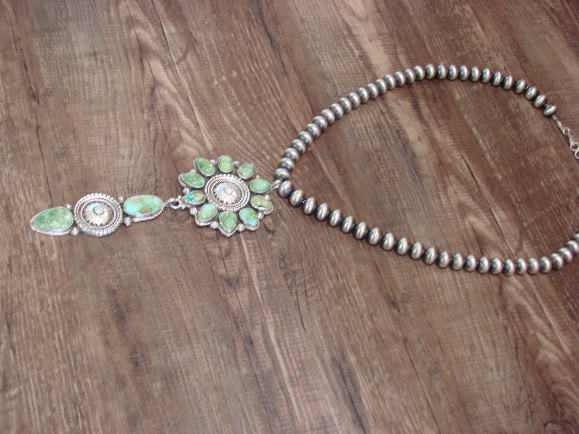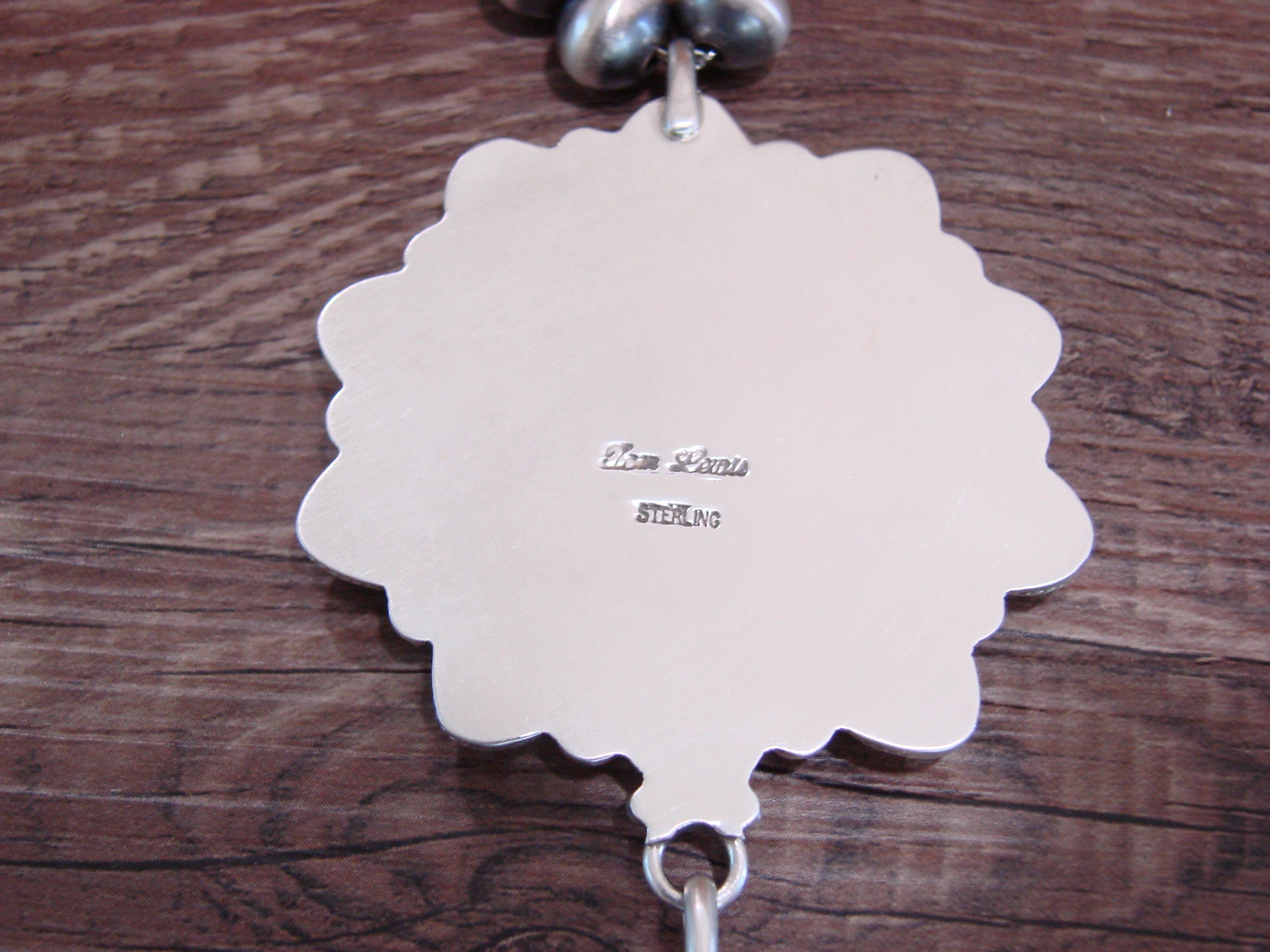 Genuine Native American Navajo Indian Sterling Silver & Sonoran Turquoise Navajo Pearl Necklace from Western New Mexico. This Stunning Necklace features a cluster of Genuine Sonoran Turquoise stones beautifully set into smooth Sterling Silver bezel settings. Hand Stamping and Gorgeous details in Sterling Silver surround the Stones. Hand Made to Perfection, this piece dangles at the center of an 21", 10mm String of Navajo Pearls! Handmade by Navajo Silversmith Tom Lewis. Signed "Tom Lewis" and Stamped "Sterling" on the back.