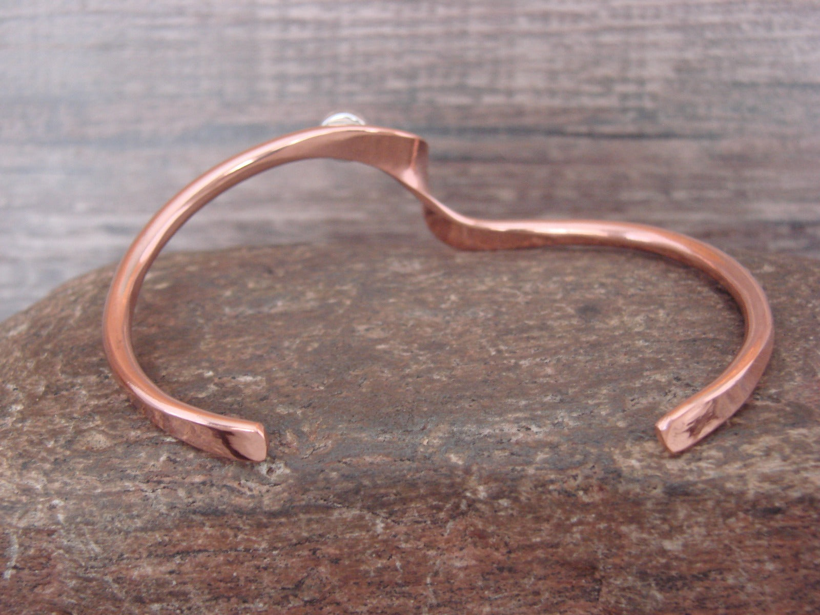 Native American Navajo Indian Turquoise & Copper Bracelet from Western New Mexico. This bracelet features twisted copper centered with a Turquoise stone. Customers often buy more than one of these wonderful bracelets since they are stackable. This is a very nice bracelet! Hand made by Navajo Silversmith Skeets. Signed "Skeets" on the inside. Free shipping in a gift box included!