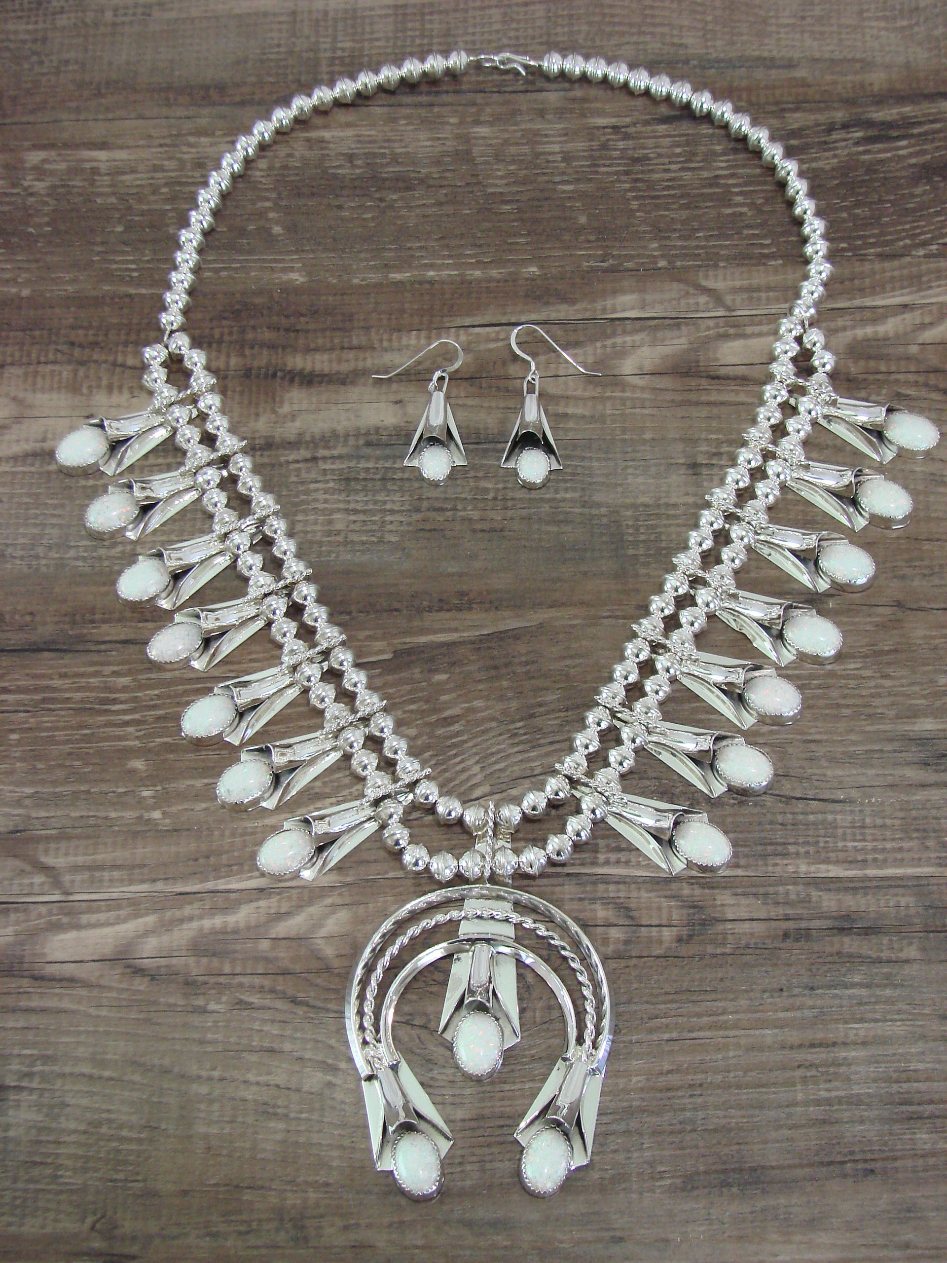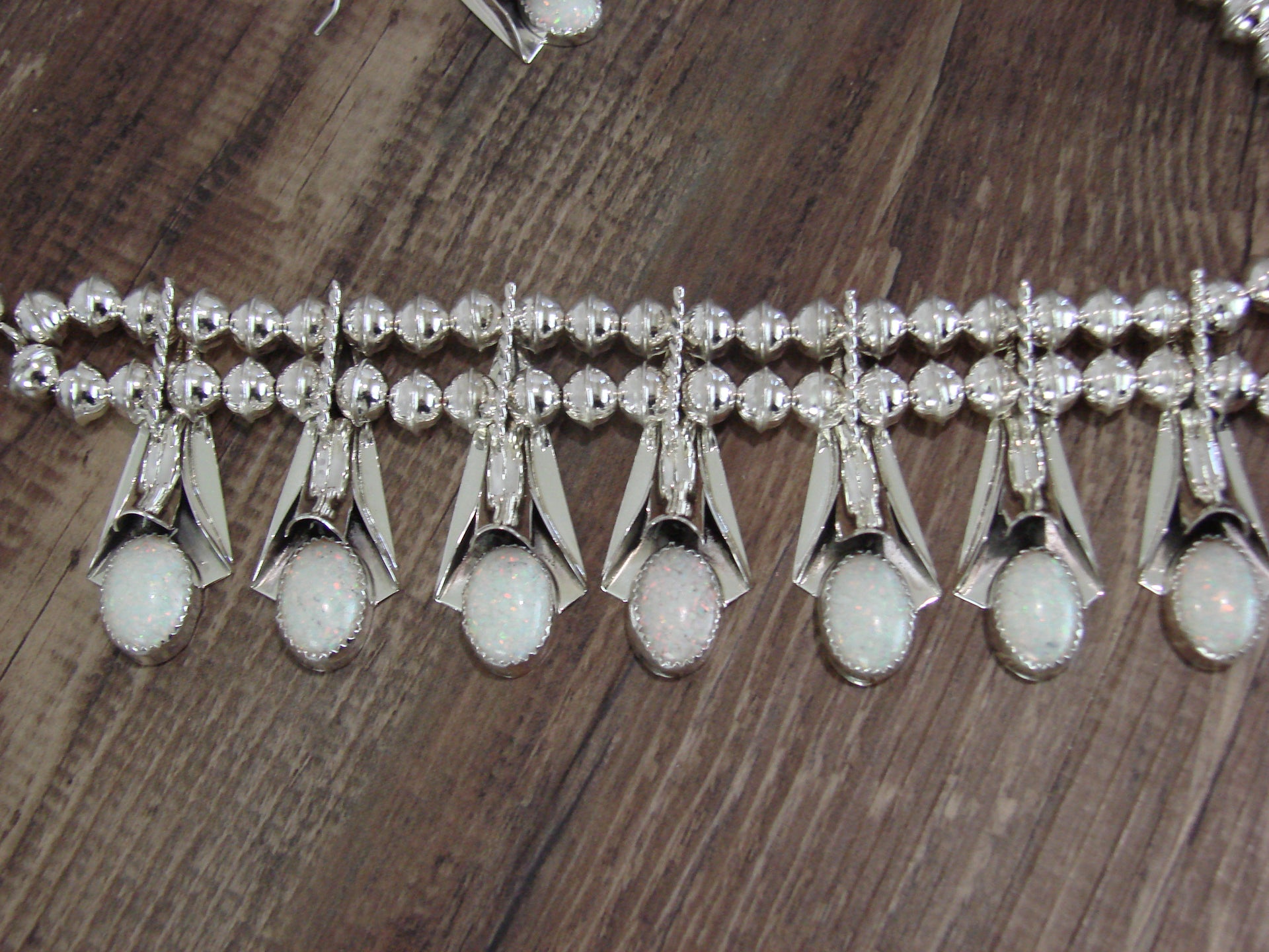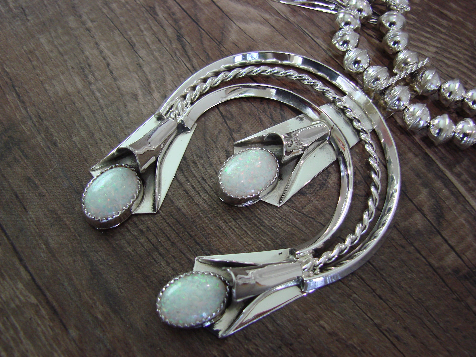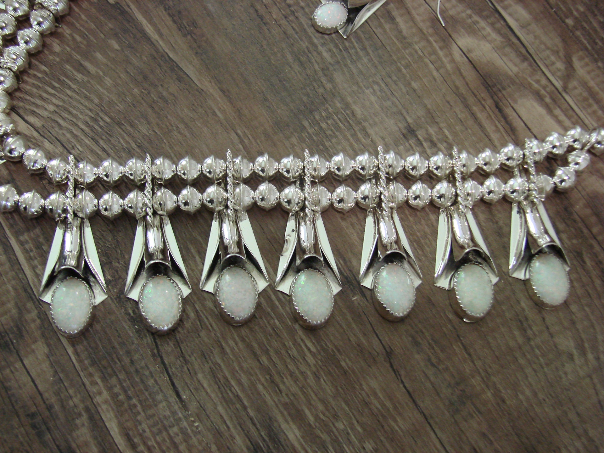 Genuine Native American Navajo Indian Sterling Silver & Opal Squash Blossom Necklace and Earring Set from Western New Mexico. This traditional style Necklace features Stunning, White Opal stones. Each Stone is beautifully set into a crown Sterling Silver bezel setting. Smooth Sterling Silver and Navajo Pearls surround the Stones. Made to Perfection, this piece is a Handmade masterpiece! Handmade by Navajo Silversmith Louise Yazzie. Signed "LY" and Stamped "Sterling" on the back. Free Shipping included!
