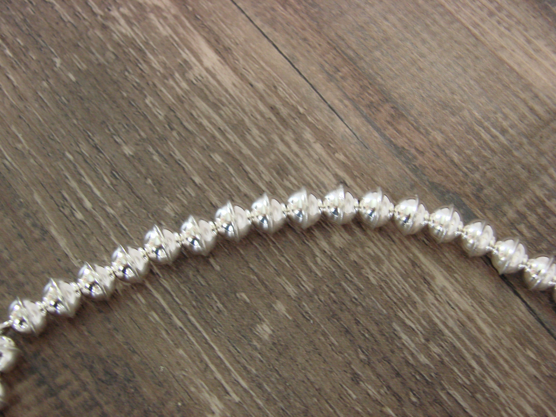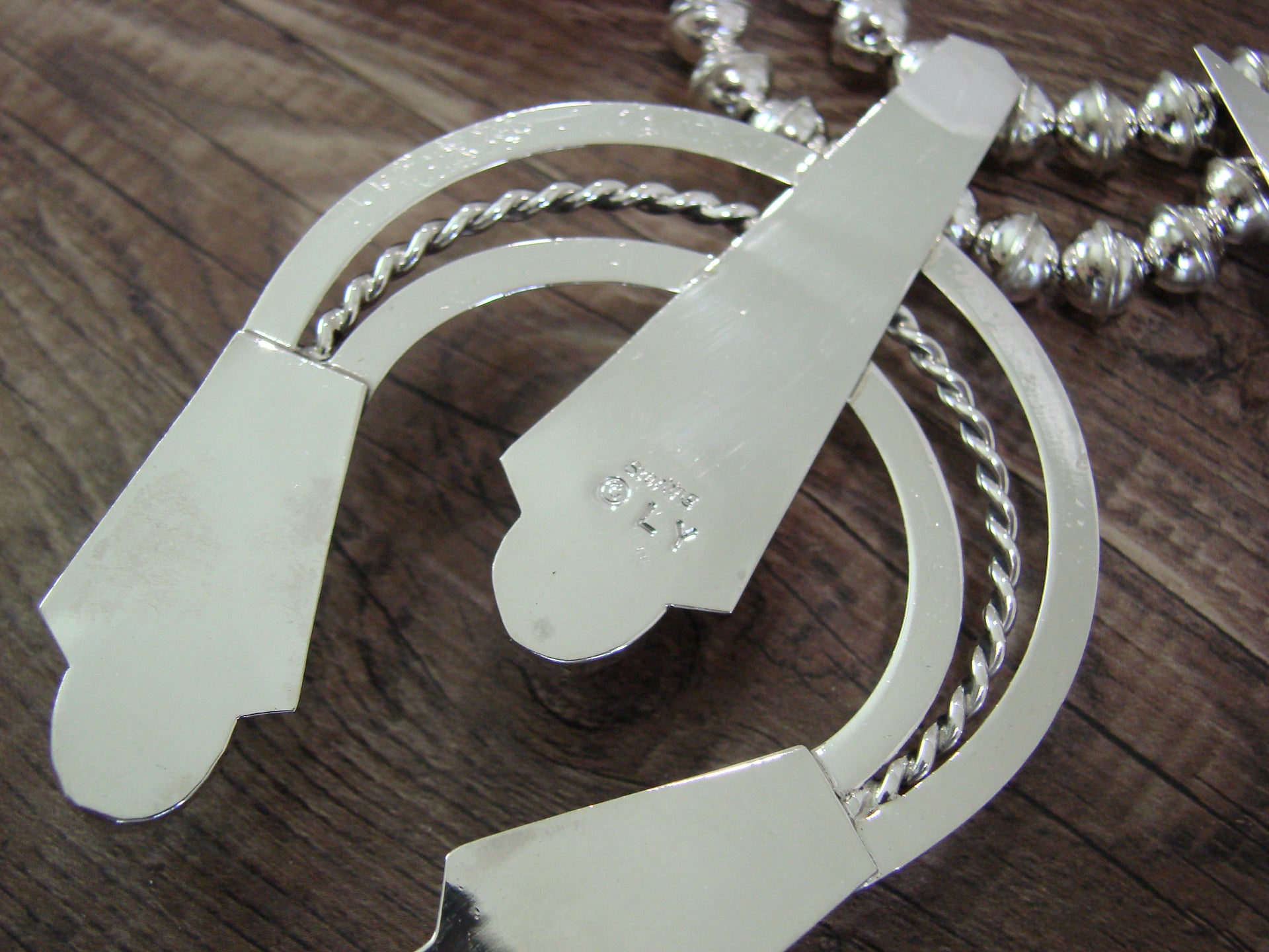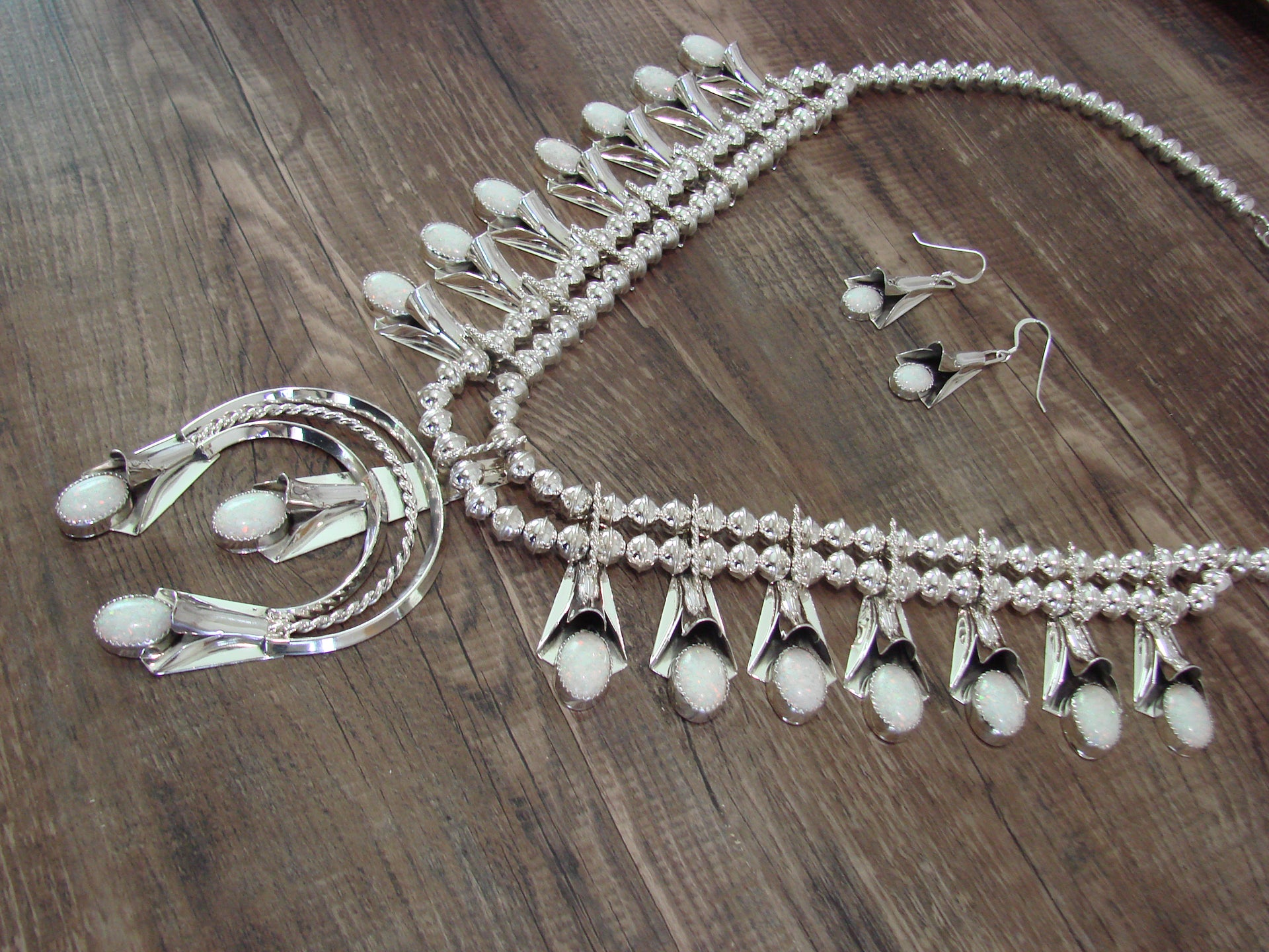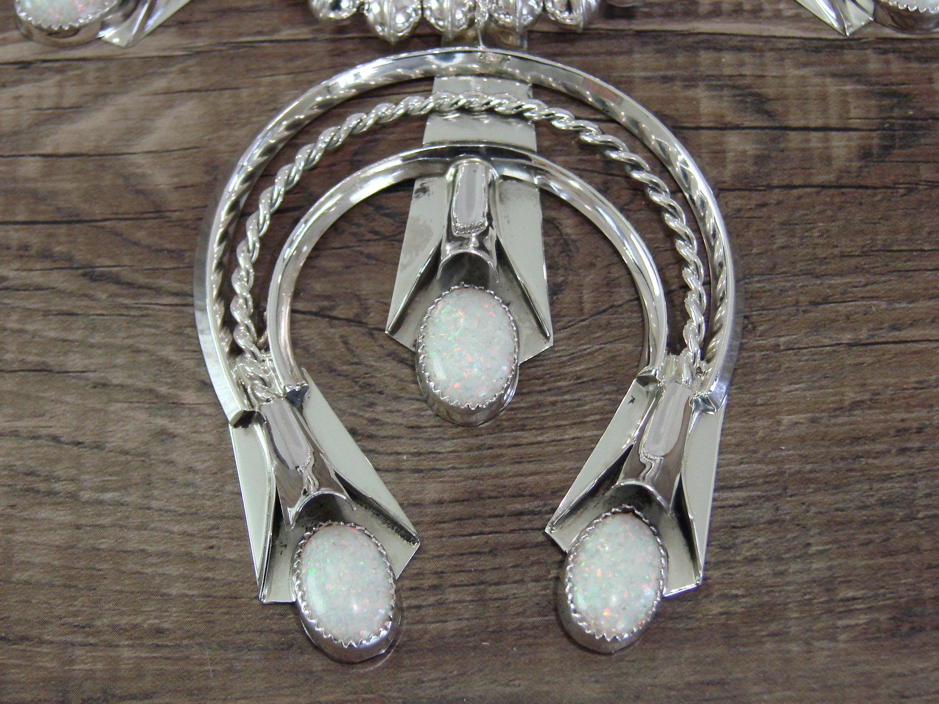 Genuine Native American Navajo Indian Sterling Silver & Opal Squash Blossom Necklace and Earring Set from Western New Mexico. This traditional style Necklace features Stunning, White Opal stones. Each Stone is beautifully set into a crown Sterling Silver bezel setting. Smooth Sterling Silver and Navajo Pearls surround the Stones. Made to Perfection, this piece is a Handmade masterpiece! Handmade by Navajo Silversmith Louise Yazzie. Signed "LY" and Stamped "Sterling" on the back. Free Shipping included!