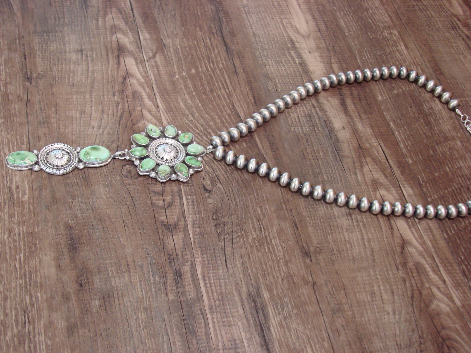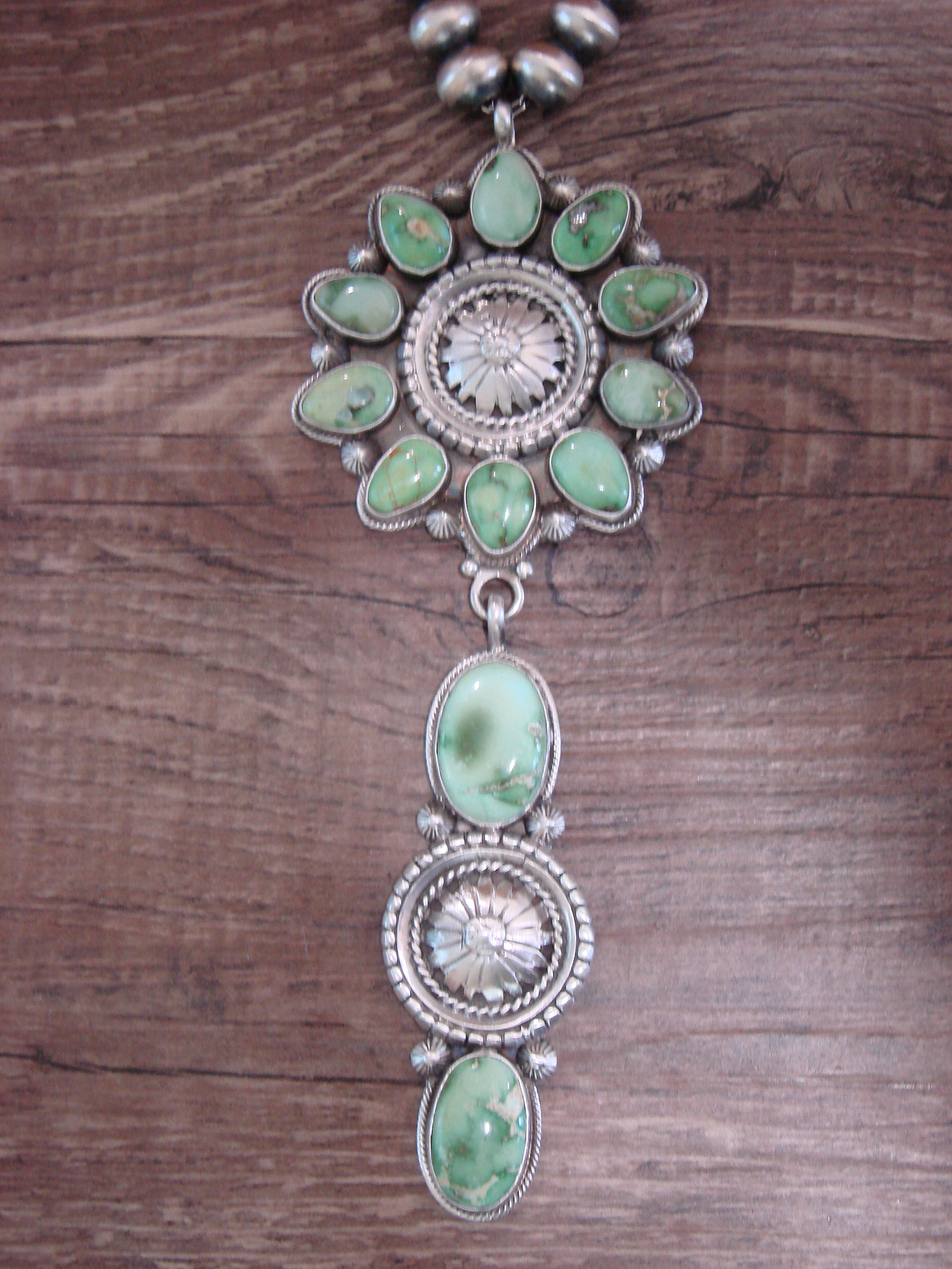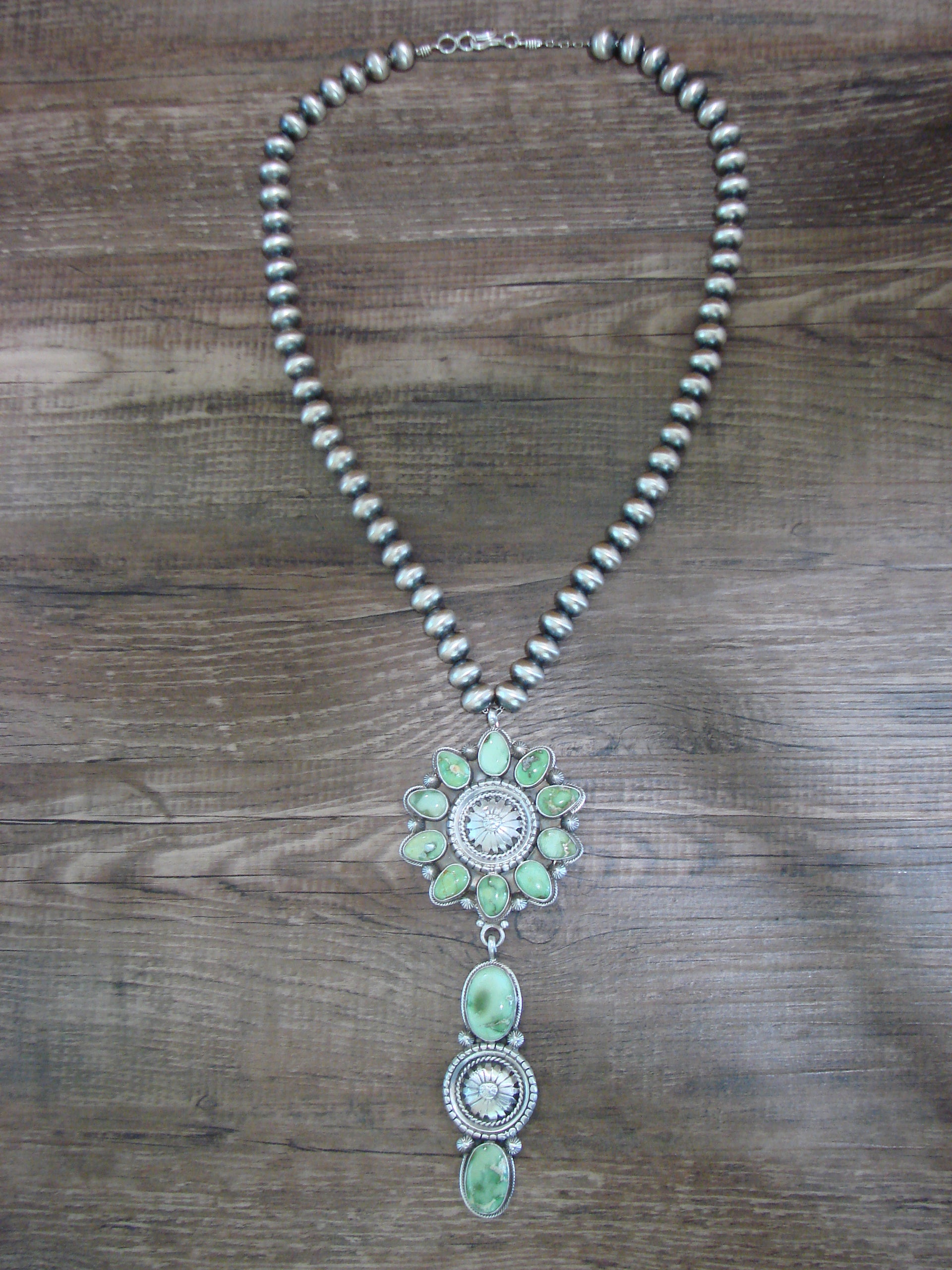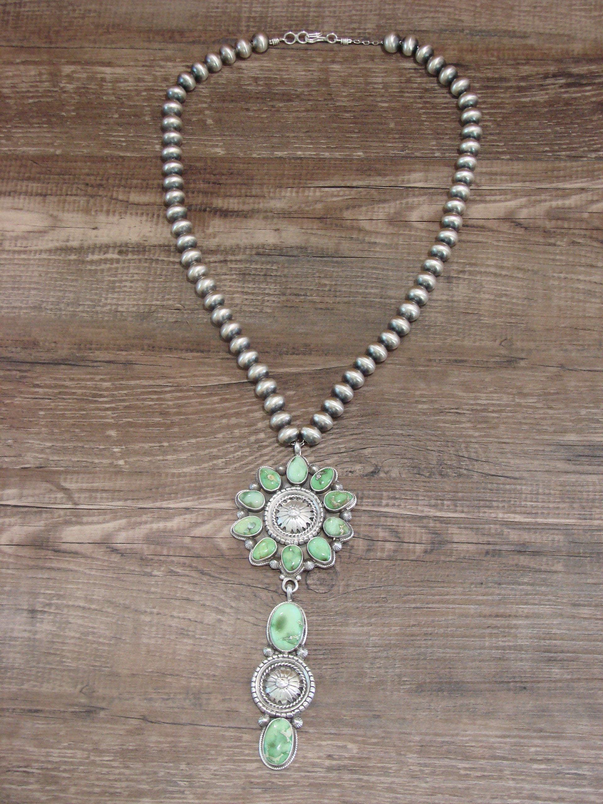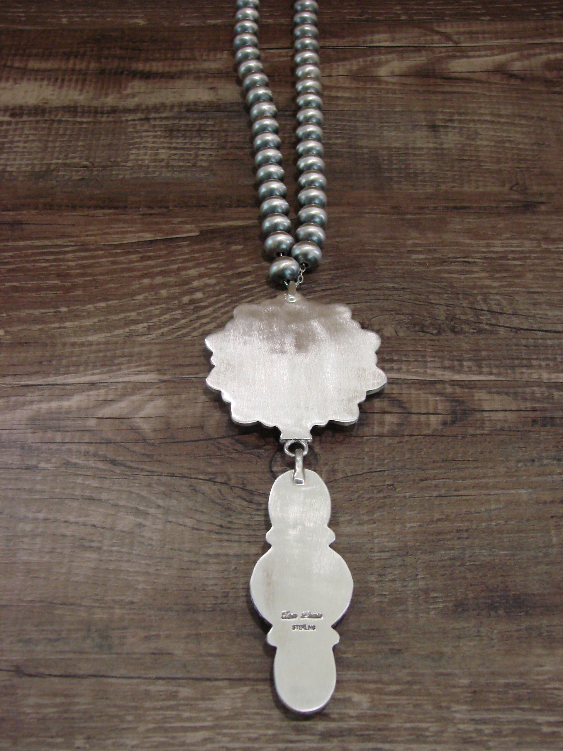 Necklace: 21" Navajo Pearl Length, Center Pendant: 5" x 2", 10mm Navajo Pearls