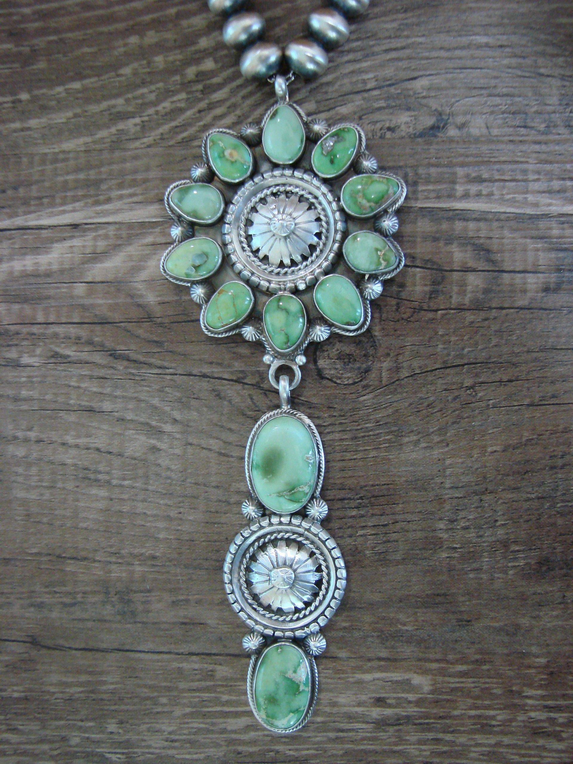 Genuine Native American Navajo Indian Sterling Silver & Sonoran Turquoise Navajo Pearl Necklace from Western New Mexico. This Stunning Necklace features a cluster of Genuine Sonoran Turquoise stones beautifully set into smooth Sterling Silver bezel settings. Hand Stamping and Gorgeous details in Sterling Silver surround the Stones. Hand Made to Perfection, this piece dangles at the center of an 21", 10mm String of Navajo Pearls! Handmade by Navajo Silversmith Tom Lewis. Signed "Tom Lewis" and Stamped "Sterling" on the back.
