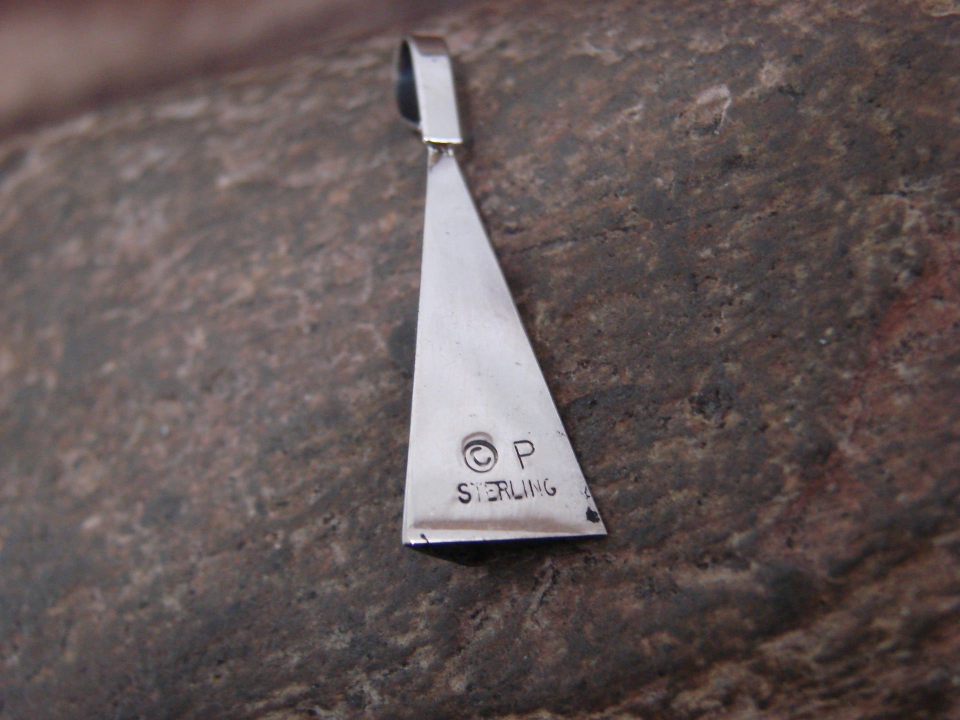Native American Navajo Indian Sterling Silver & Turquoise Shadow Box Pendant from Western New Mexico. This Pendant features a Turquoise stone set into a sterling silver Crown bezel setting. The Silver is cut out around the stone giving it a very nice shadow box look. Handmade by Felix Perry. Signed "P" and Stamped "Sterling" on the back. Free Shipping with a Gift Box included!