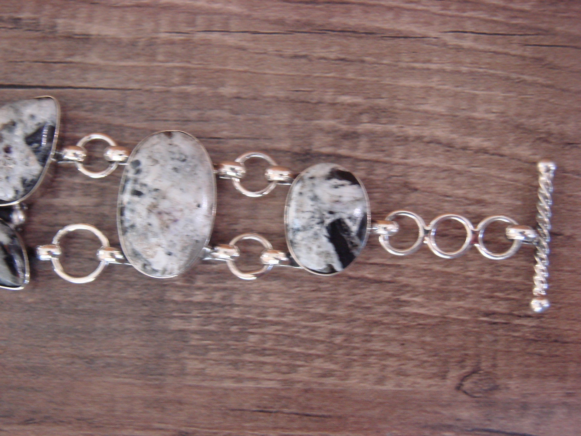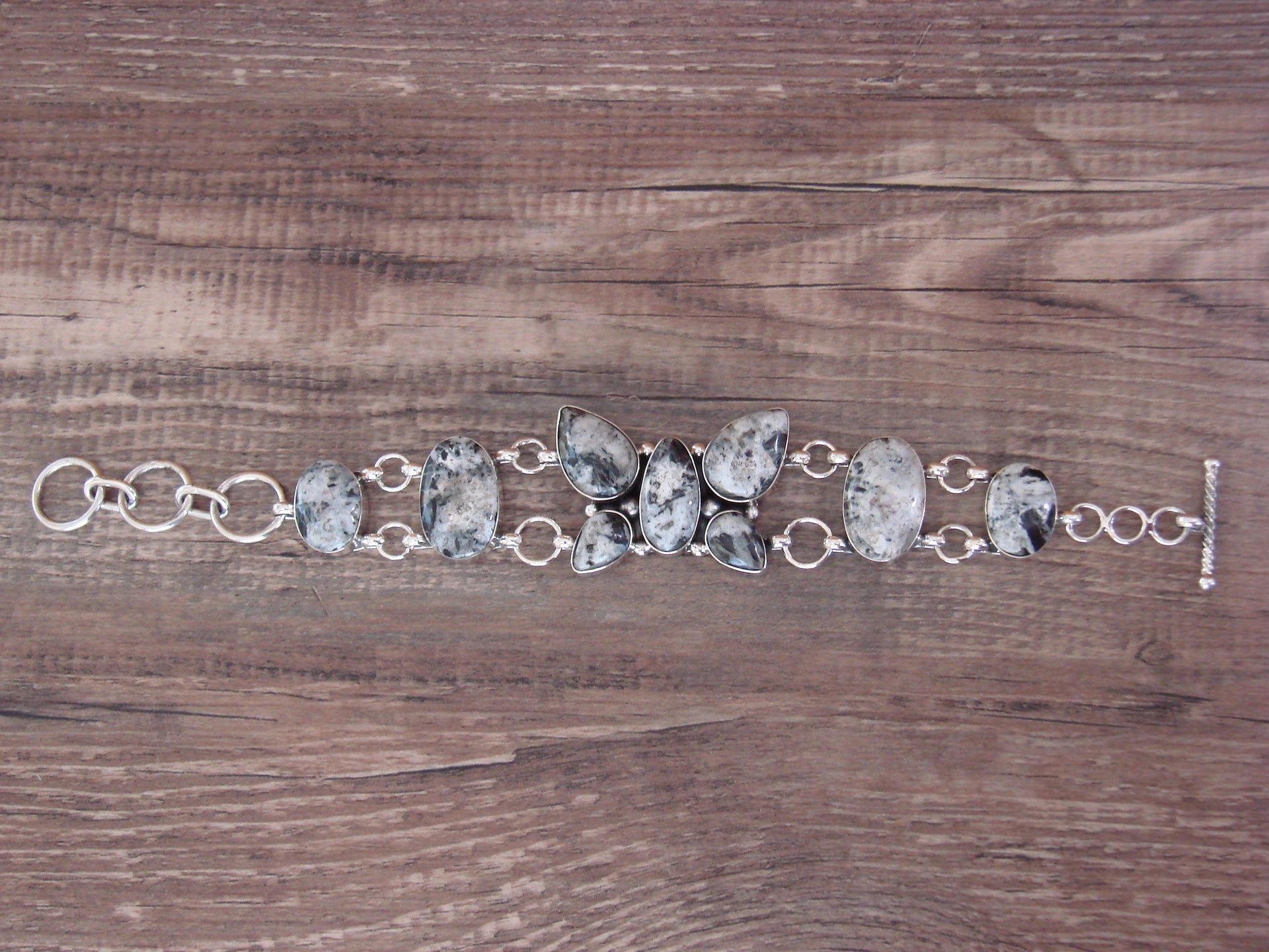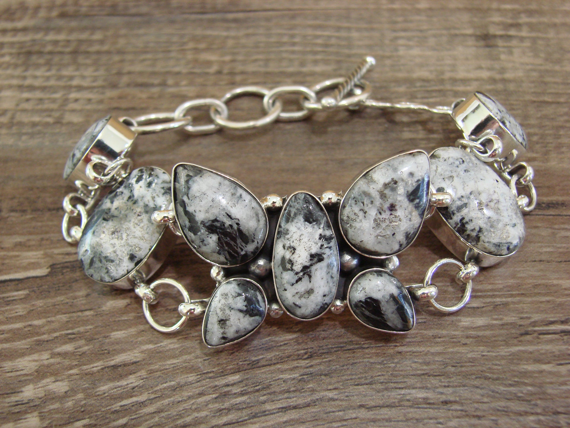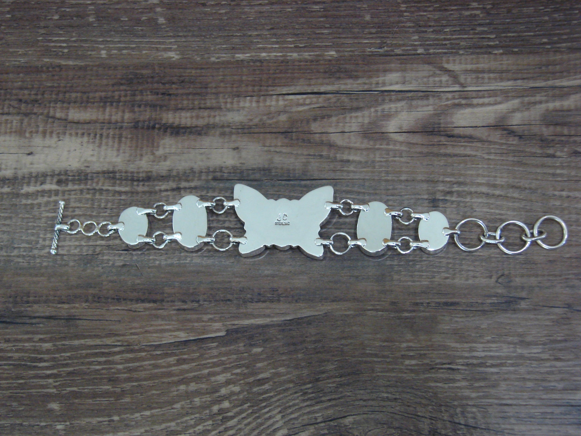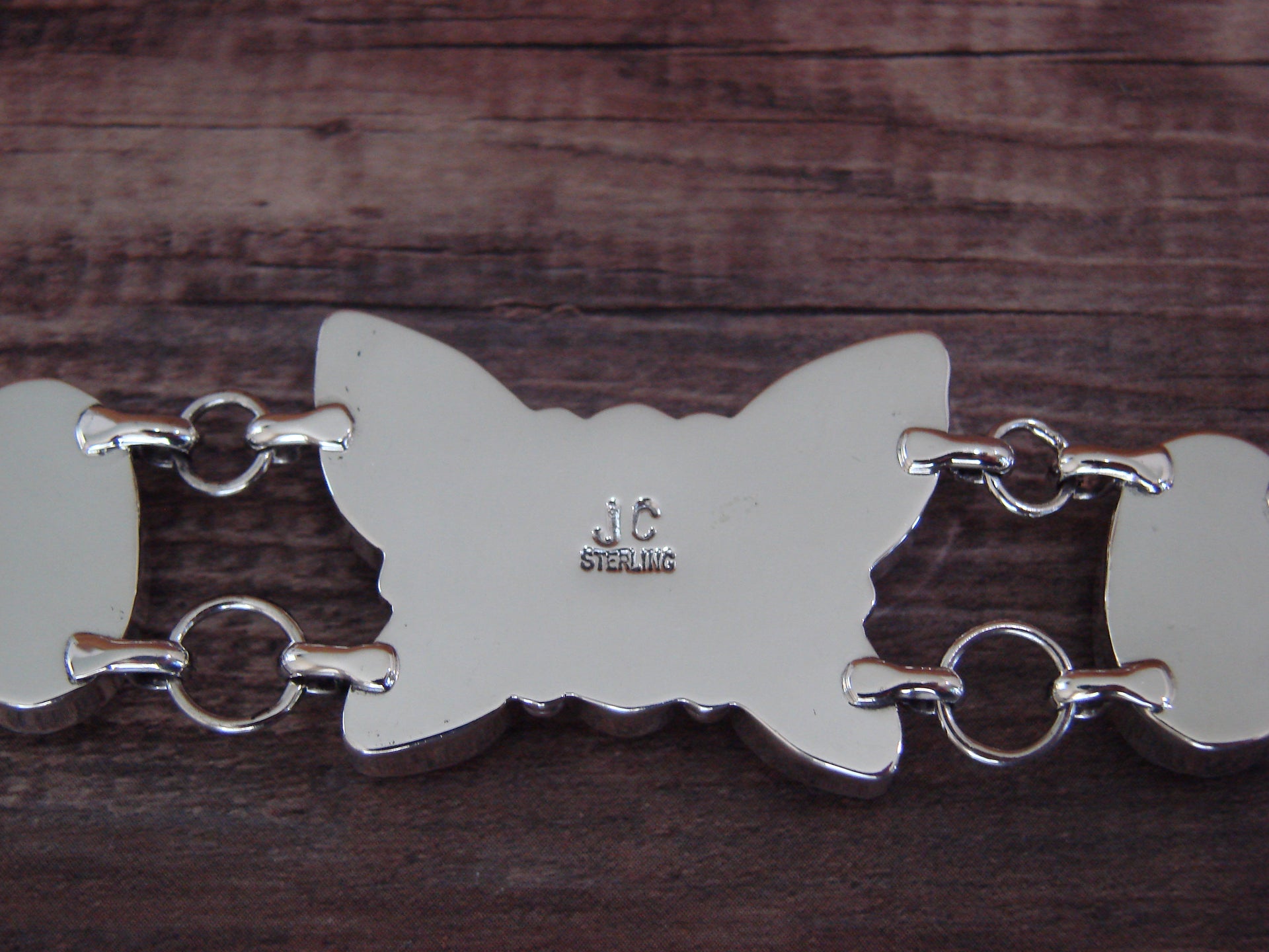 Genuine Native American Navajo Indian Sterling Silver White Buffalo Turquoise Link Butterfly Bracelet from Western New Mexico. This Stunning bracelet feature 9 stones set into smooth Sterling Silver bezel settings. The stones are polished and surrounded by beautiful sterling silver work. This bracelet is Gorgeous and Hand Made to Perfection! Hand Made by Navajo Silversmith Jennifer Cayaditto. Signed "JC" and Stamped "Sterling" on the back. Free shipping and gift box included!