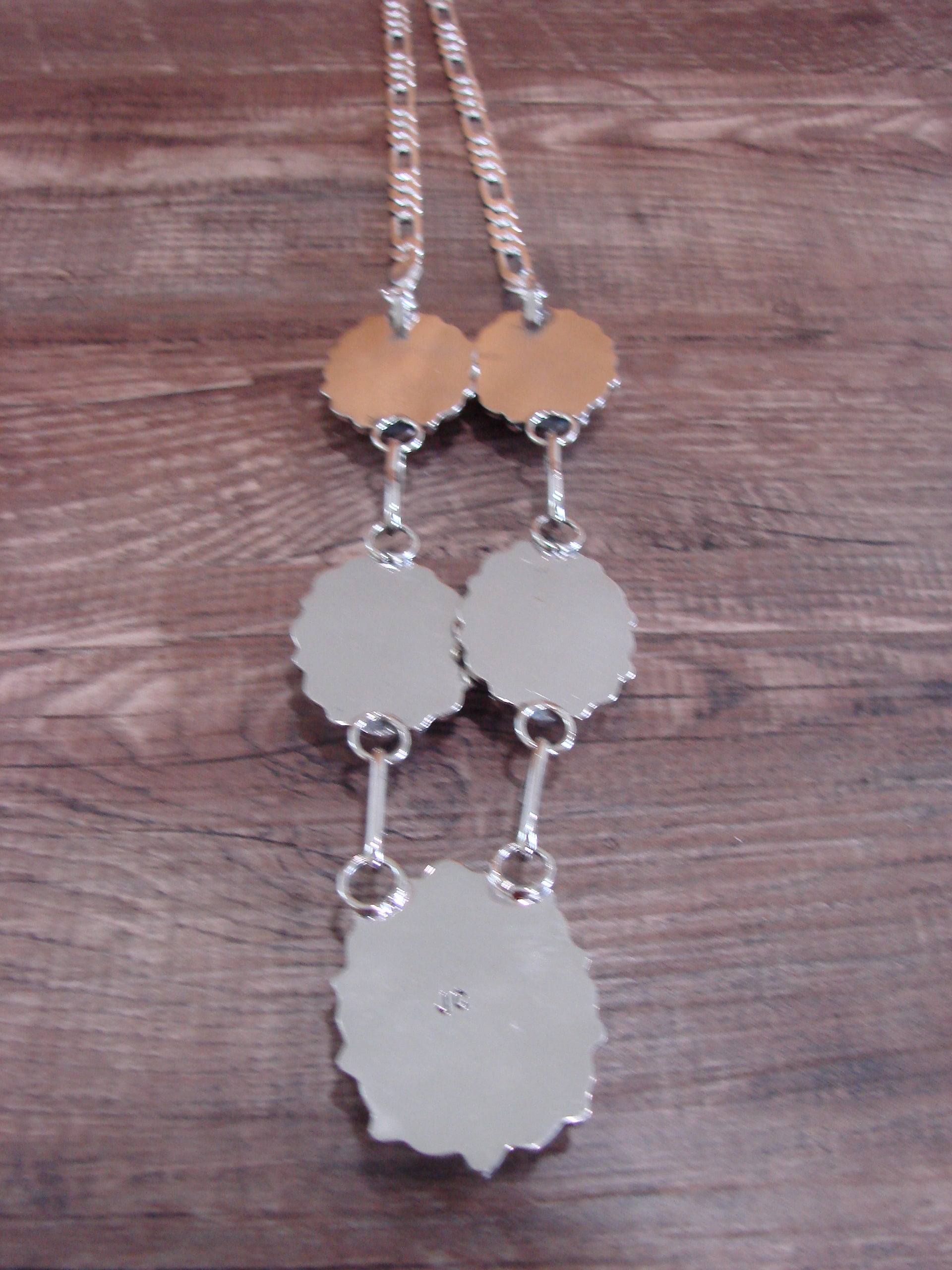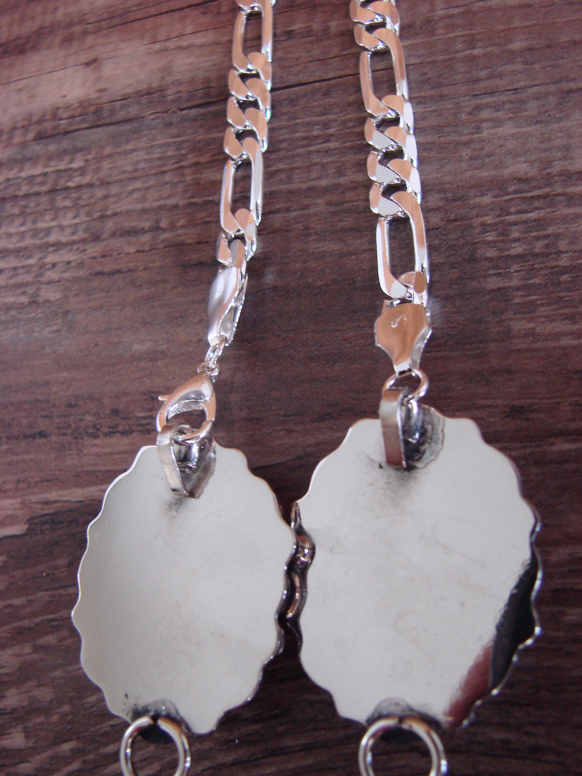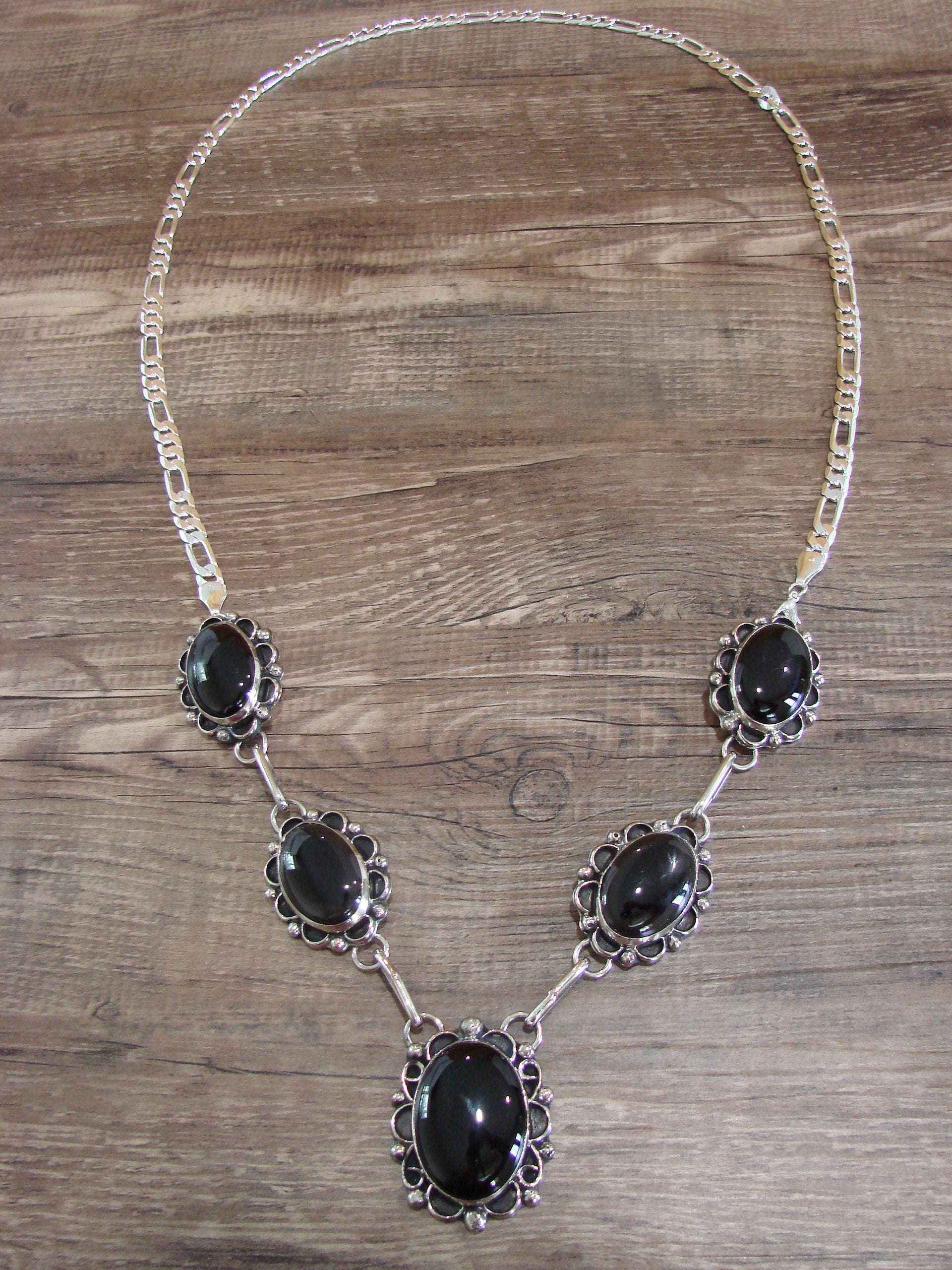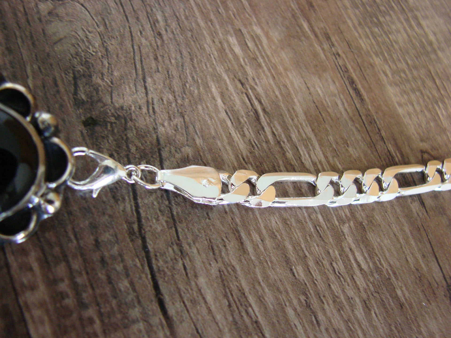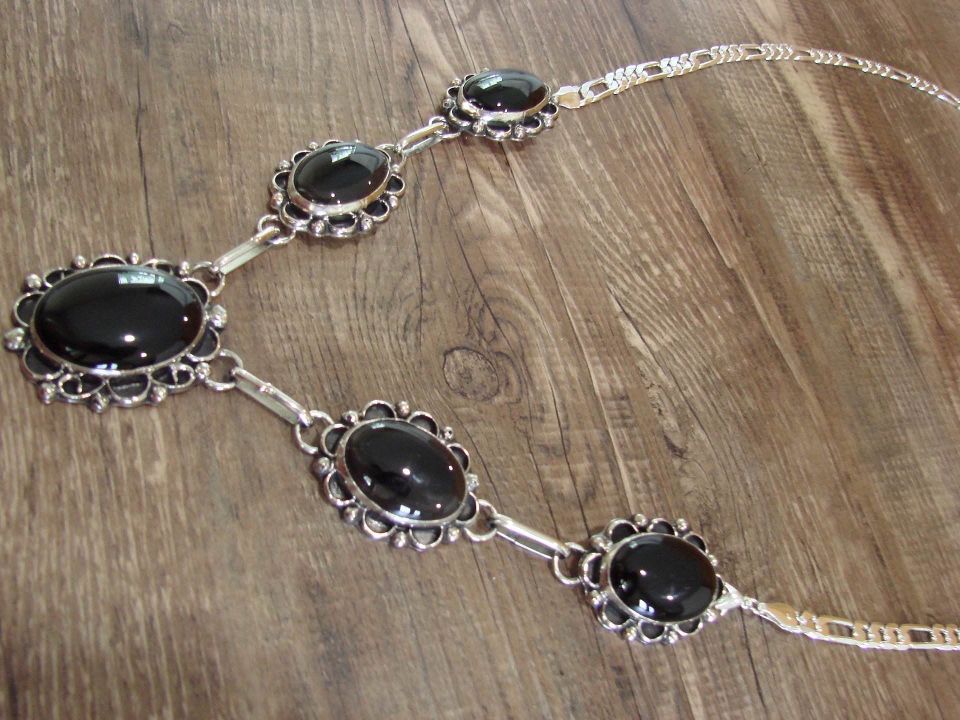 Native American Navajo Indian Nickel Silver & Onyx Chain Link Necklace. This Stunning Hand Made necklace features Onyx Stones intricately set into smooth Nickel Silver bezel settings. Beautiful details in Nickel Silver surround the stones. This is a great combination of both Nickel Silver & Sterling Silver (Chain). Handmade by Navajo silversmith Jackie Cleveland. Signed "JC" on the back. Free gift box and shipping included!