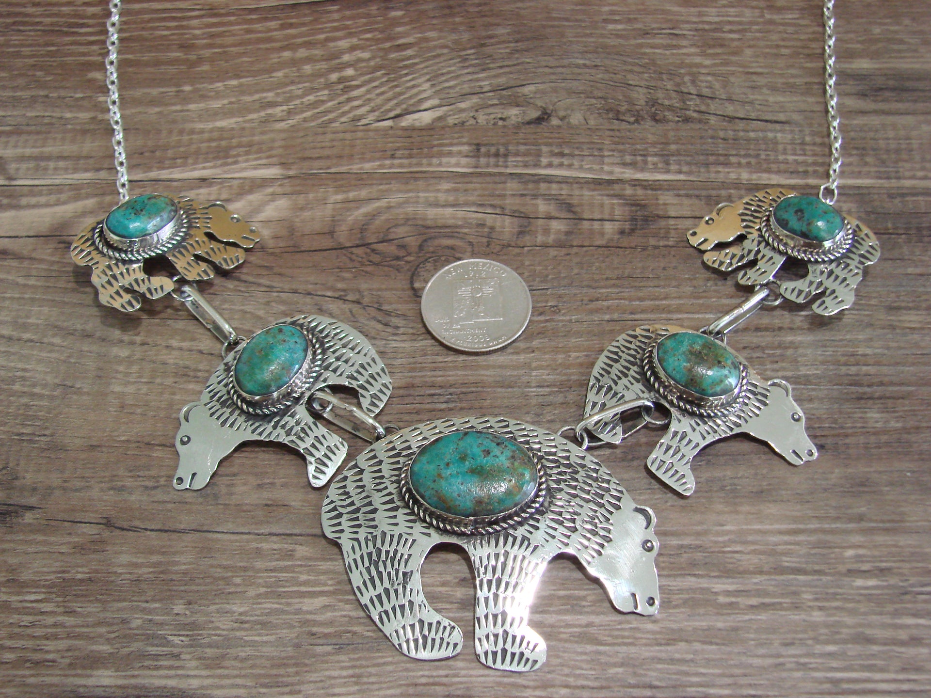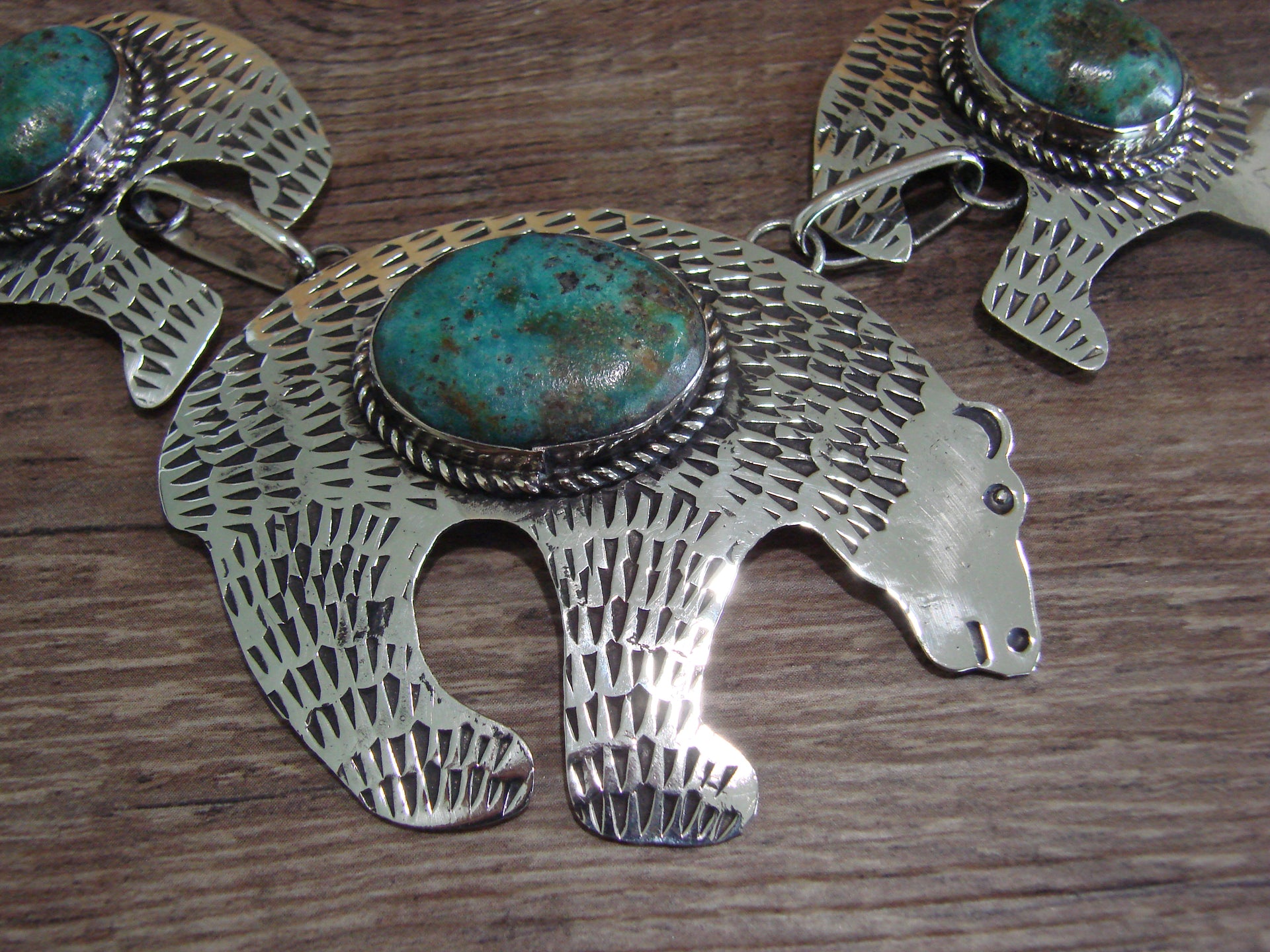 Native American Navajo Indian Nickel Silver & Turquoise Bear Chain Link Necklace. This Stunning Hand Made necklace features Turquoise Stones intricately set into smooth Nickel Silver bezel settings. Beautiful Hand Stamping and details in Nickel Silver surround the stones. This is a great necklace! This is a great combination of both Nickel Silver & Sterling Silver (Chain). Handmade by Navajo silversmith Jackie Cleveland. Signed "JC" on the back. Free gift box and shipping included!