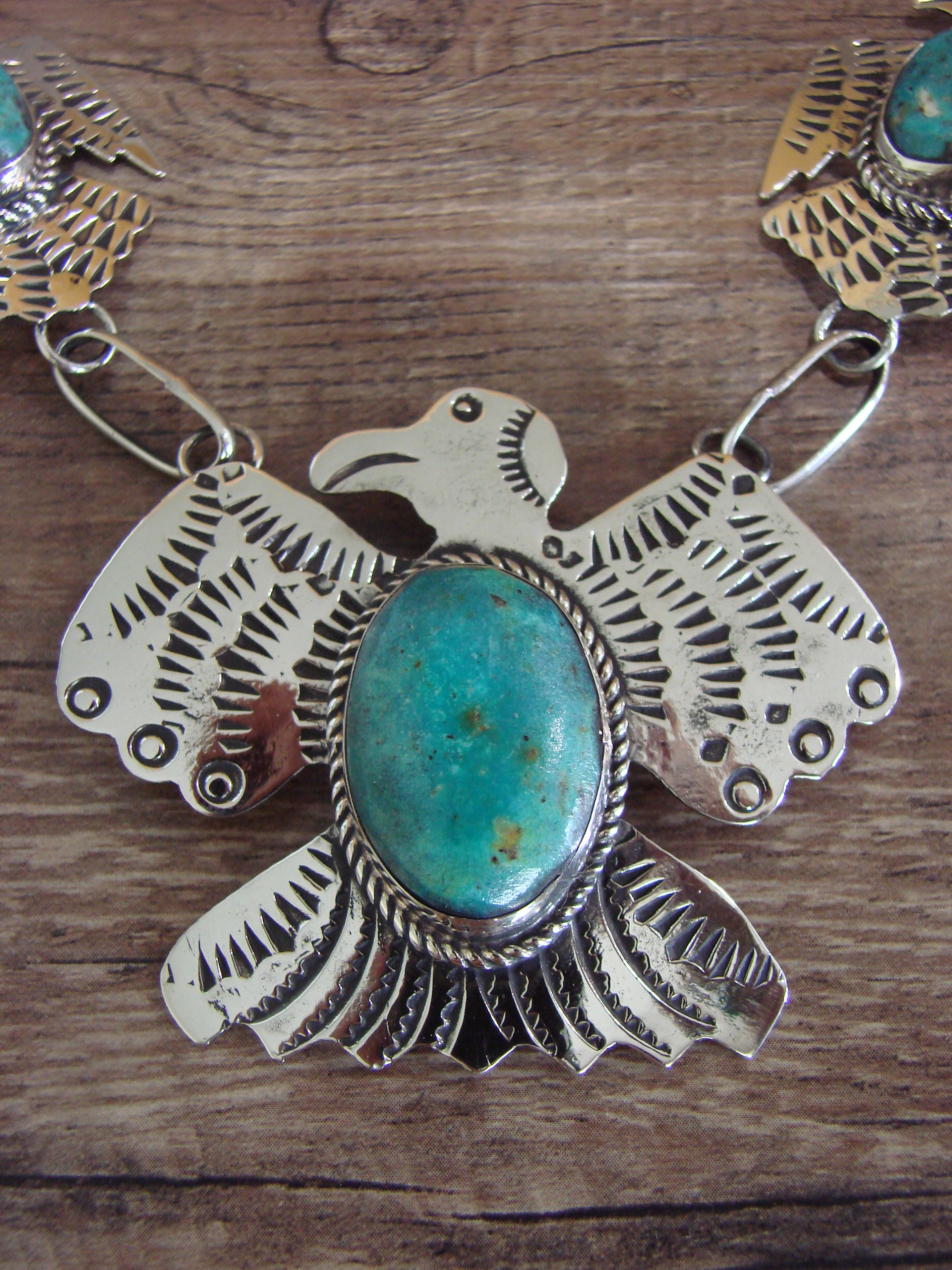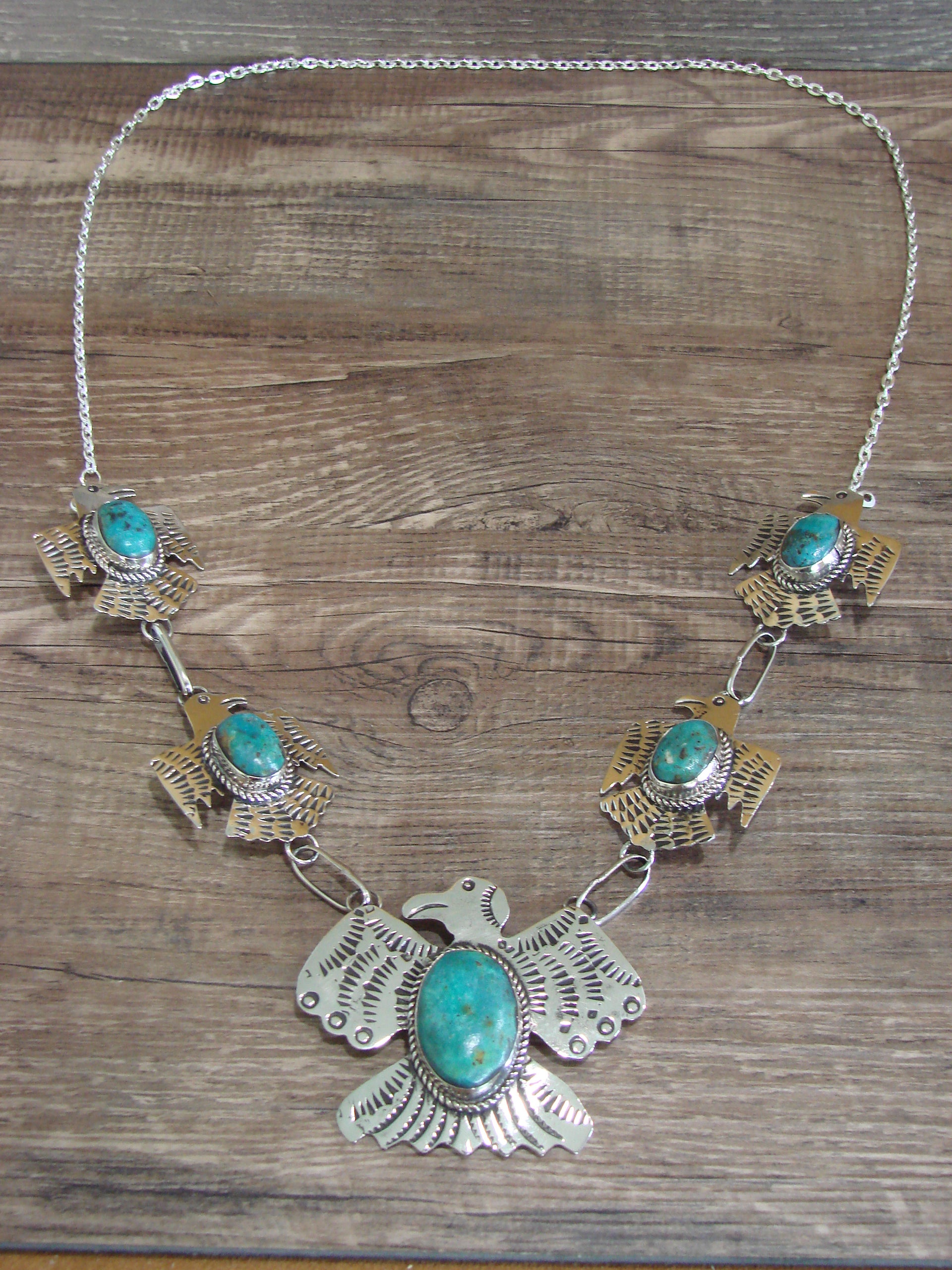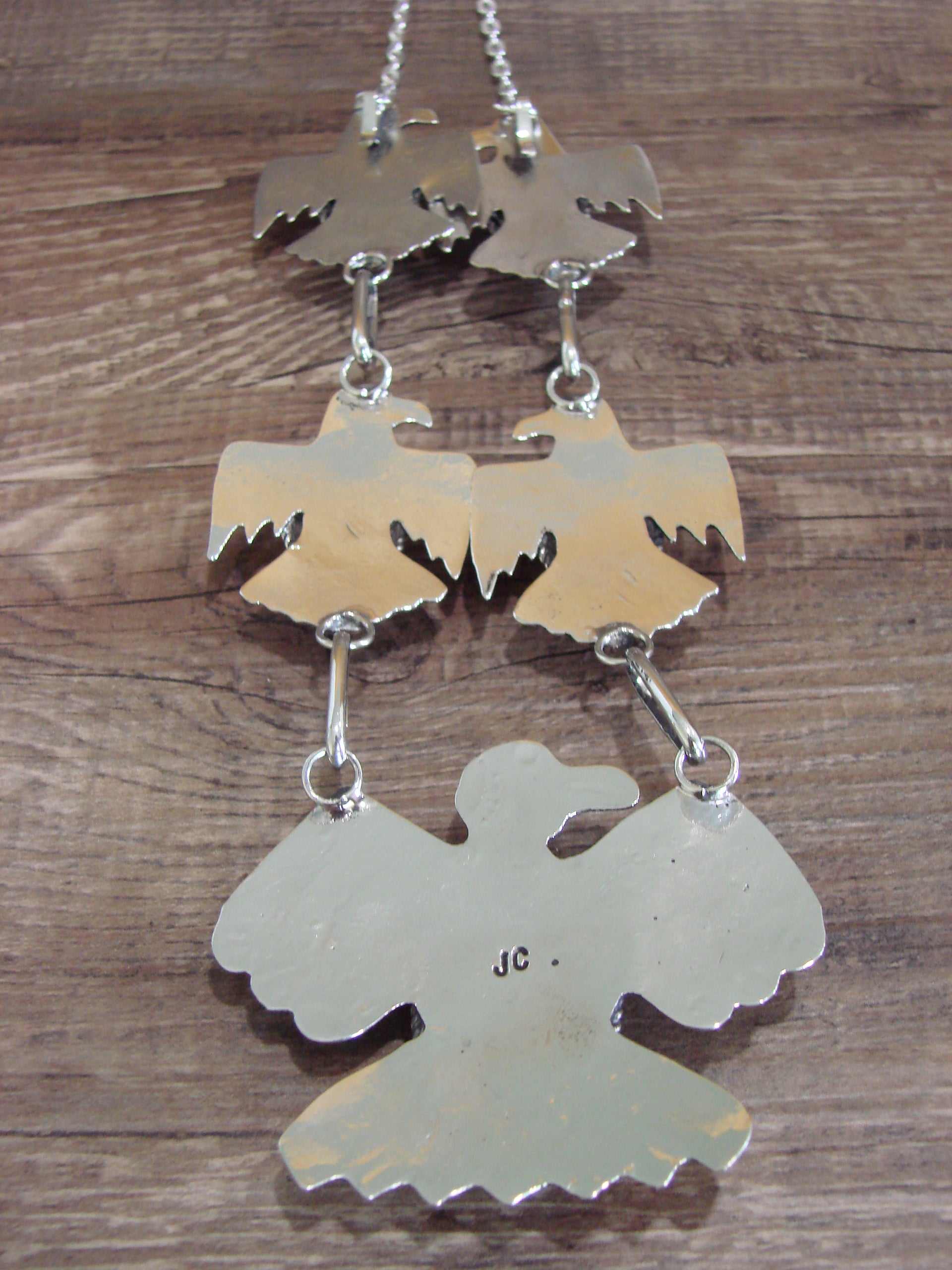 Native American Navajo Indian Nickel Silver & Turquoise Thunderbird Chain Link Necklace. This Stunning Hand Made necklace features Turquoise Stones intricately set into smooth Nickel Silver bezel settings. Beautiful Hand Stamping and details in Nickel Silver surround the stones. This is a great necklace! This is a great combination of both Nickel Silver & Sterling Silver (Chain). Handmade by Navajo silversmith Jackie Cleveland. Signed "JC" on the back. Free gift box and shipping included!