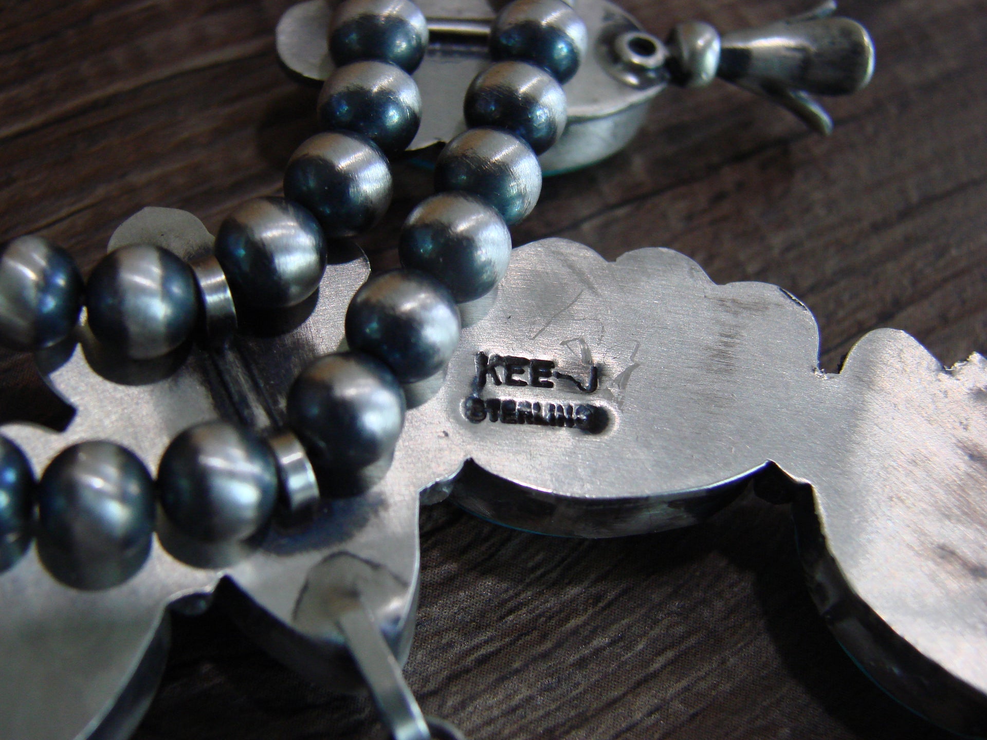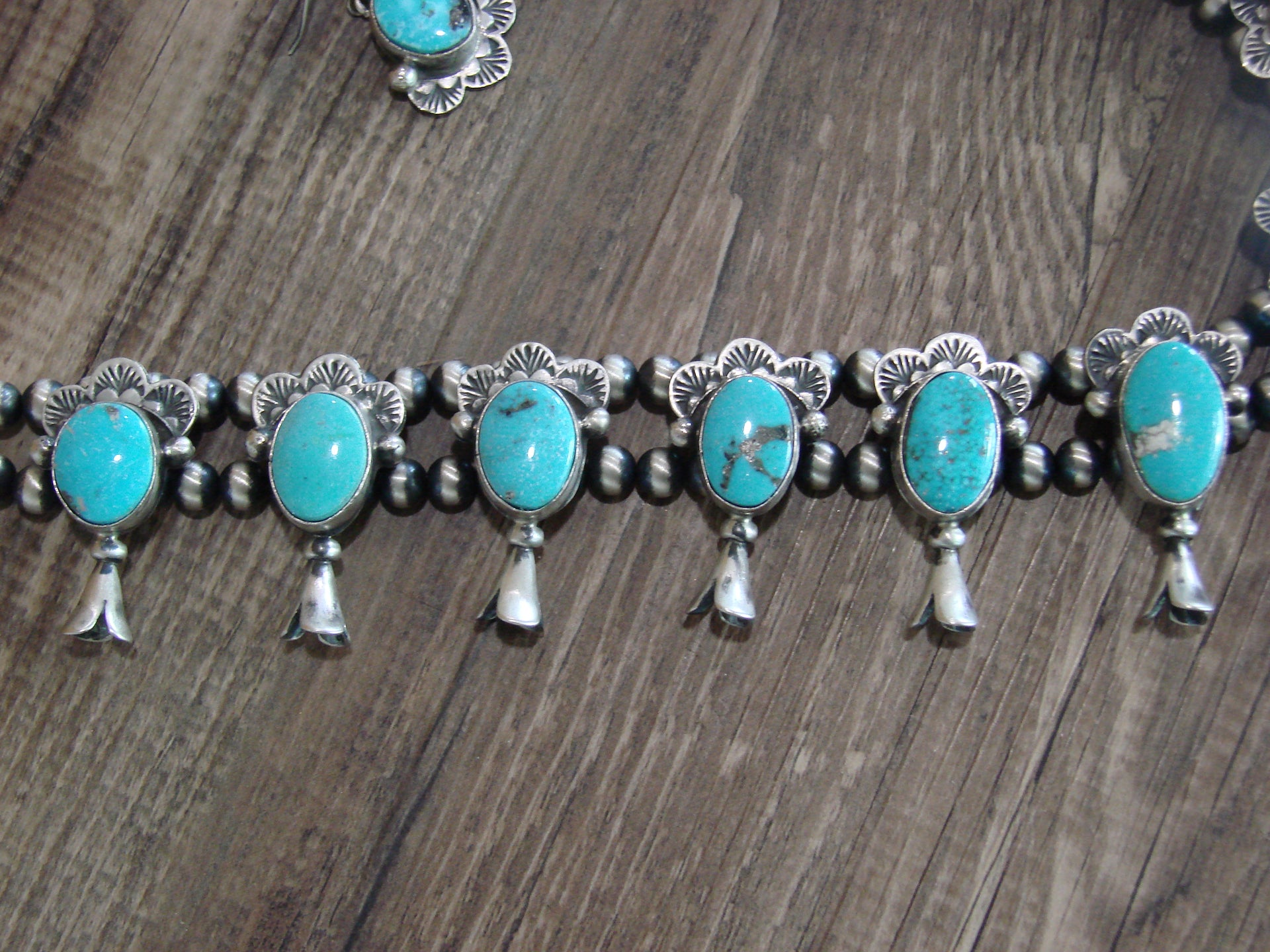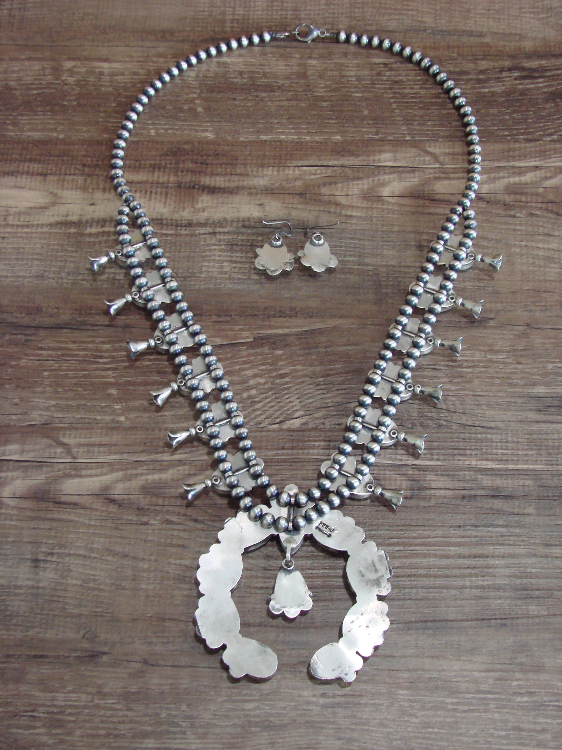 Genuine Native American Navajo Indian Sterling Silver & Turquoise Squash Blossom Necklace and Earring Set from Western New Mexico. This traditional style Necklace features Stunning, Genuine Turquoise stones. Each Stone is beautifully set into a smooth Sterling Silver bezel setting. Hand Stamping, traditional style silversmith work, and Navajo Pearls surround the Stones. With matching Turquoise Dangle earrings, this set is Gorgeous! Made to Perfection, this piece is a Handmade masterpiece! Handmade by Navajo Silversmith Kee J. Signed "Kee J" and Stamped "Sterling" on the back.