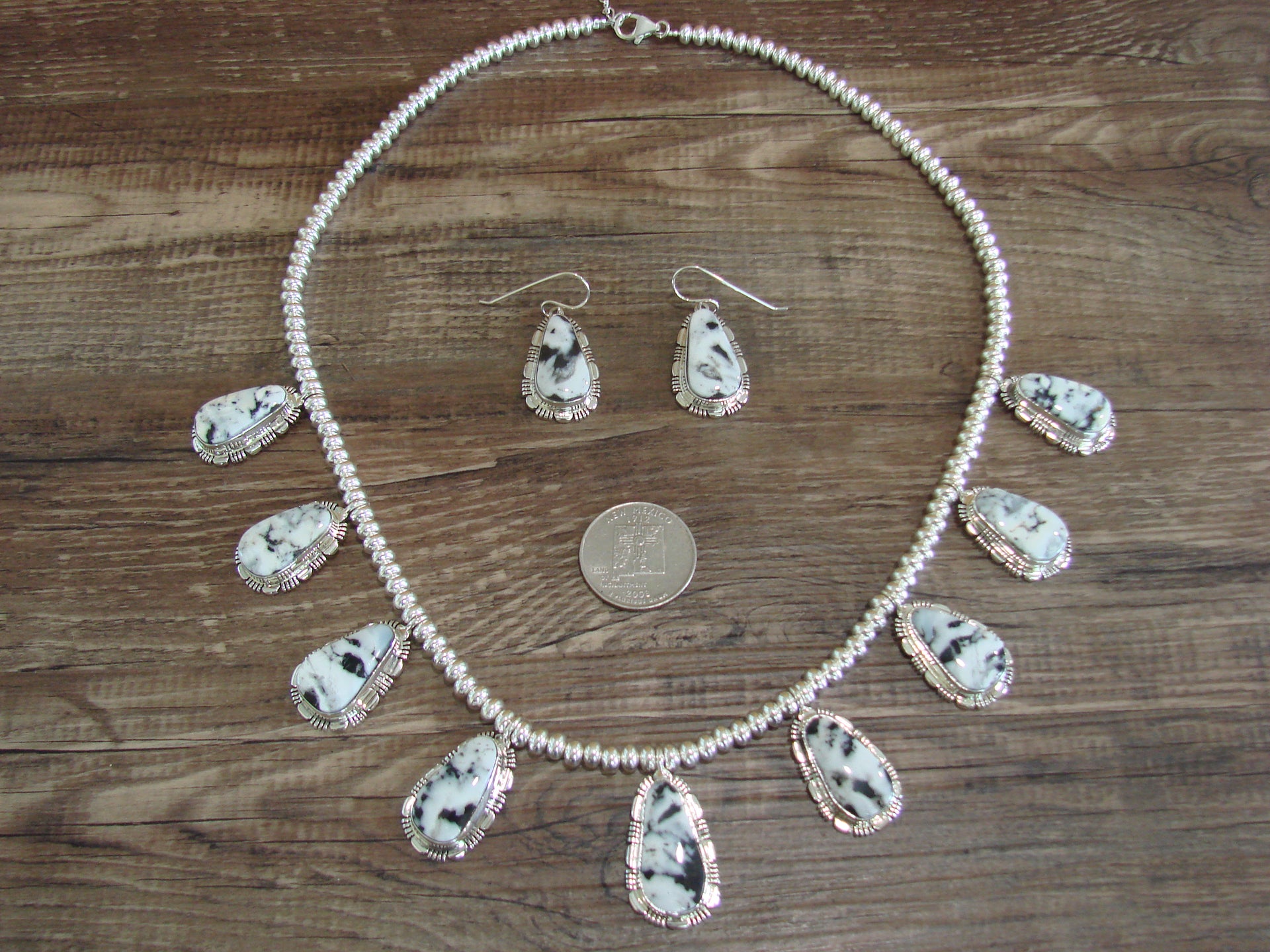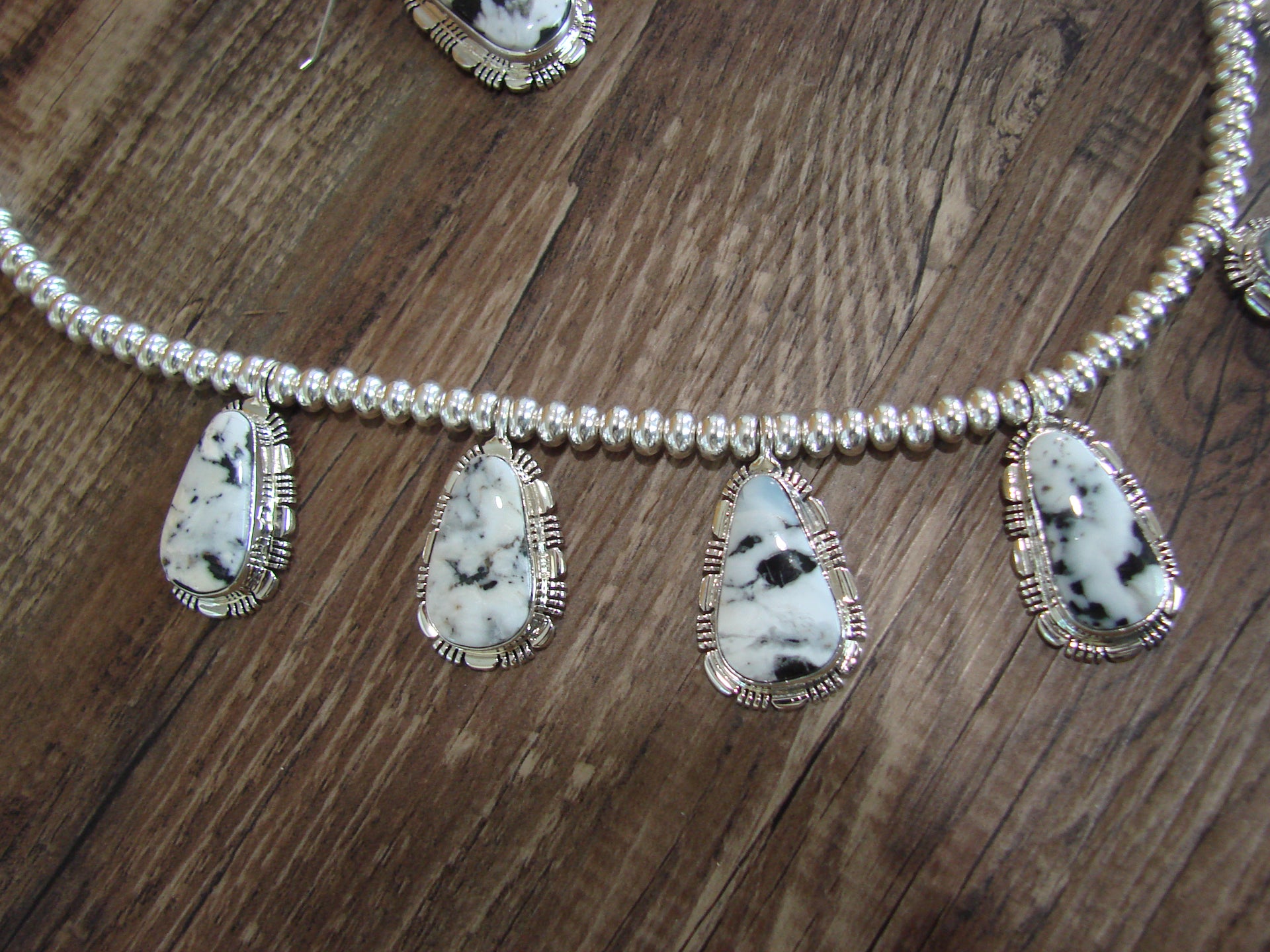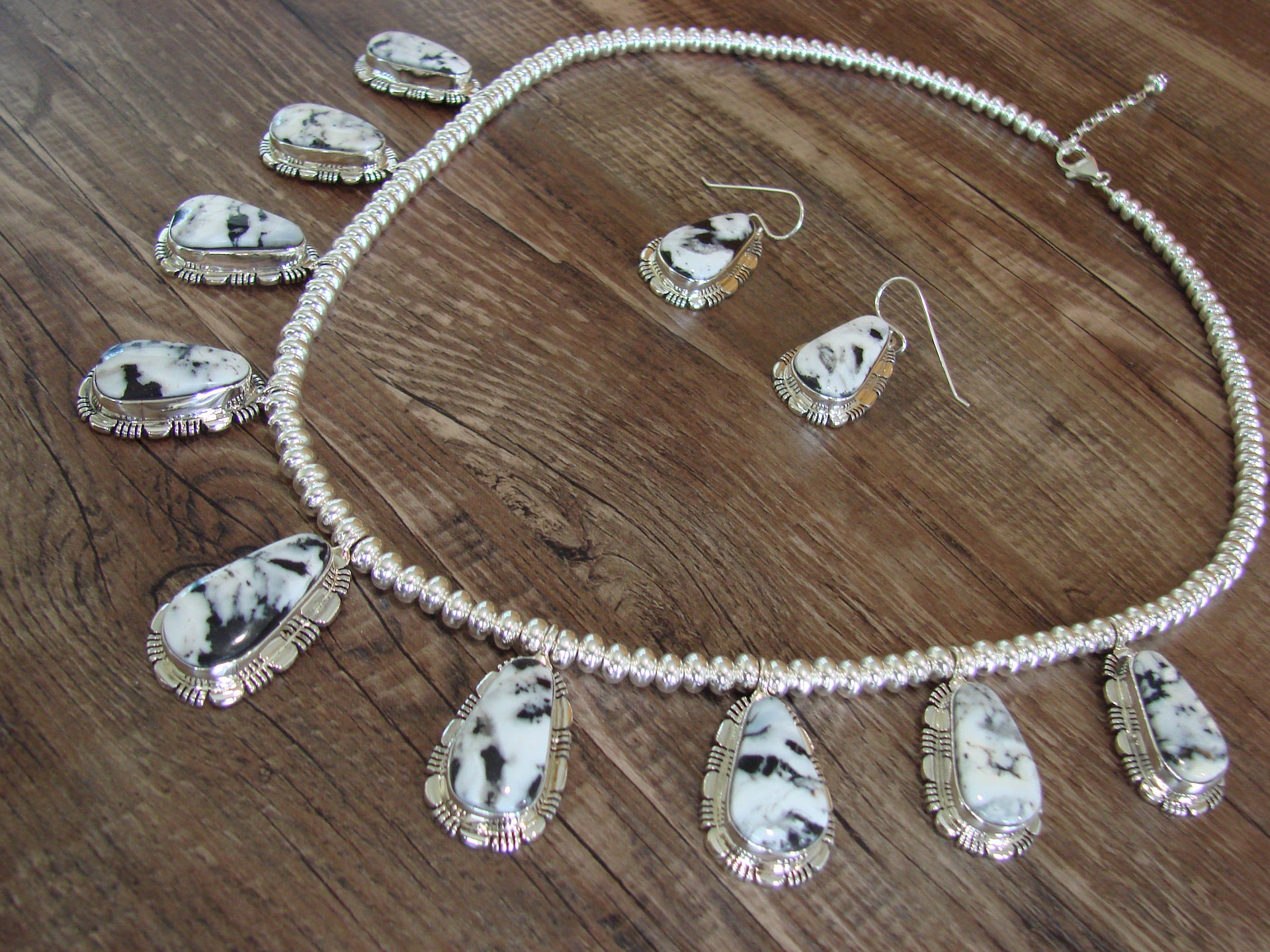 Genuine Native American Navajo Indian Sterling Silver & White Buffalo Turquoise Necklace and Earring Set from Western New Mexico. This traditional style Necklace features Stunning, Genuine White Buffalo Turquoise stones beautifully set into smooth Sterling Silver bezel settings. Traditional style silversmith work and Navajo Pearls surround the Stones. With matching White Buffalo Turquoise Dangle earrings, this set is Gorgeous! Made to Perfection, this piece is a Handmade masterpiece! Handmade by Navajo Silversmith Nila Johnson. Signed "NJ" and Stamped "Sterling" on the back.