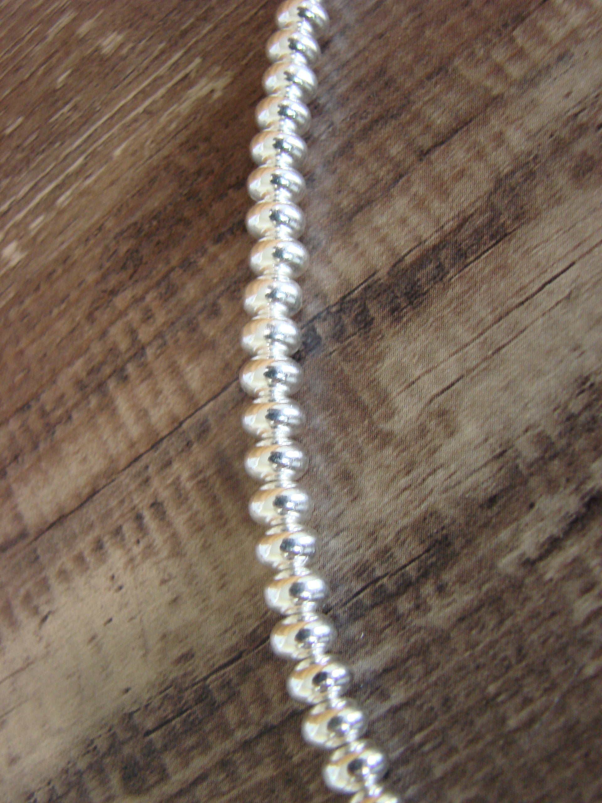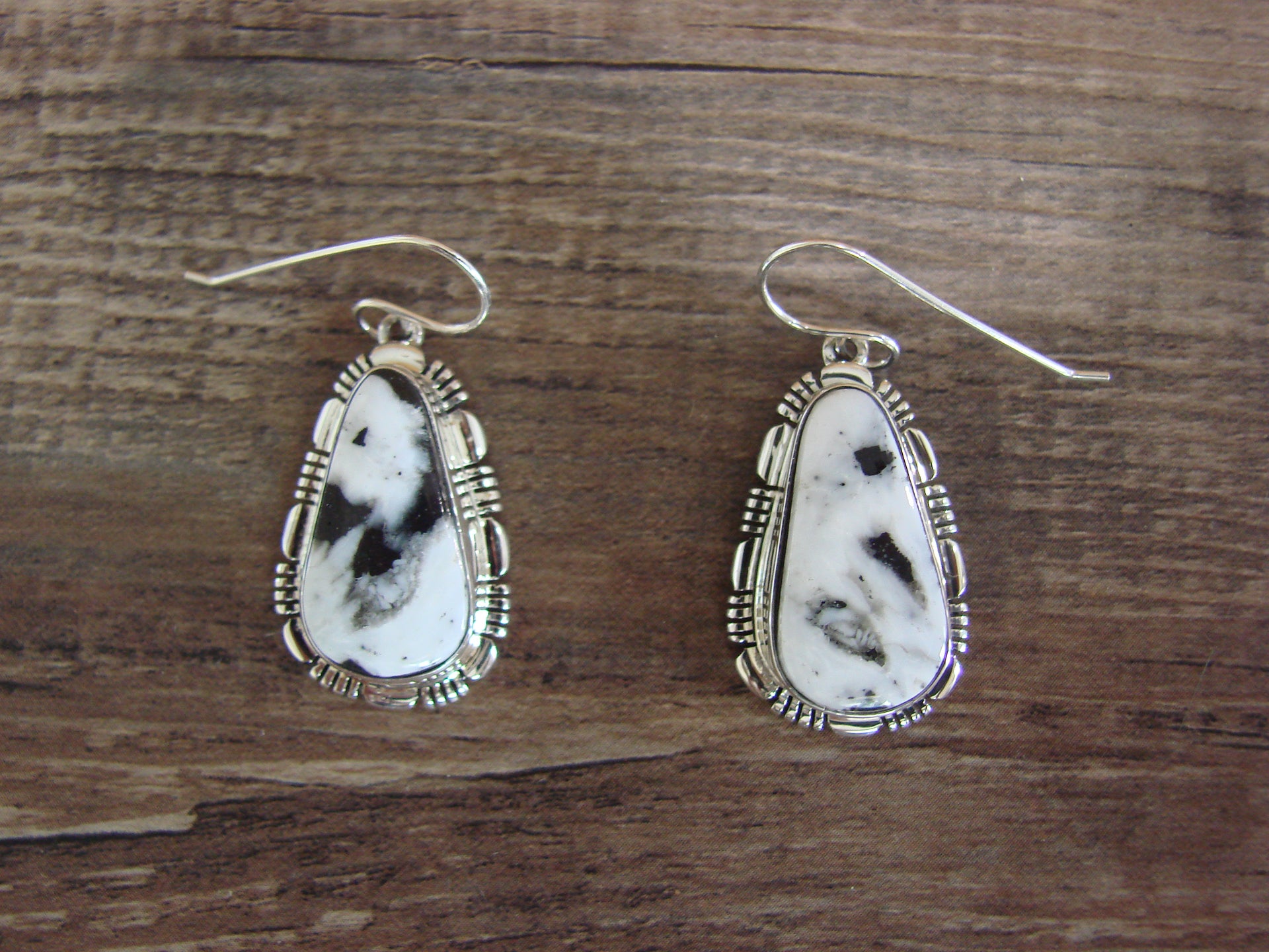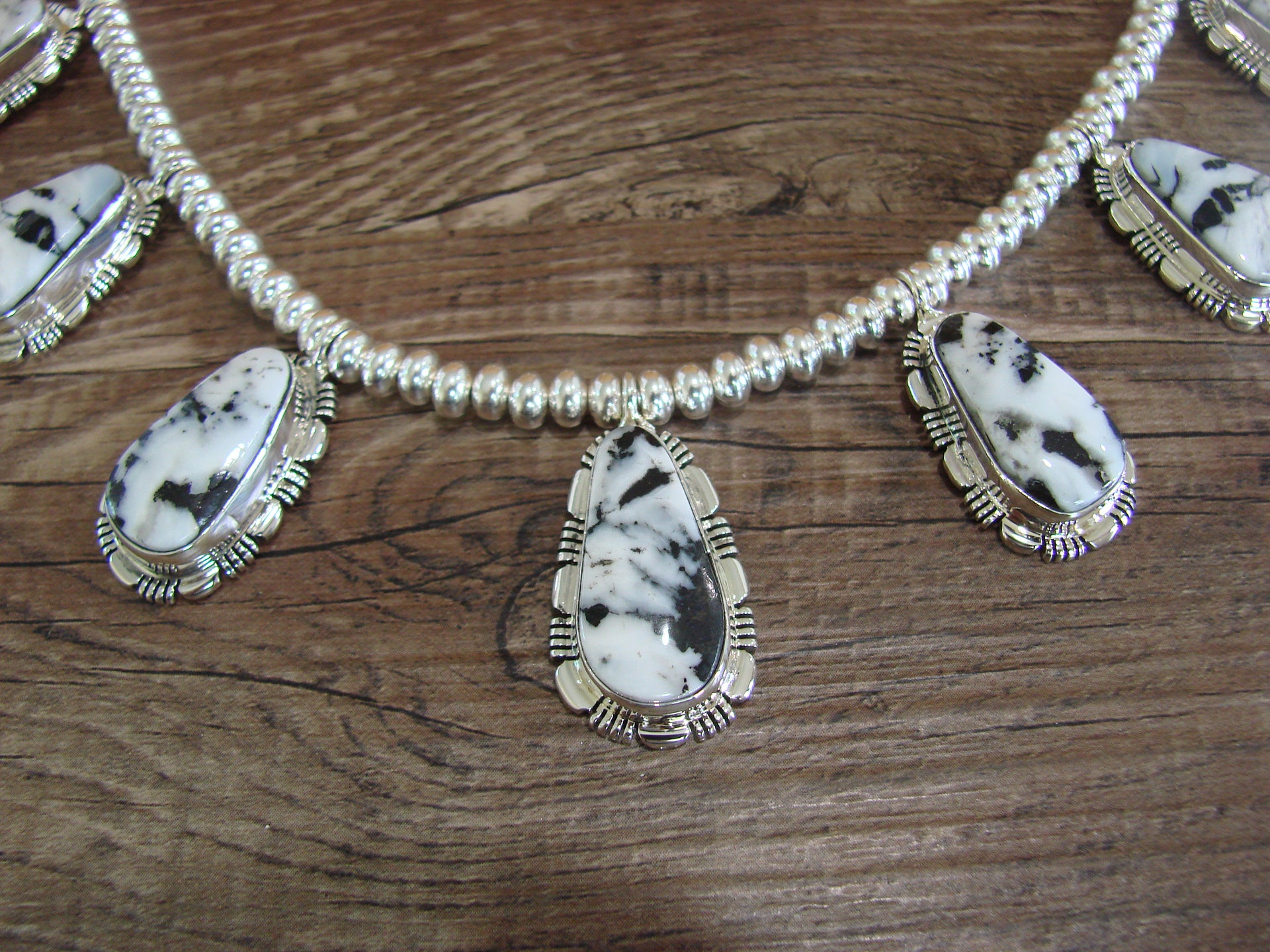 Genuine Native American Navajo Indian Sterling Silver & White Buffalo Turquoise Necklace and Earring Set from Western New Mexico. This traditional style Necklace features Stunning, Genuine White Buffalo Turquoise stones beautifully set into smooth Sterling Silver bezel settings. Traditional style silversmith work and Navajo Pearls surround the Stones. With matching White Buffalo Turquoise Dangle earrings, this set is Gorgeous! Made to Perfection, this piece is a Handmade masterpiece! Handmade by Navajo Silversmith Nila Johnson. Signed "NJ" and Stamped "Sterling" on the back.