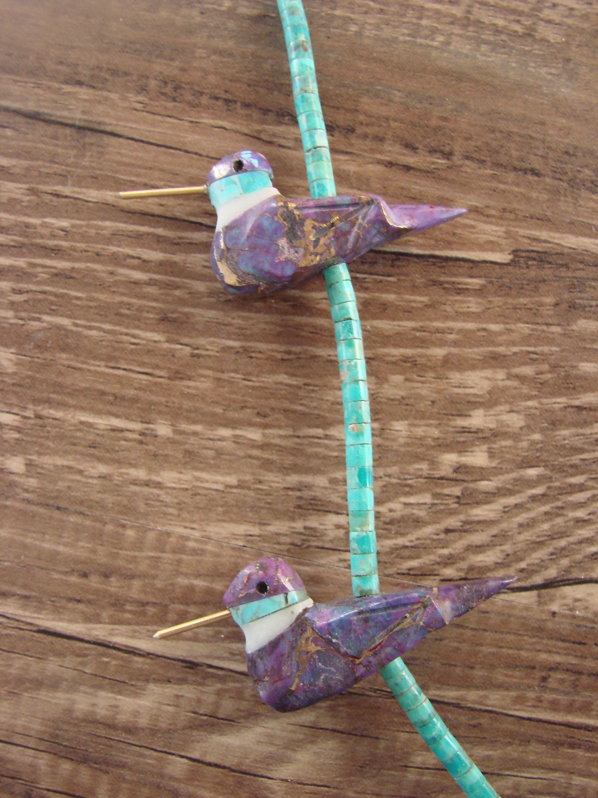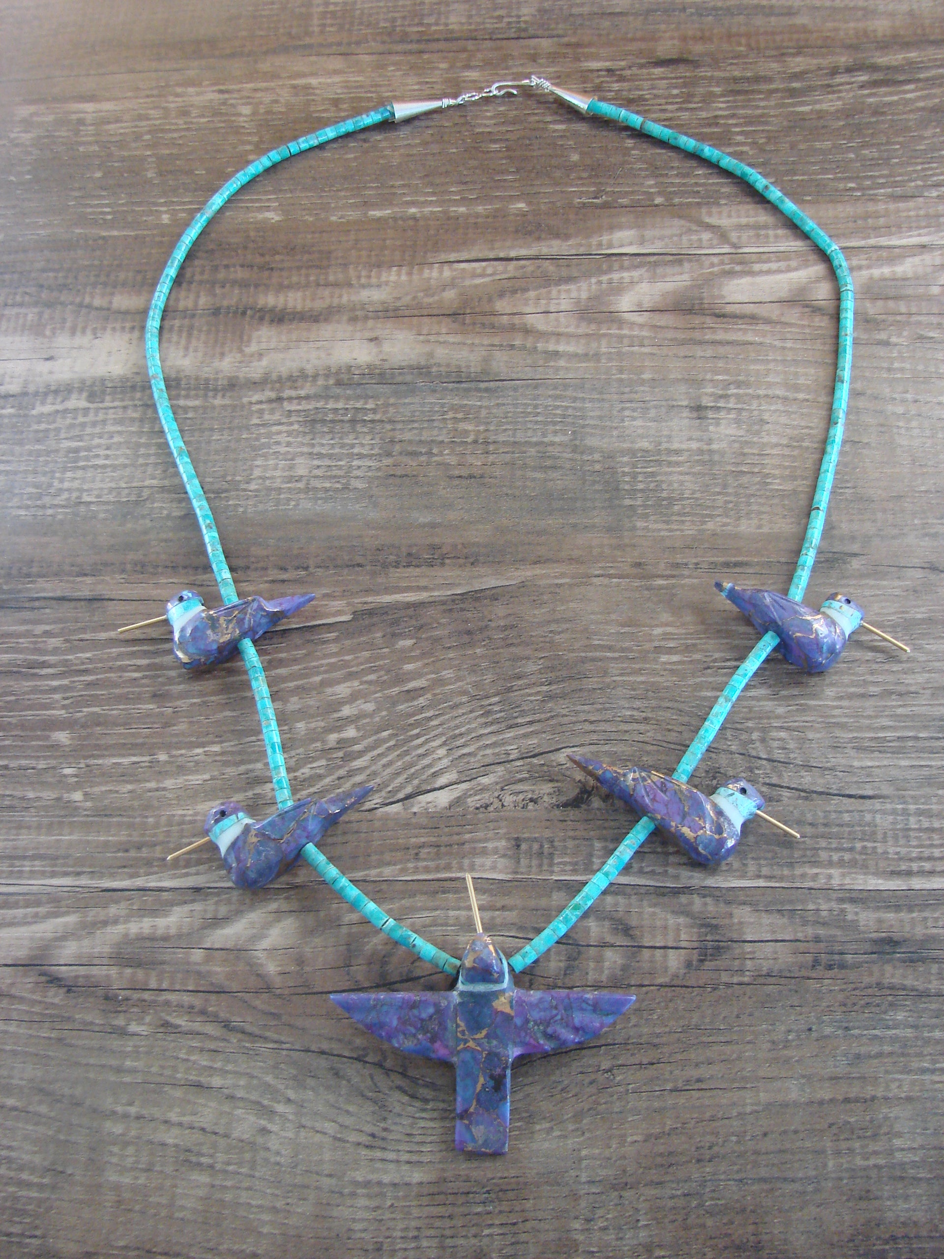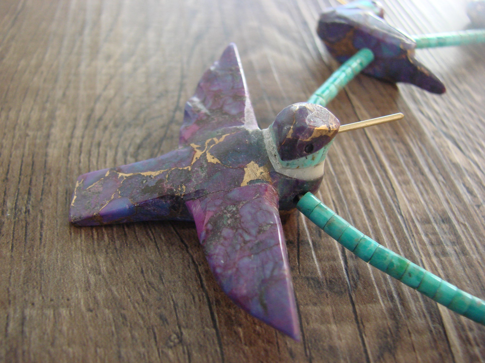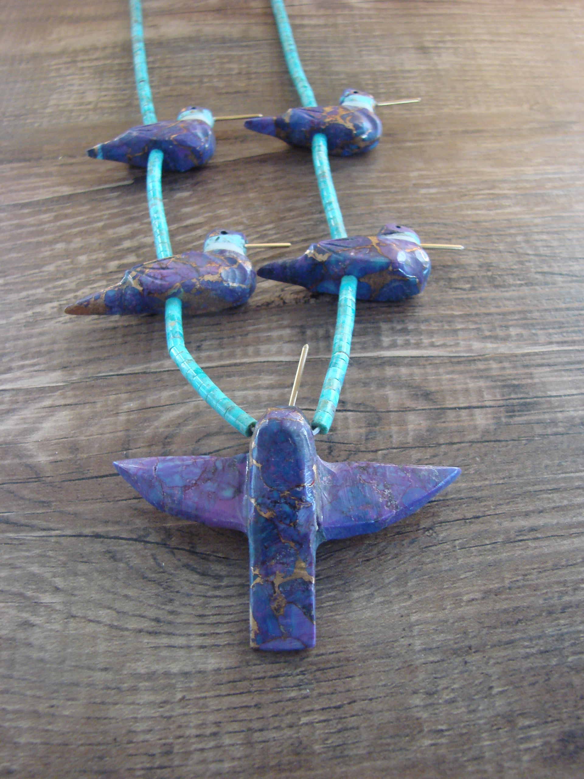 Hand Carved Fetish Necklace from New Mexico. This necklace features beautifully hand carved block Purple Mohave Turquoise Hummingbirds. The Purple Mohave Turquoise is infused with copper giving it a Stunning look! The Hummingbirds are nicely carved and centered on a Turquoise heishi style necklace. There are 2 Hummingbirds along each side of the necklace and one large Hummingbird at the center. This is a great necklace! Free gift box included! Handmade by Matt Mitchell, although Matt is non-Native American his carving work is some of the best around.