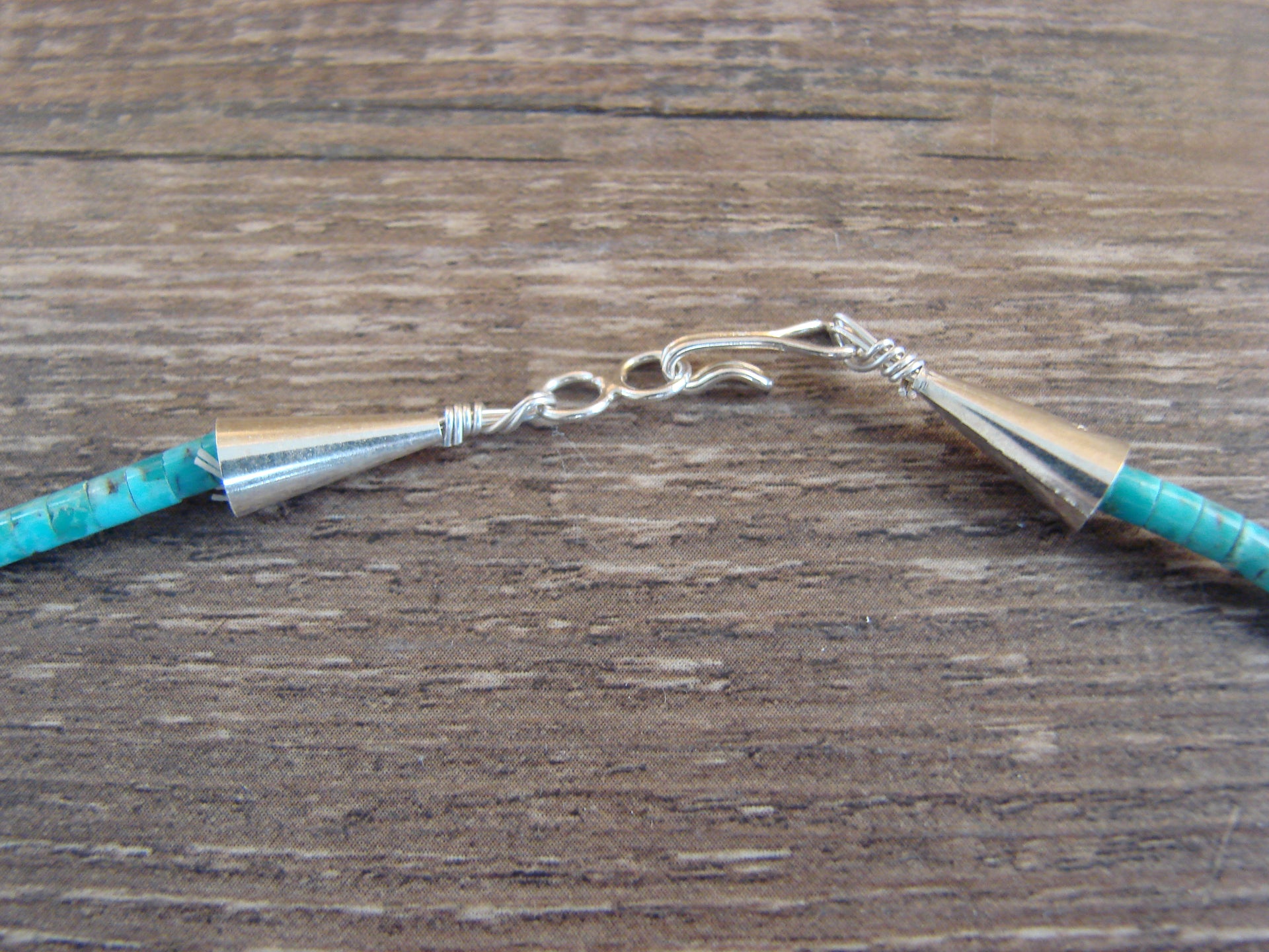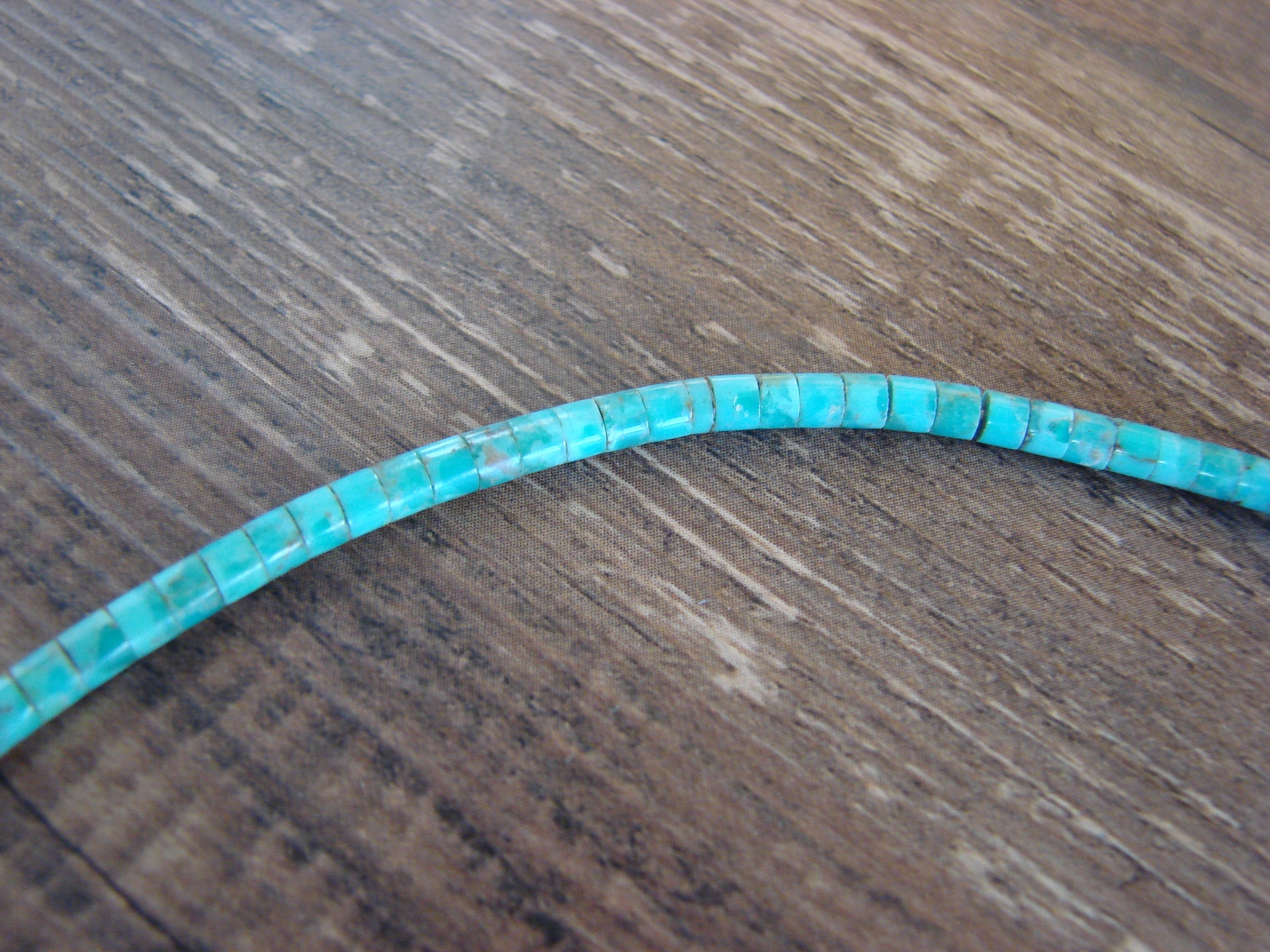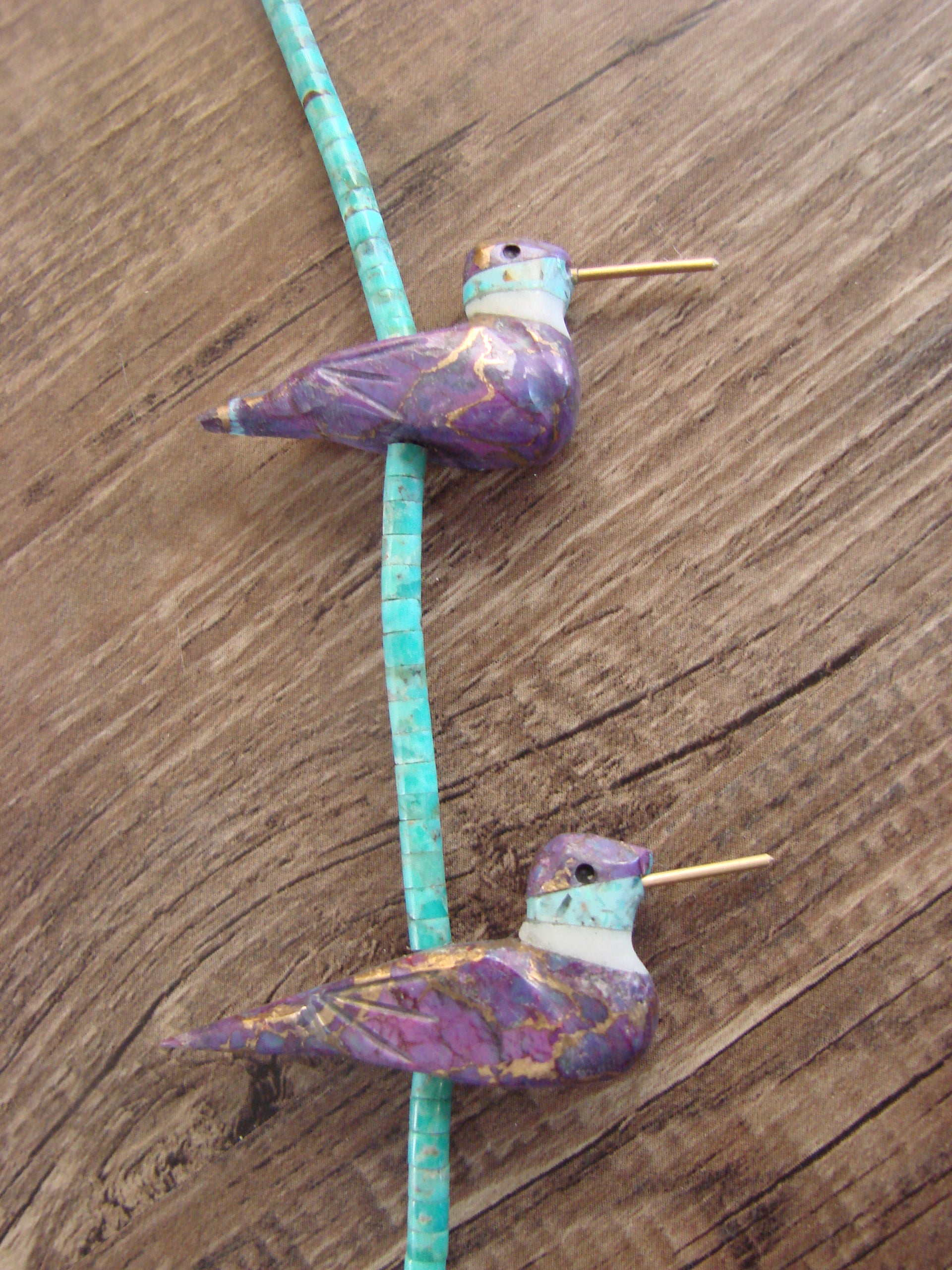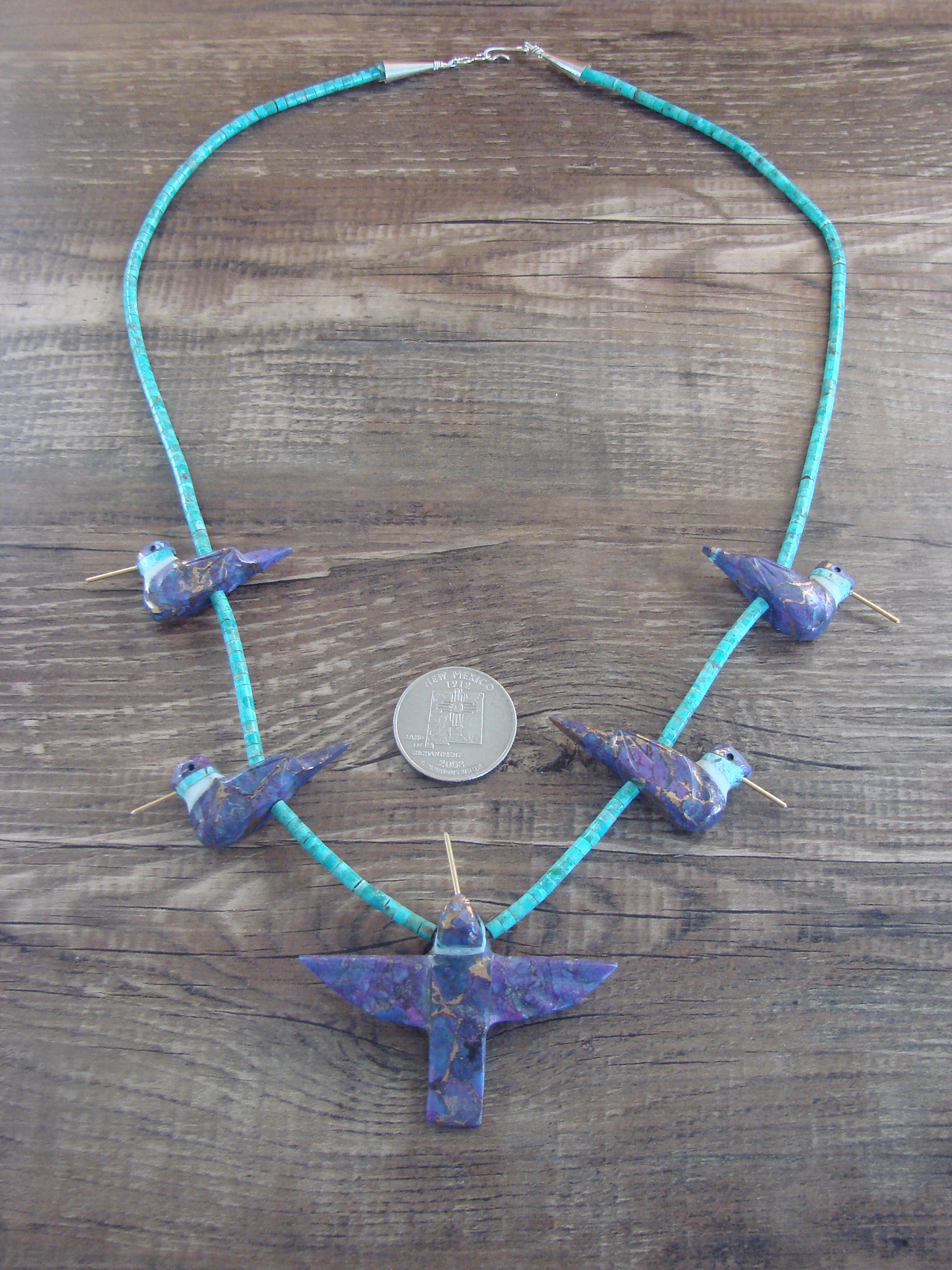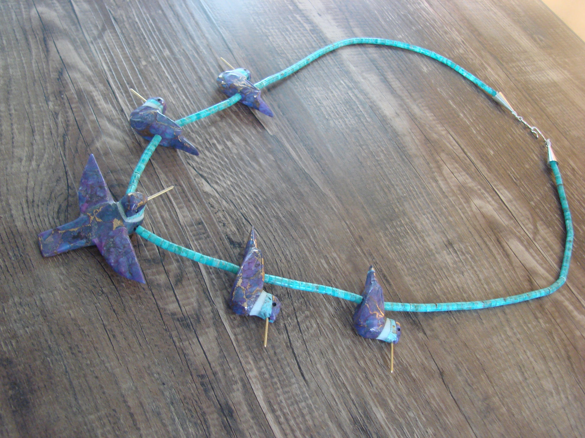 Hand Carved Fetish Necklace from New Mexico. This necklace features beautifully hand carved block Purple Mohave Turquoise Hummingbirds. The Purple Mohave Turquoise is infused with copper giving it a Stunning look! The Hummingbirds are nicely carved and centered on a Turquoise heishi style necklace. There are 2 Hummingbirds along each side of the necklace and one large Hummingbird at the center. This is a great necklace! Free gift box included! Handmade by Matt Mitchell, although Matt is non-Native American his carving work is some of the best around.