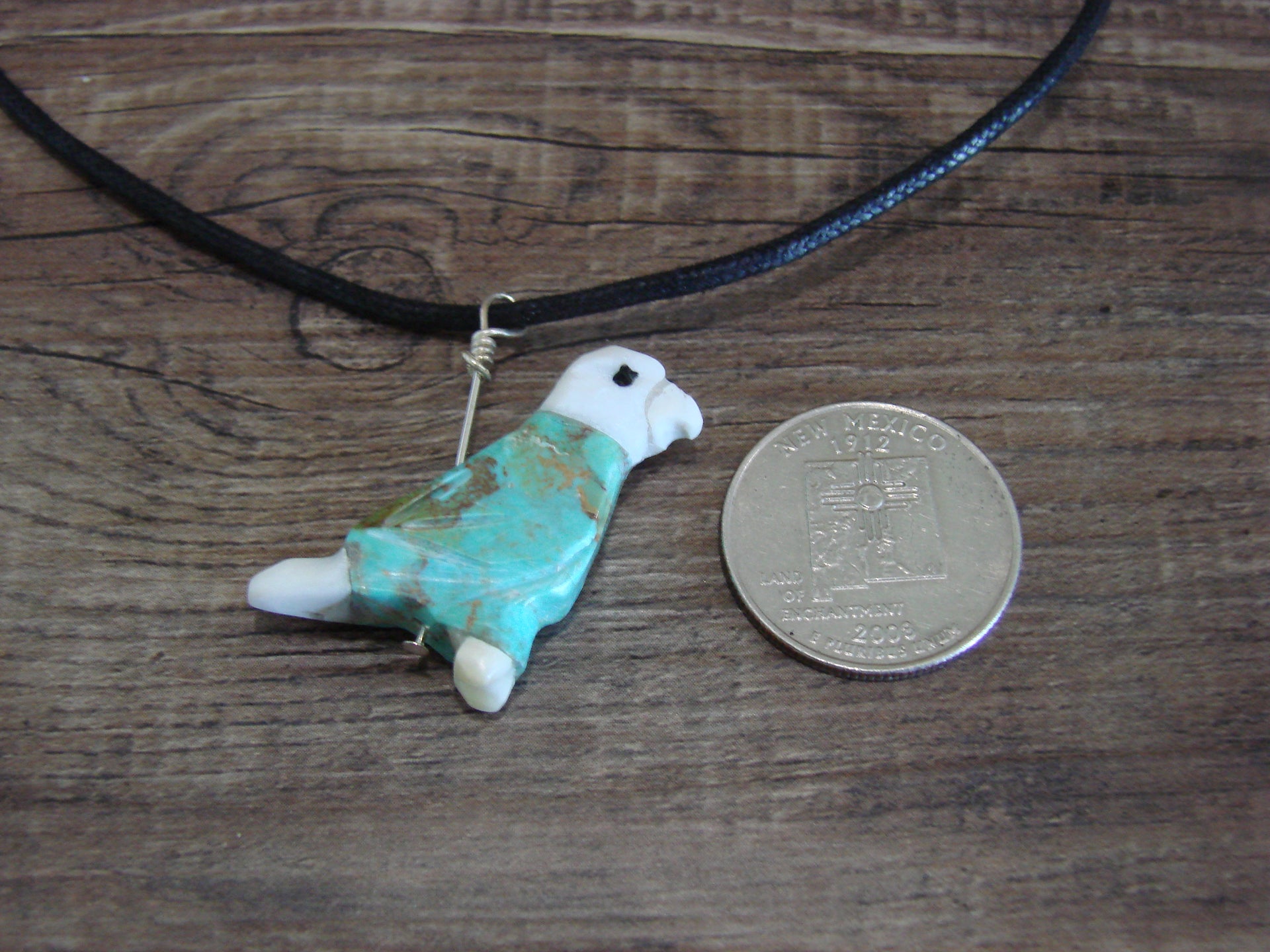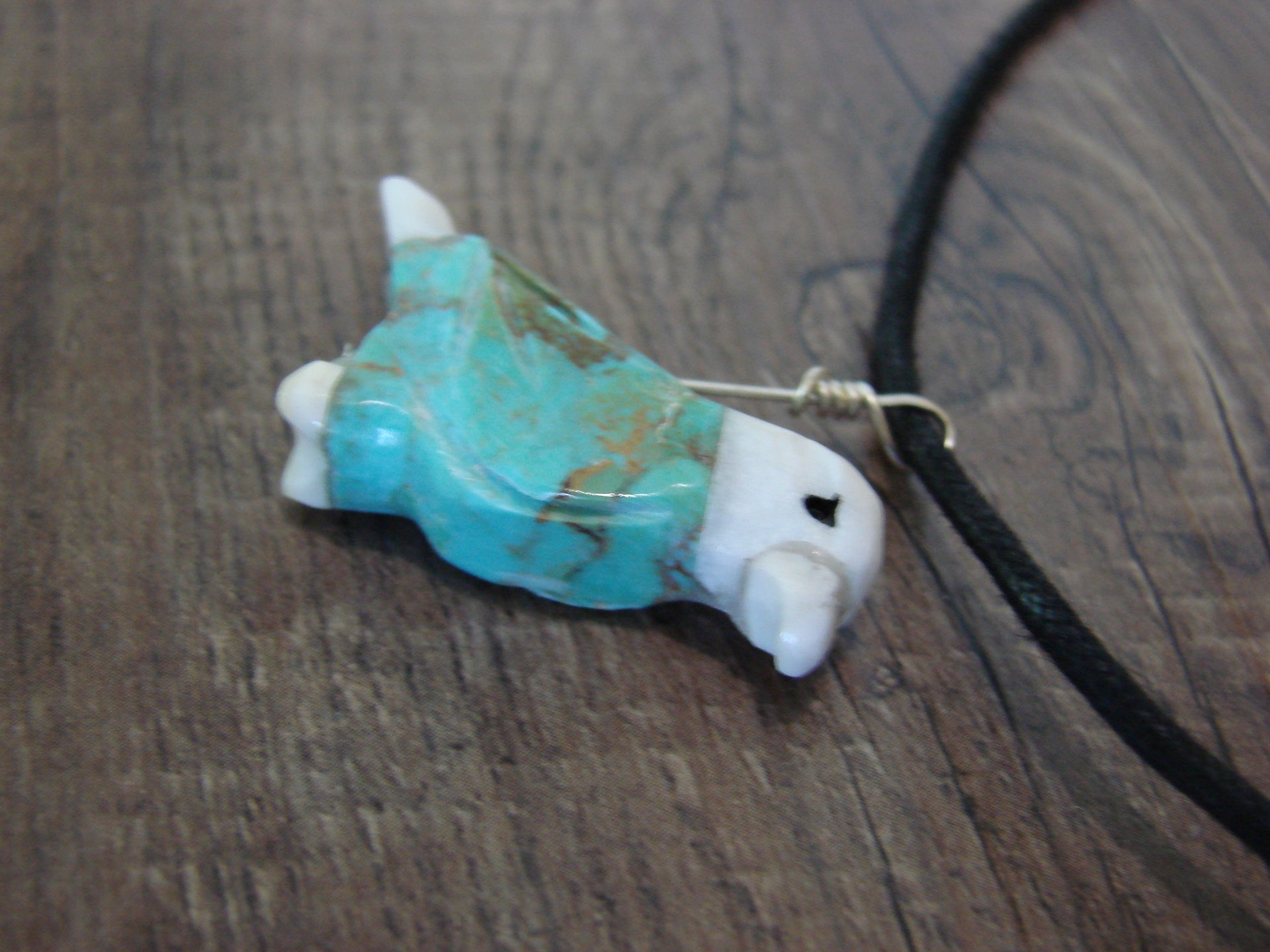 Hand Carved Fetish Necklace from New Mexico. This necklace features a beautifully hand carved Turquoise and White Marble Eagle. This Eagle is nicely carved and centered on a rope style necklace. The Rope is adjusted in length. This is a great necklace! Free shipping and gift box included! Handmade by Matt Mitchell, although Matt is non-Native American his carving work is some of the best around.
