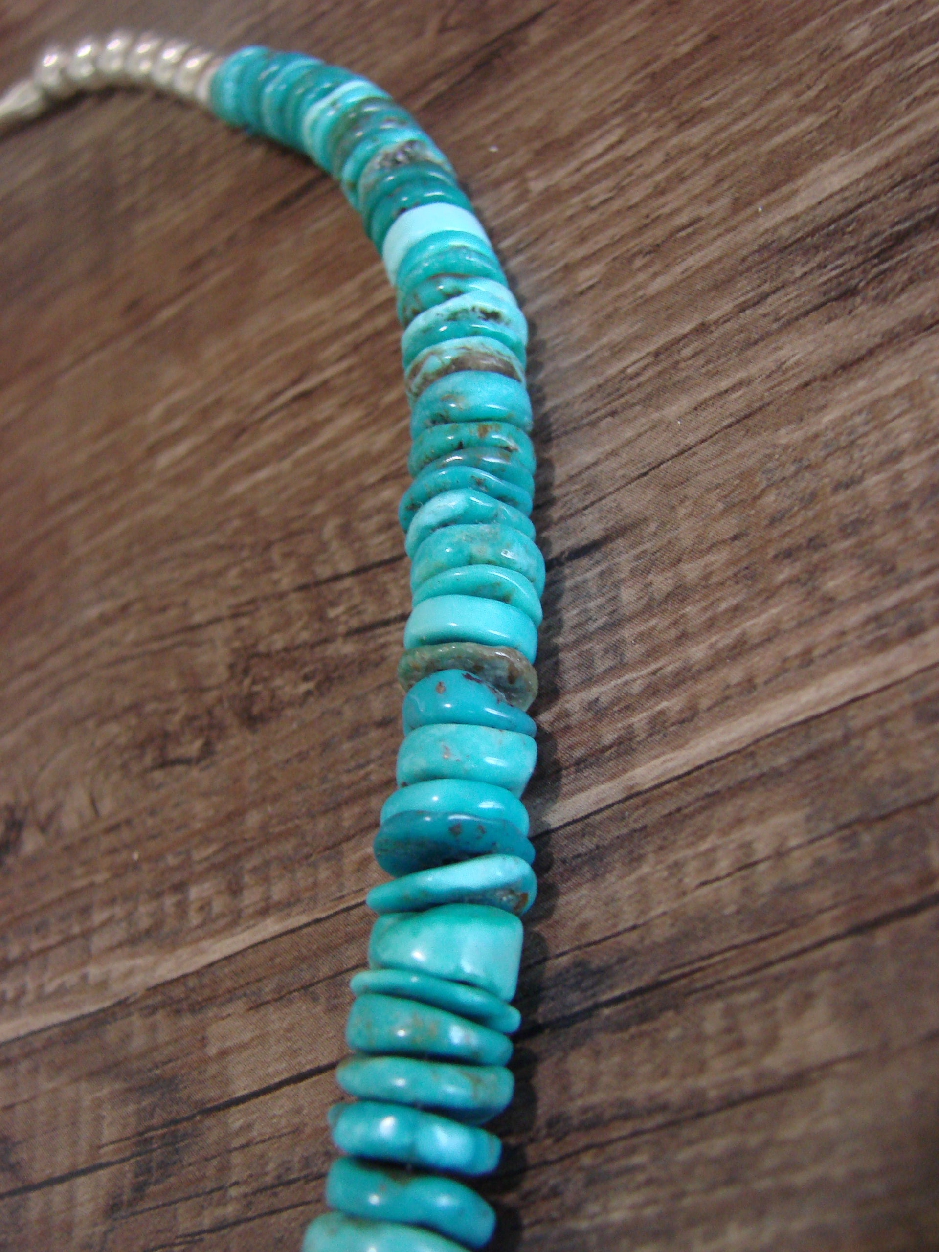 Native American Navajo Indian Hand Strung Graduated Turquoise & Sterling Silver Necklace from Western New Mexico. This necklace features polished and hand drilled genuine Royal Blue Rondelle Turquoise 1/4"-5/8" Stones. The necklace is topped with a sterling silver hook and eye loop closure. Handmade to Perfection, this is a Gorgeous necklace! Fine Navajo Silversmith workmanship quality makes this necklace a beautiful hand made masterpiece! Handmade by Navajo Silversmith Isabelle John. Unsigned. Free shipping and gift box included!