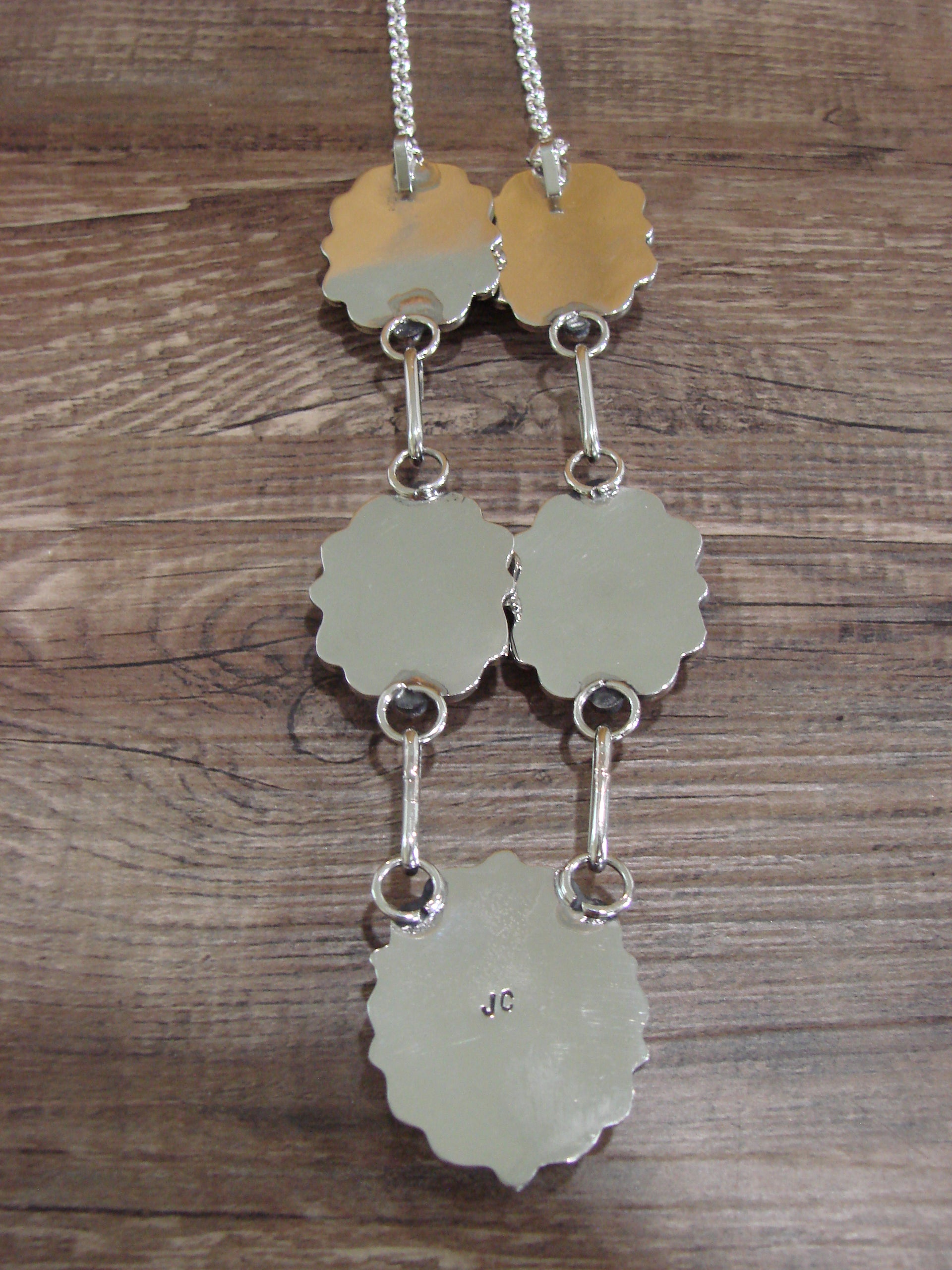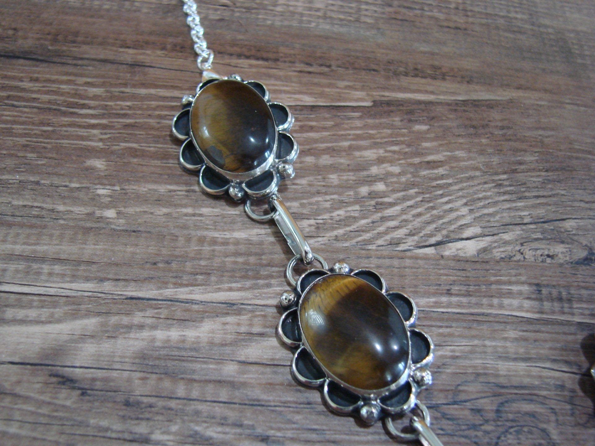 Native American Navajo Indian Nickel Silver & Tiger Eye Chain Link Necklace. This Stunning Hand Made necklace features Tiger Eye Stones intricately set into smooth Nickel Silver bezel settings. Beautiful details in Nickel Silver surround the stones. This is a great necklace that can be adjusted to desired length with the Hade Made Sterling Silver links! This is a great combination of both Nickel Silver & Sterling Silver (Chain). Handmade by Navajo silversmith Jackie Cleveland. Signed "JC" on the back. Free gift box and shipping included!